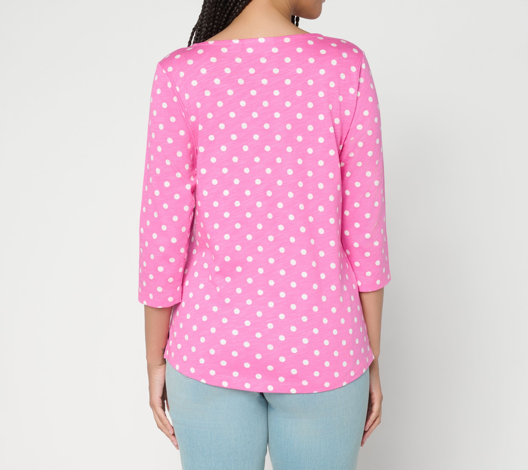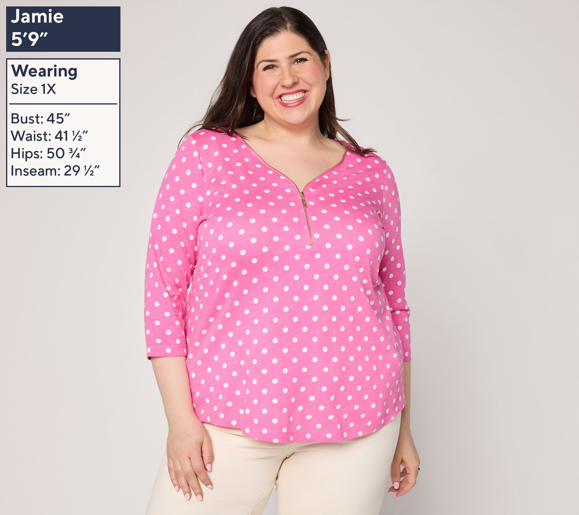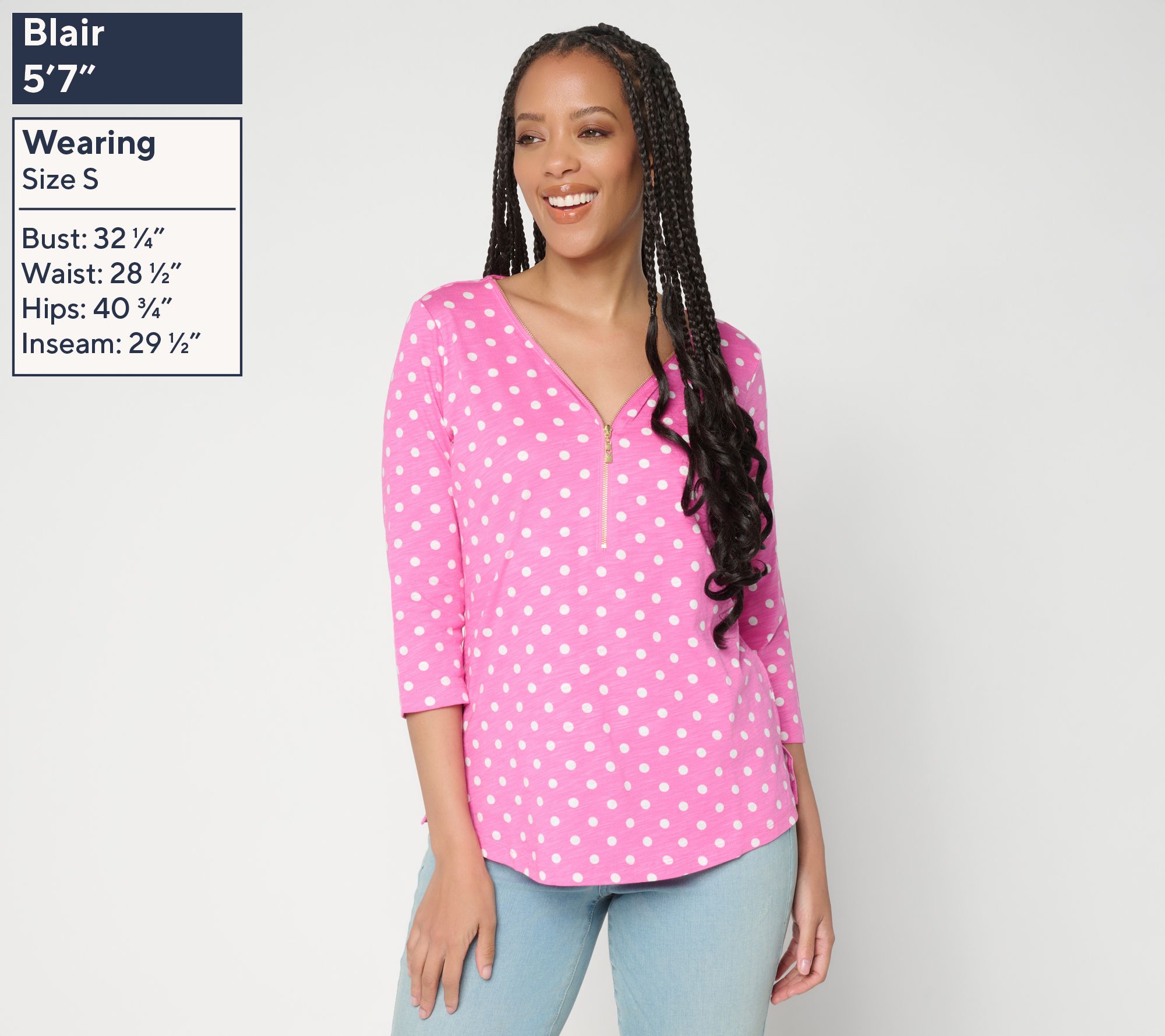 Popping with personality, this knit top is splashed with a playful polka dot pattern. Whether heading out for errands or meeting friends for lunch, it pairs fun style with everyday comfort. The zip-front detail and 3/4-length sleeves make it a toss-on essential for layering or standing out on its own. From Belle by Kim Gravel.