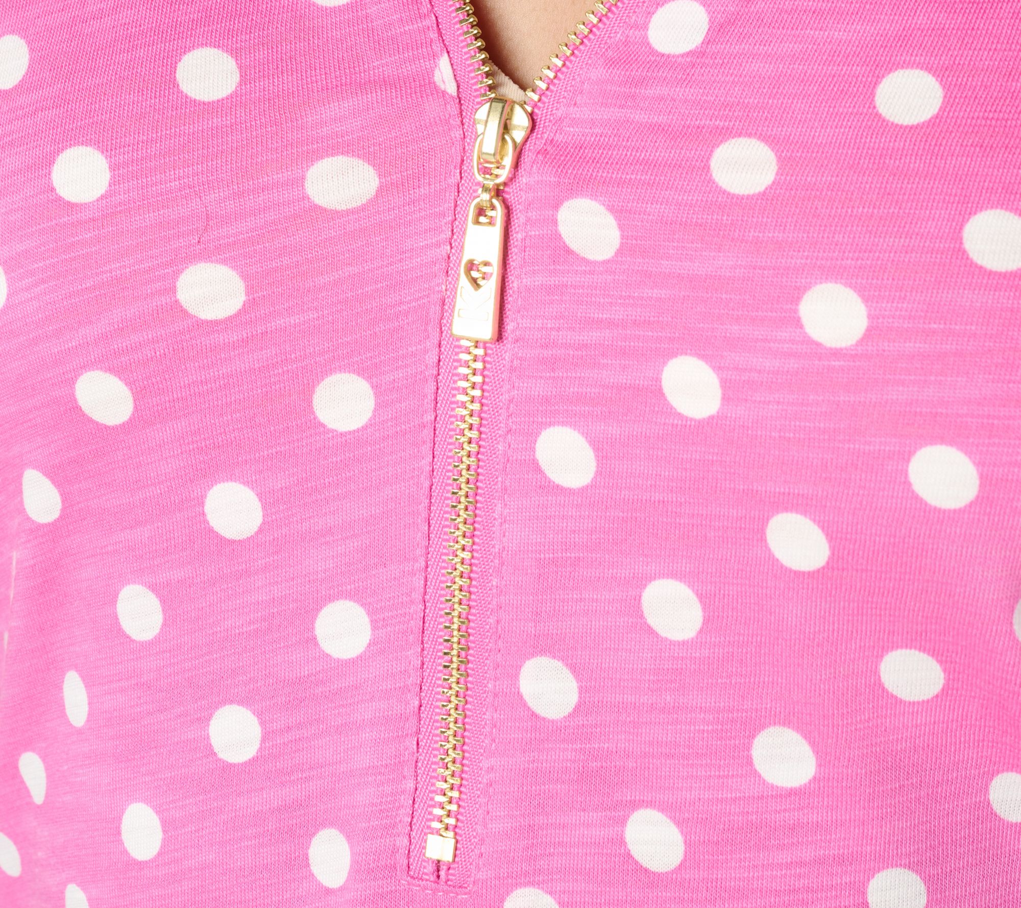 Features: zip-front detail, 3/4-length sleeves, shirt tail hem with side slits, polka dot pattern
