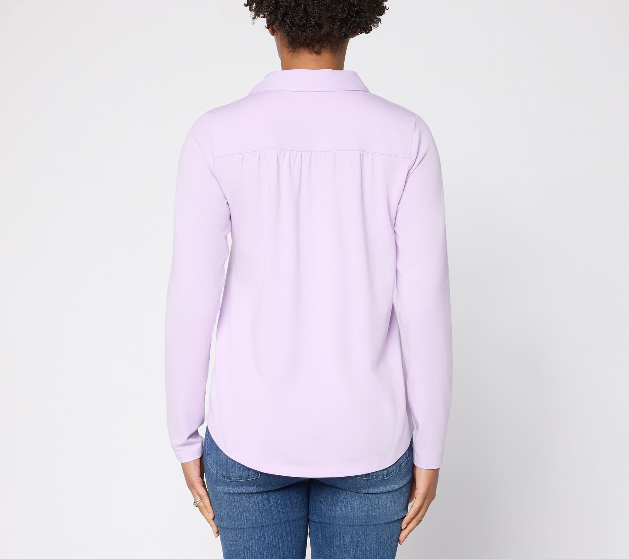 Features: Johnny collar, long sleeves, ruching under front and back yoke, shirttail hem