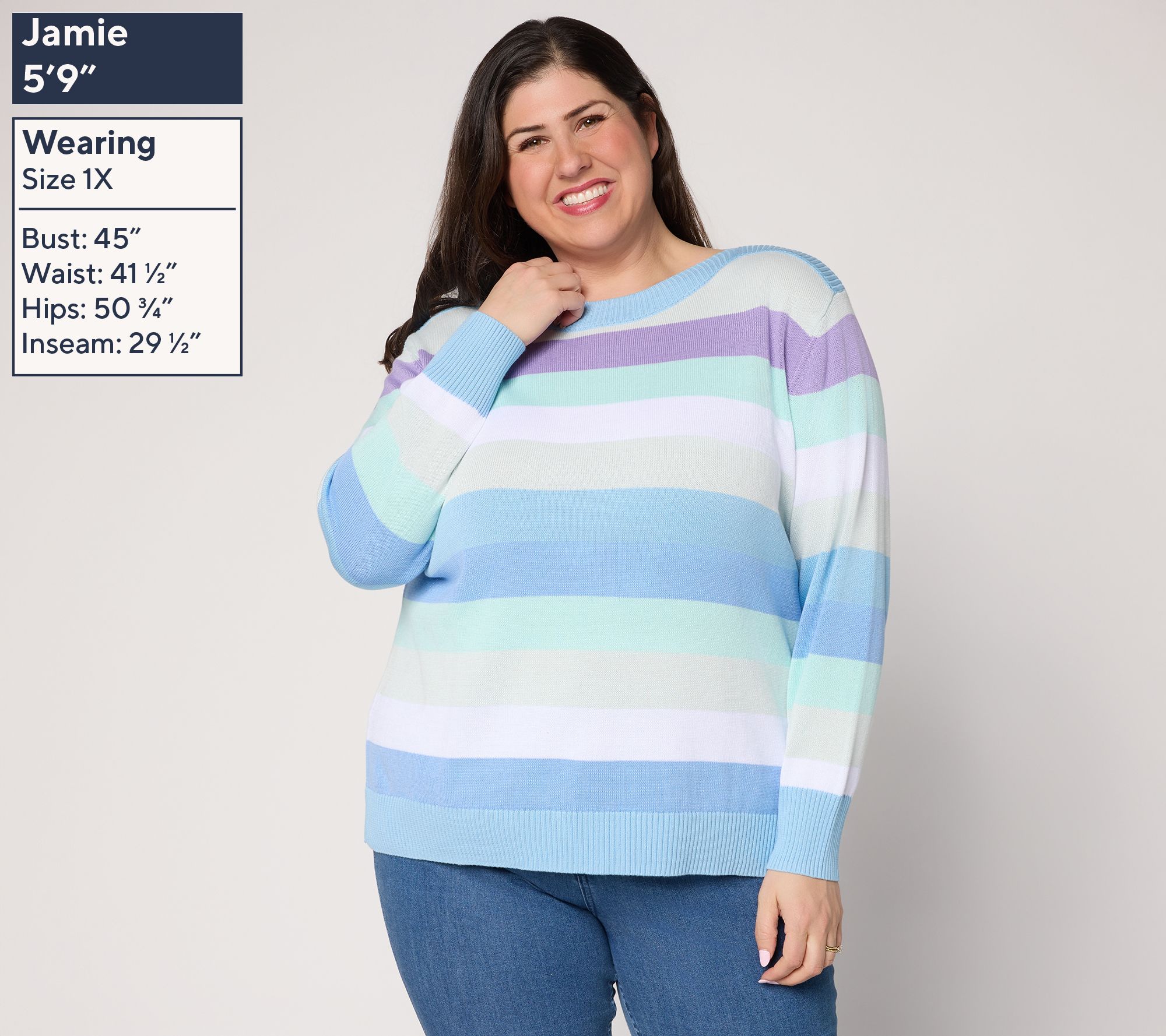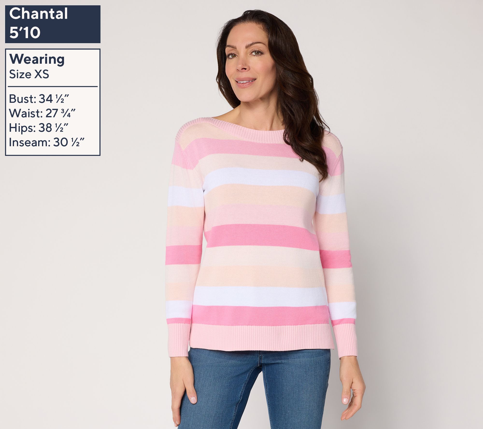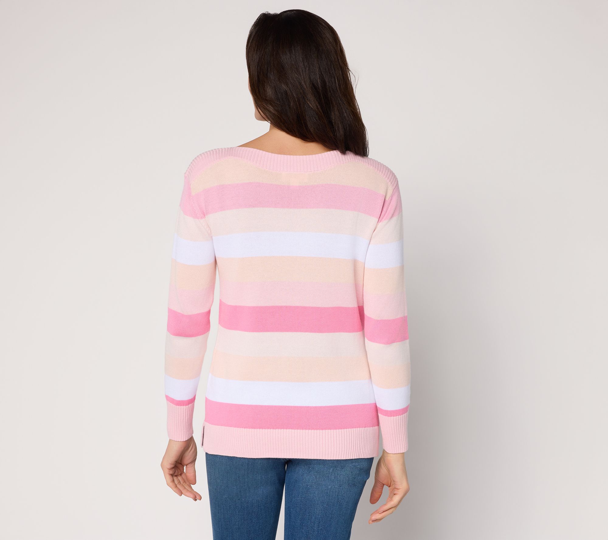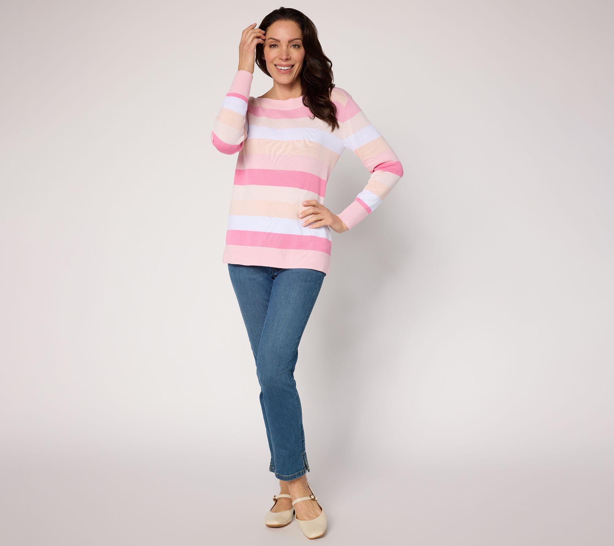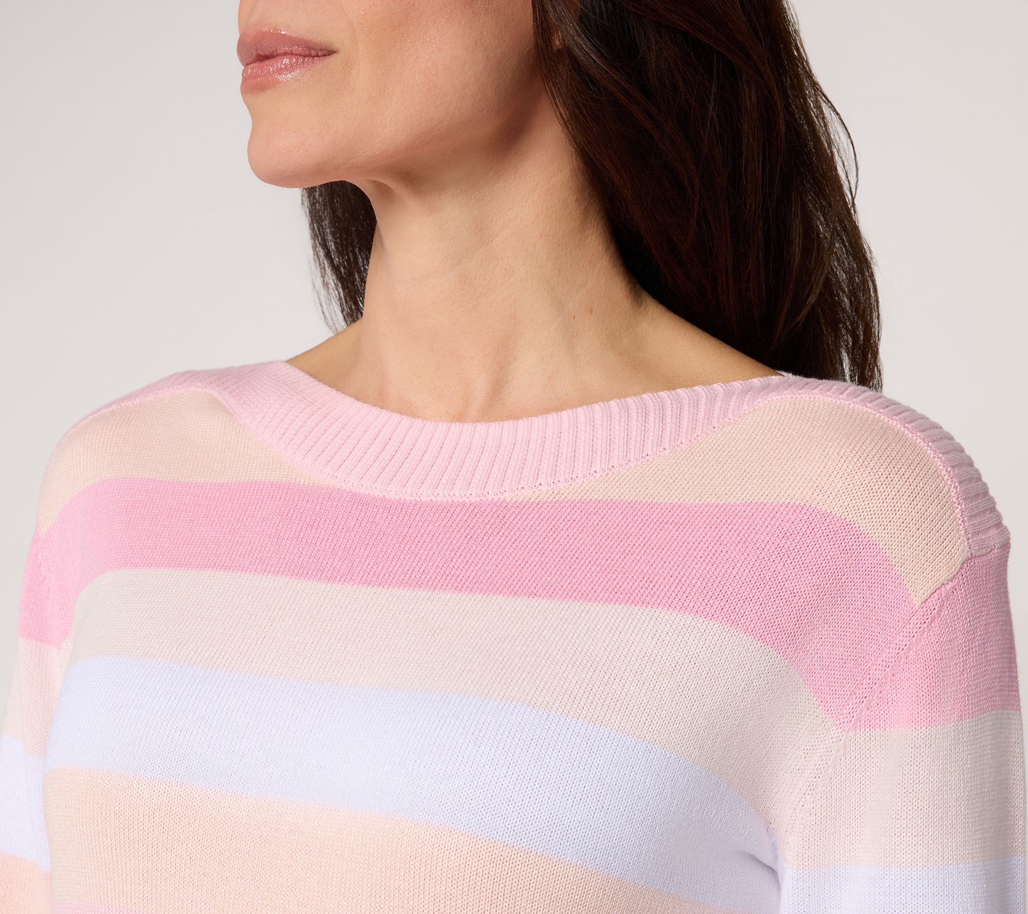 Chilly office days and after-hours gatherings call for a softly striped sweater that brings quiet luxury to denim, slacks, or skirts. The bateau neckline flatters, while long sleeves and a ribbed bottom band lend comfort for all-day wear, finished with a straight hem and side slits for extra ease. From Belle by Kim Gravel.