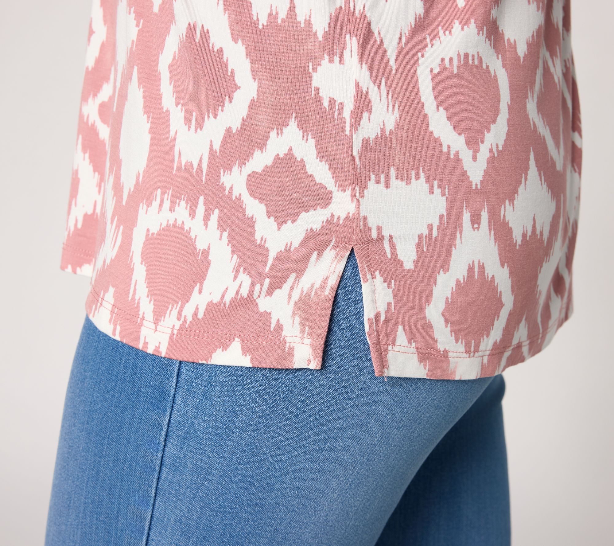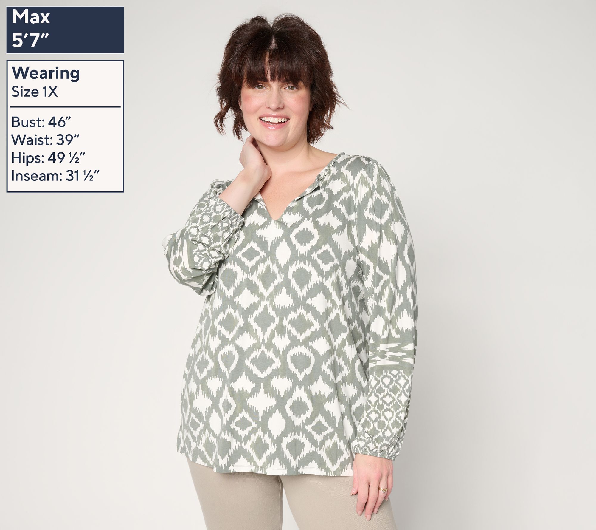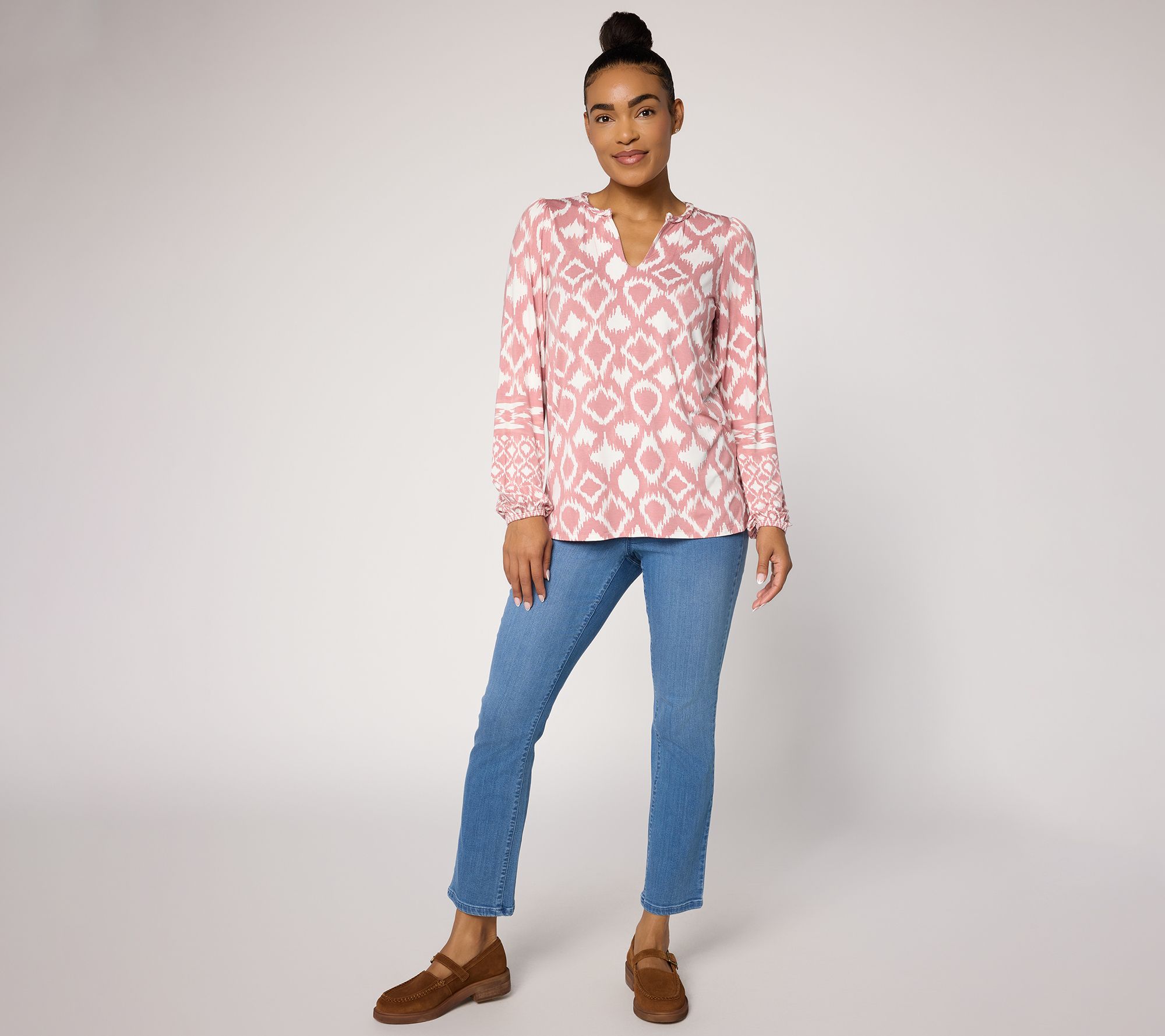 Brighten up your everyday wardrobe with this geometric-print knit top, designed to bring vibrant energy to any casual meet-up or weekday routine. The split neckline, elastic-cuffed long sleeves, and soft, stretch-kissed fabric keep comfort and style in harmony, whether you're pairing it with jeans or layering under a blazer. From Belle by Kim Gravel.