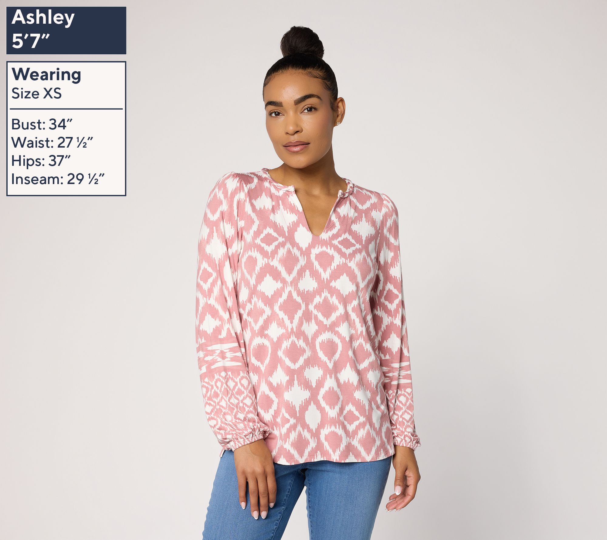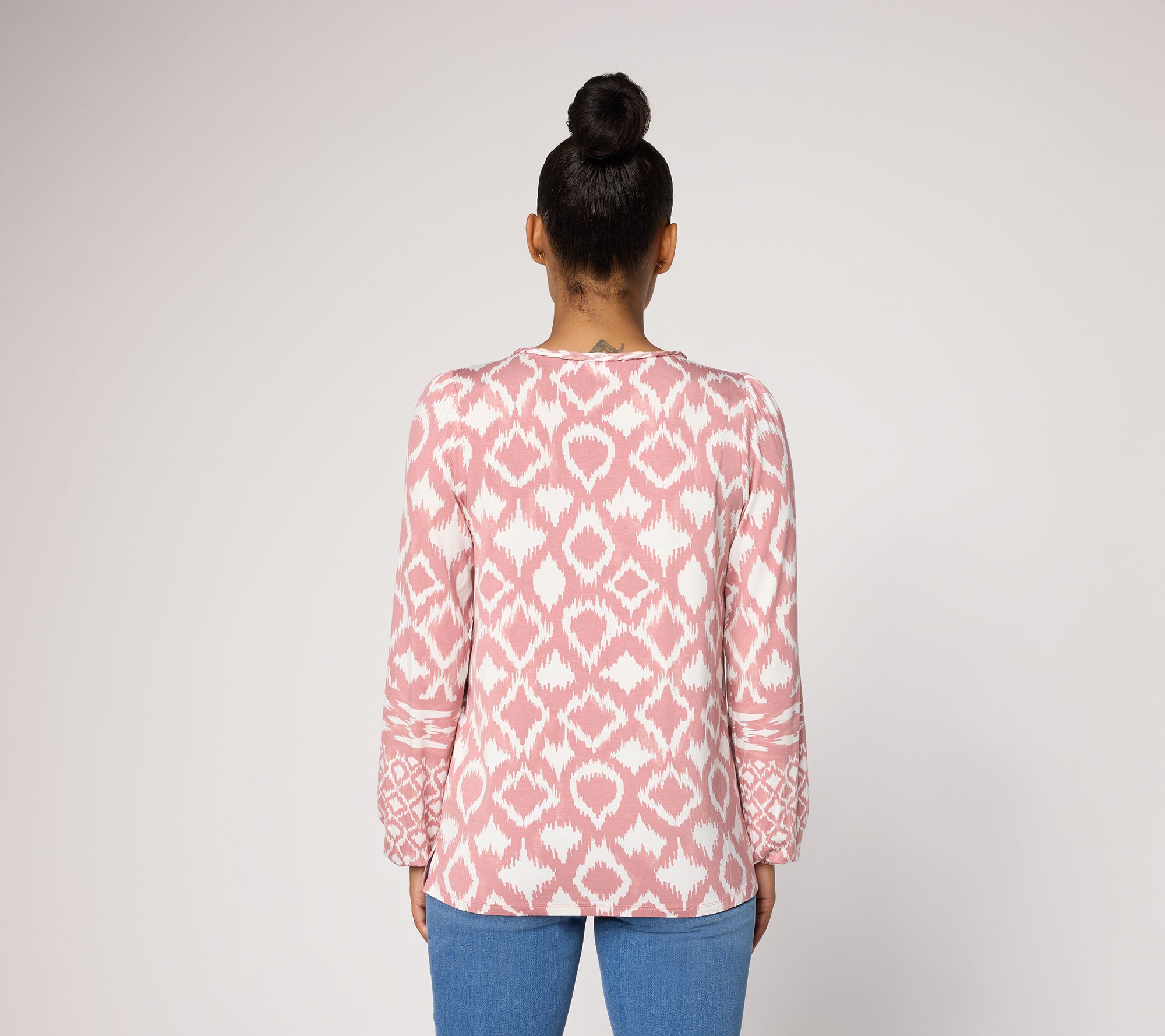 Features: split neckline, long sleeves, elastic cuffs, shirttail hem, dyed geometric print
