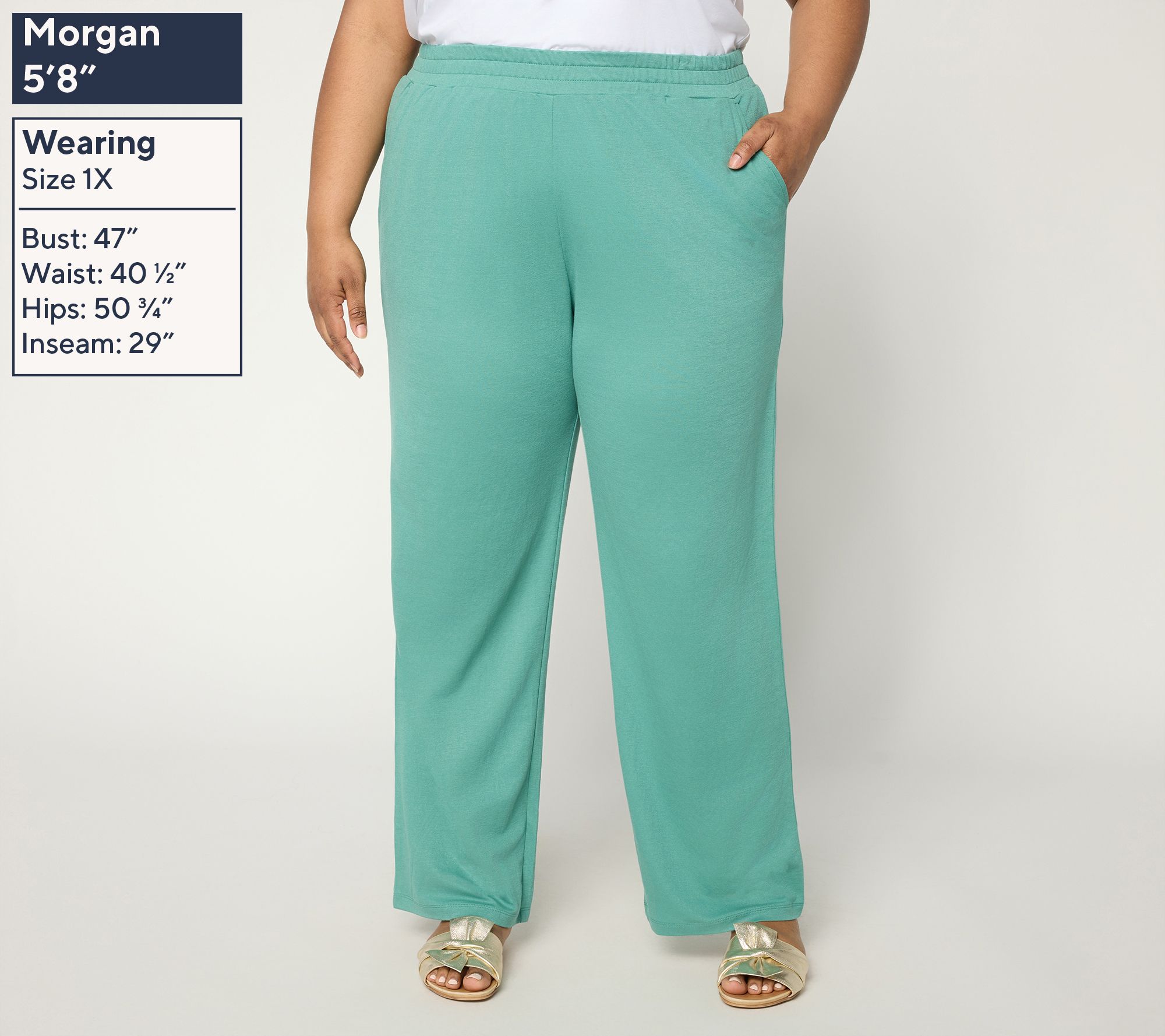 Features: pull-on style, elastic waist, slash pockets, full length