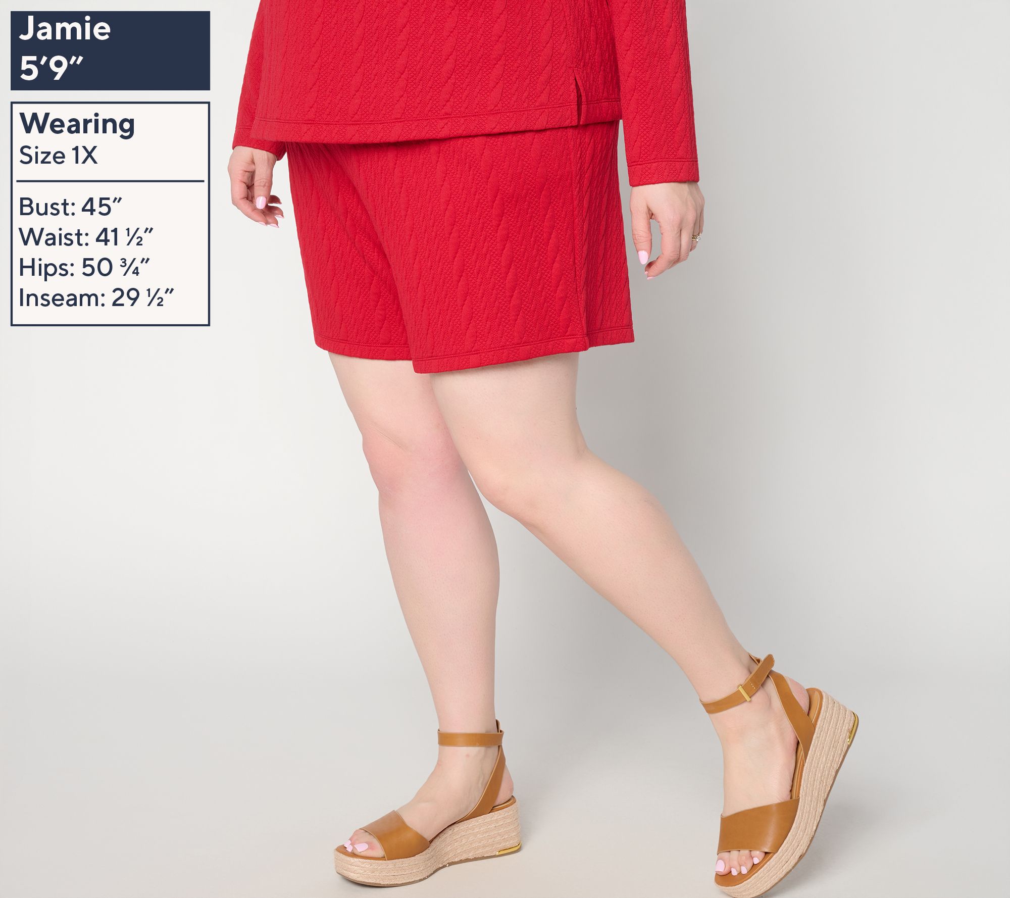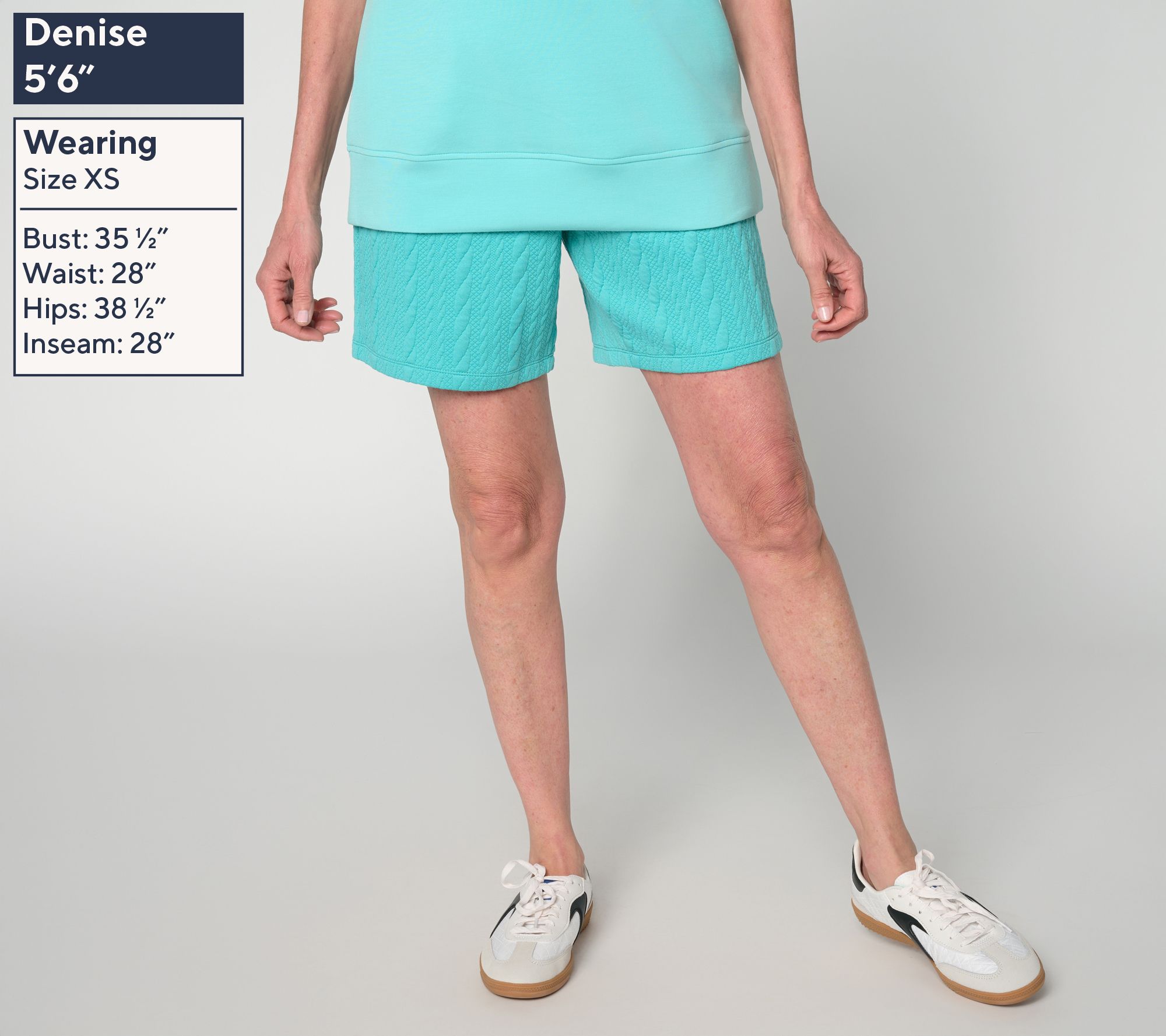 Cozy shorts? These Cable Chic shorts sure are! A textured knit with a sprinkle of stretch make them a must-have for warm-weather moments. Pull them on and pair with your favorite tee and sandals or sneaks for a slightly nautical aesthetic. From Belle by Kim Gravel.