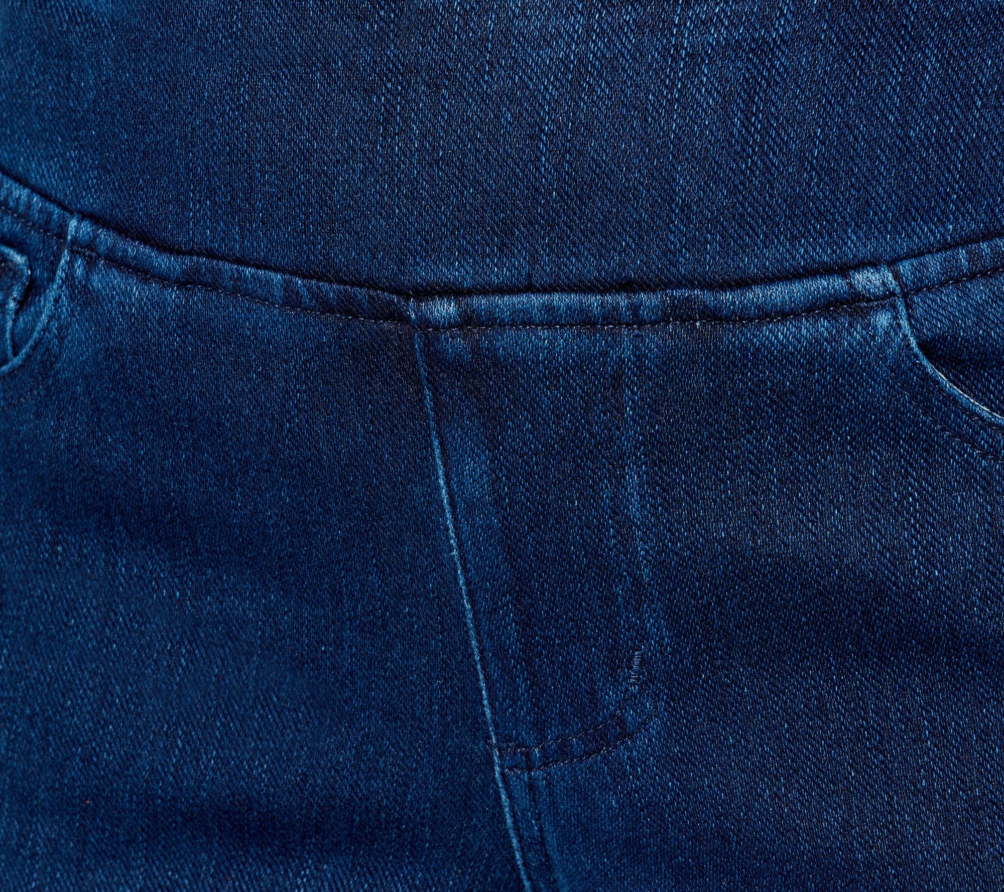 • Features: pull-on elastic waistband, faux button front, five-pocket styling including coin pocket, back yoke