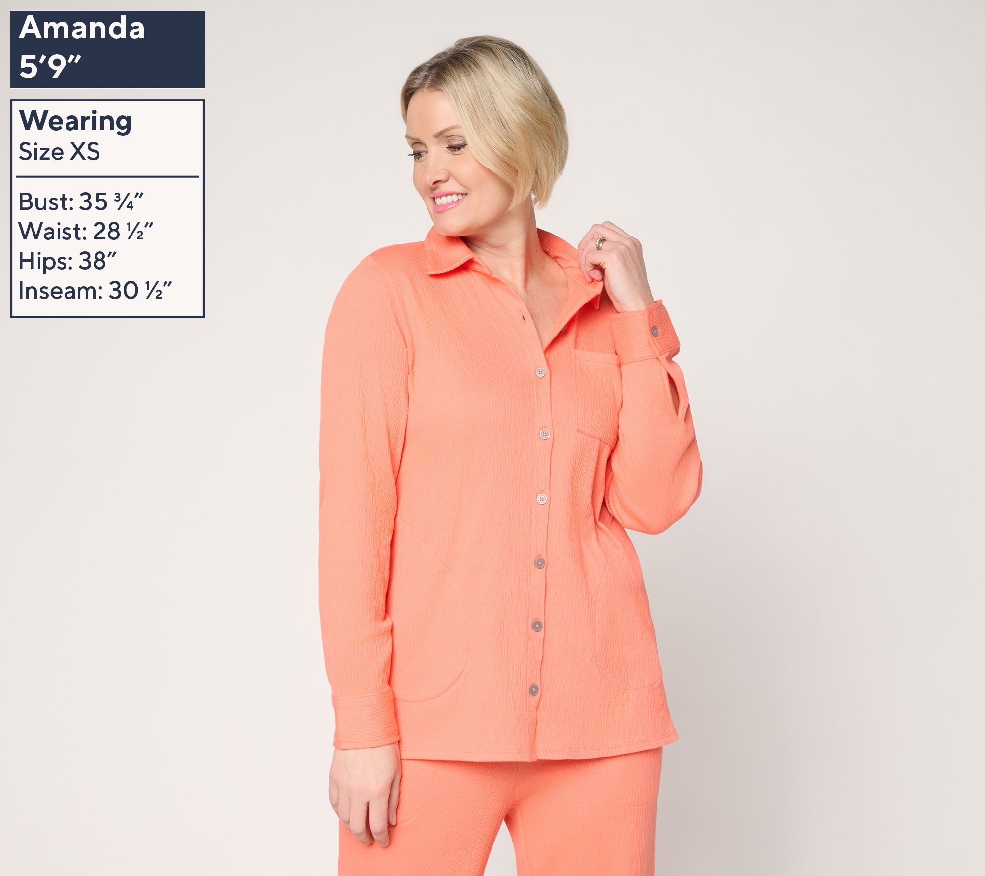 Treat yourself to effortless style for weekend getaways or casual Fridays at the office with this relaxed-fit knit shirt. Long sleeves and handy chest and side seam pockets offer all-day comfort, while the button-front design and tailored shirt collar keep your look polished yet laid-back. From Belle by Kim Gravel.