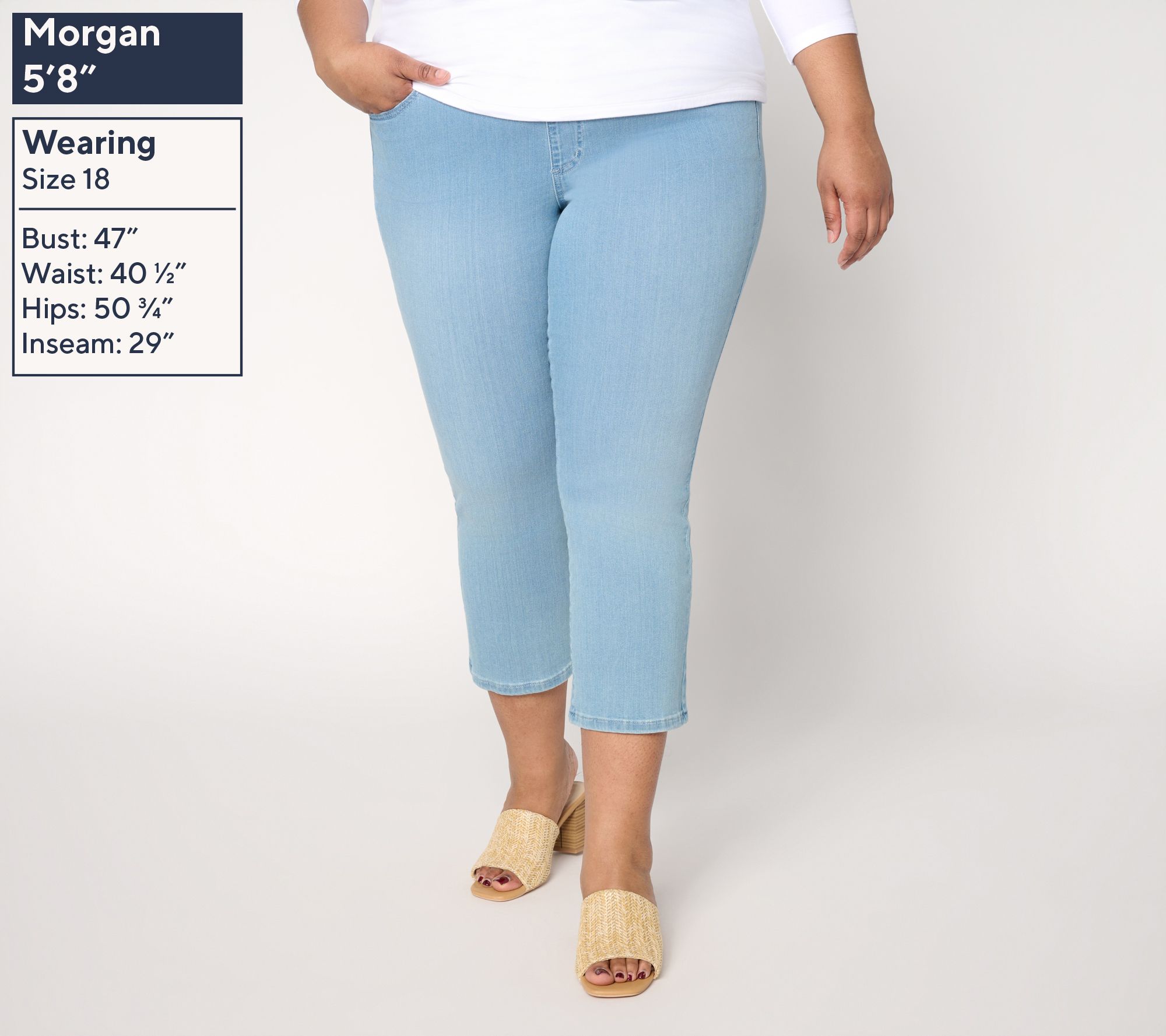 Features: five-pocket styling, pull-on, center back seam, slit detail, crop length