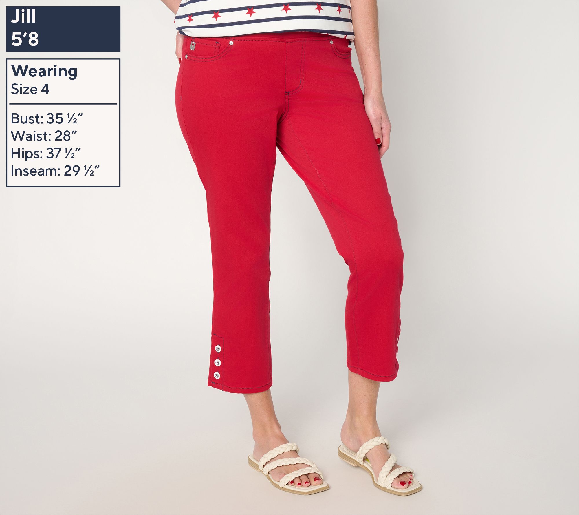 Features: cropped, pull-on style, five pockets, side slits with buttons