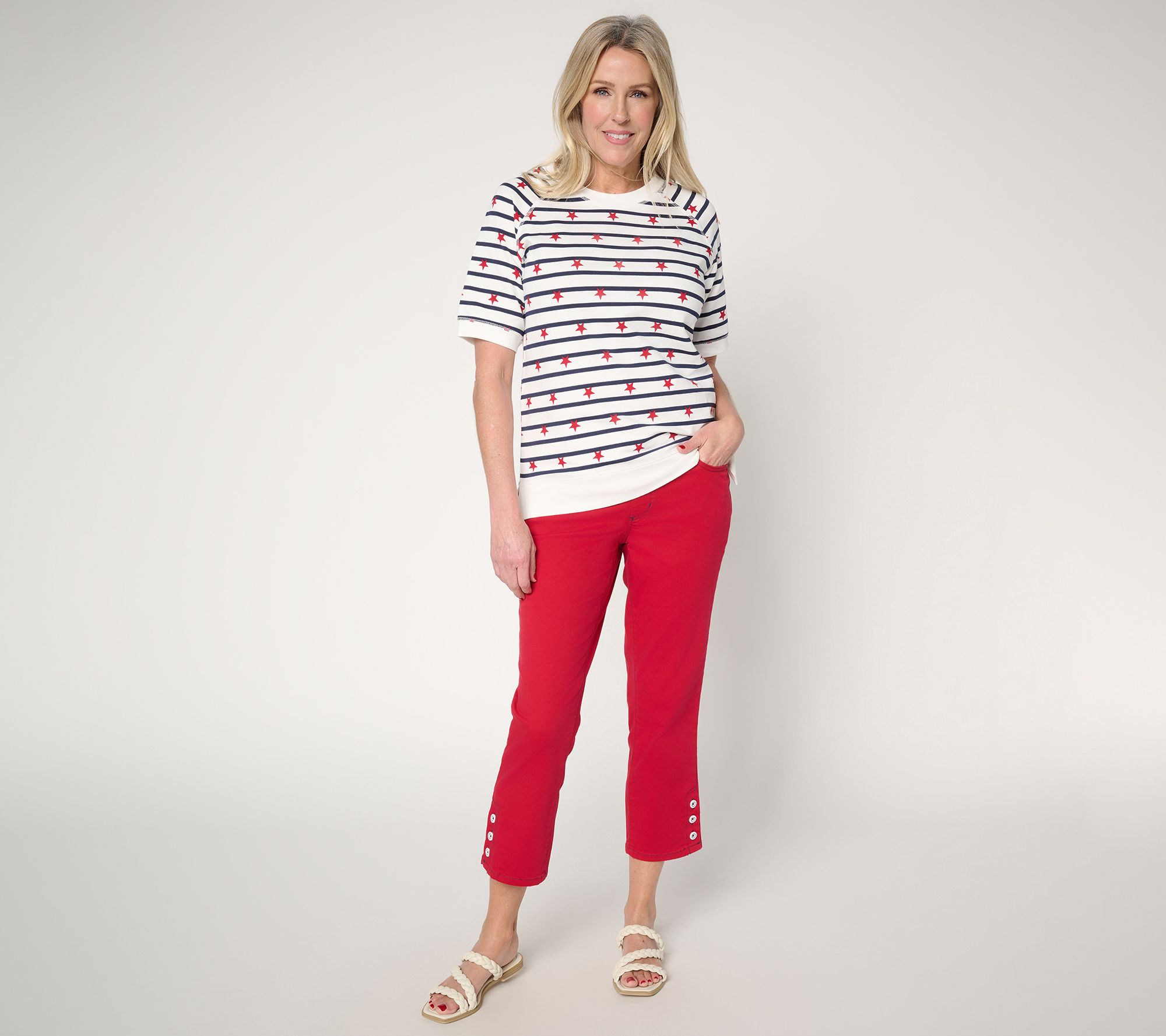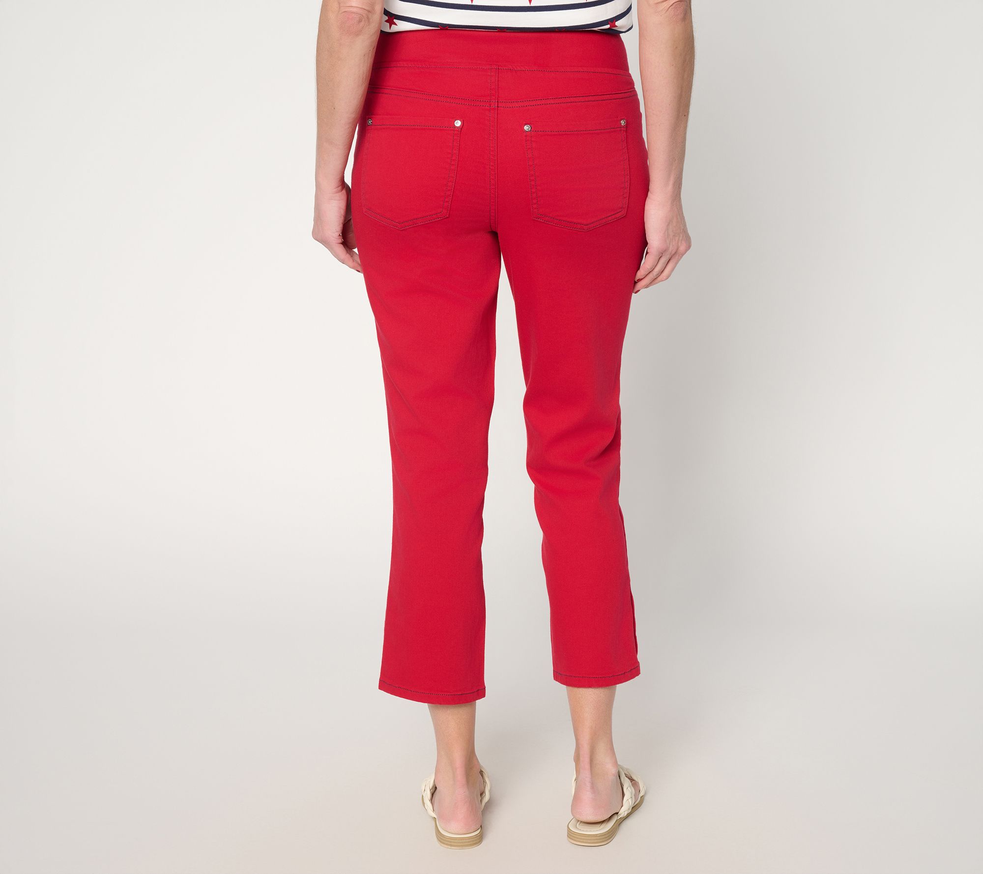 Chic enough for evening plans yet comfortable for afternoon shopping, these cropped straight-leg pants combine easygoing polish with stretch-infused Primabelle twill. The pull-on style, accented by button side slits and five-pocket practicality, pairs easily with sneakers or sandals for any relaxed day out. From Belle by Kim Gravel.