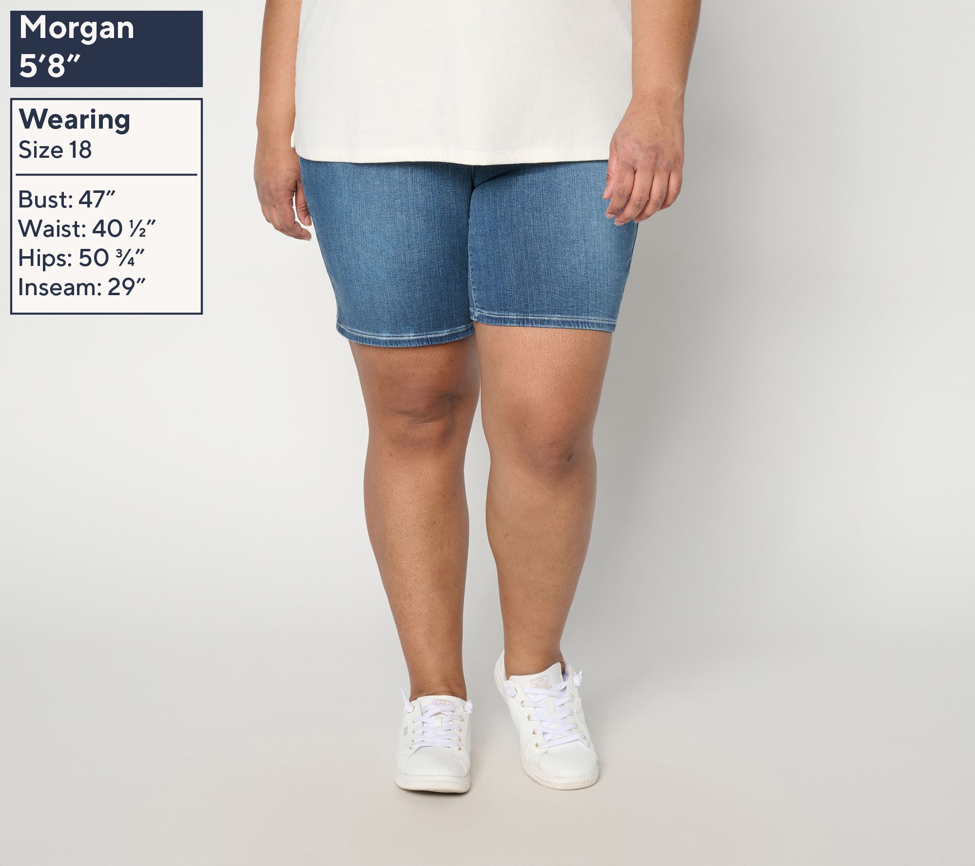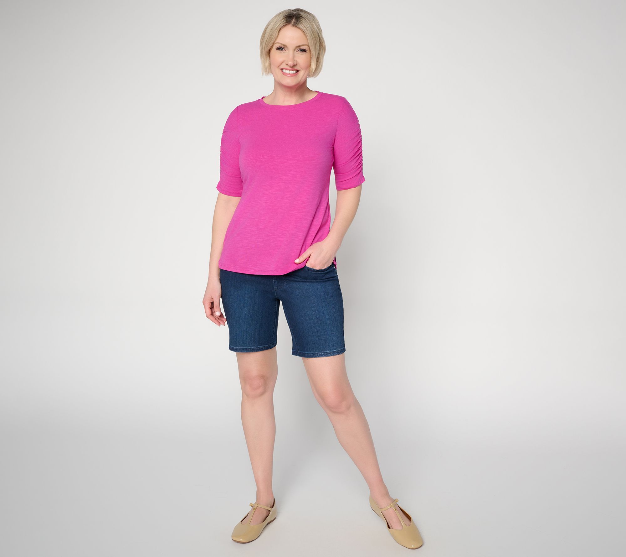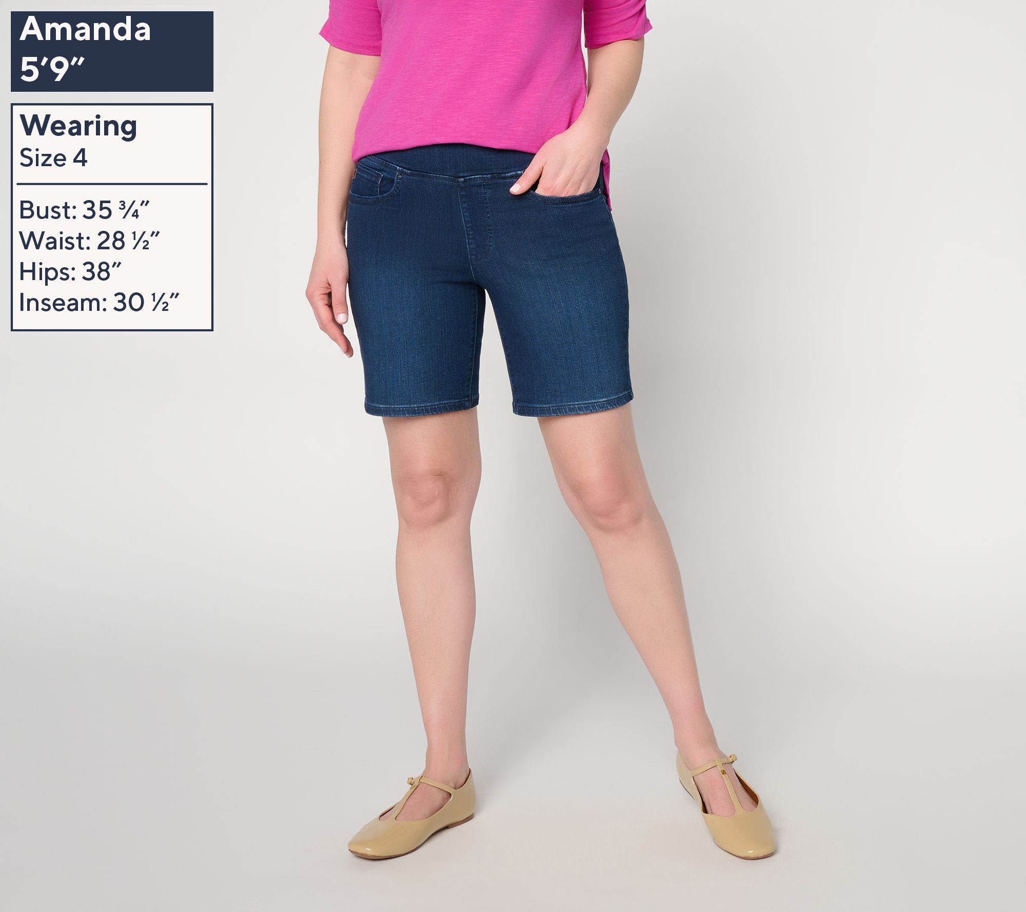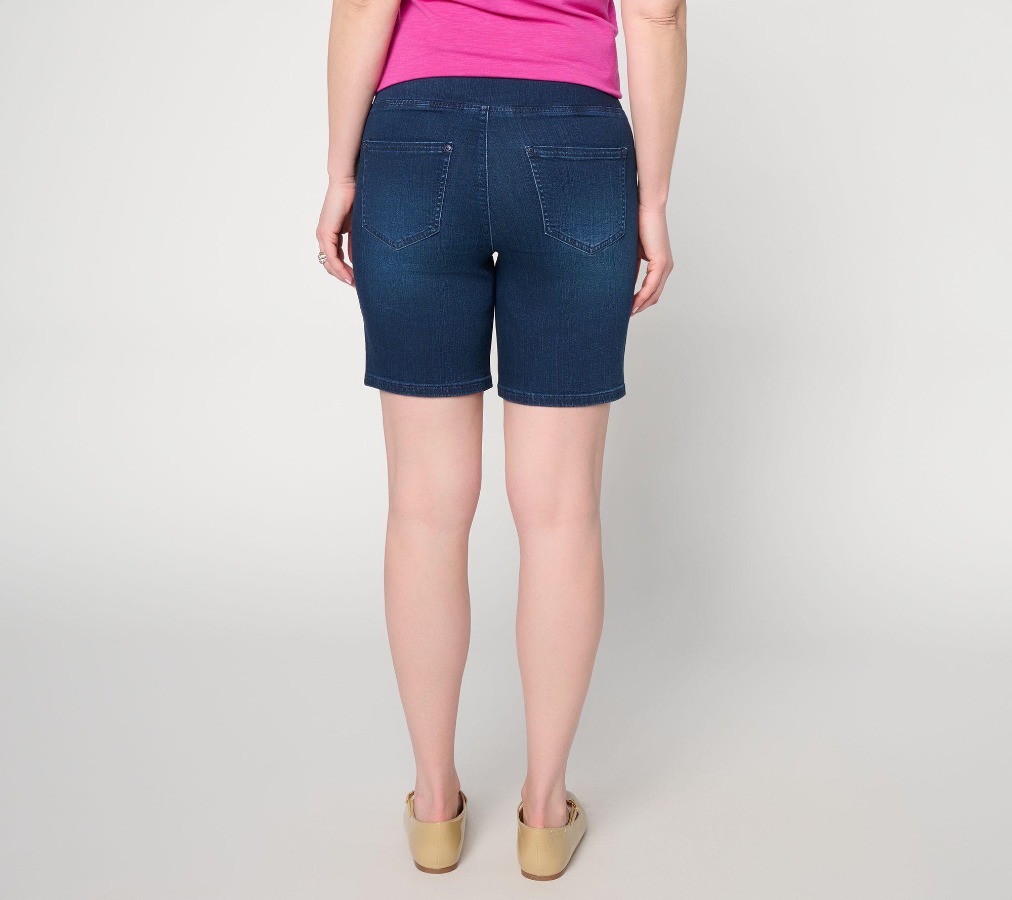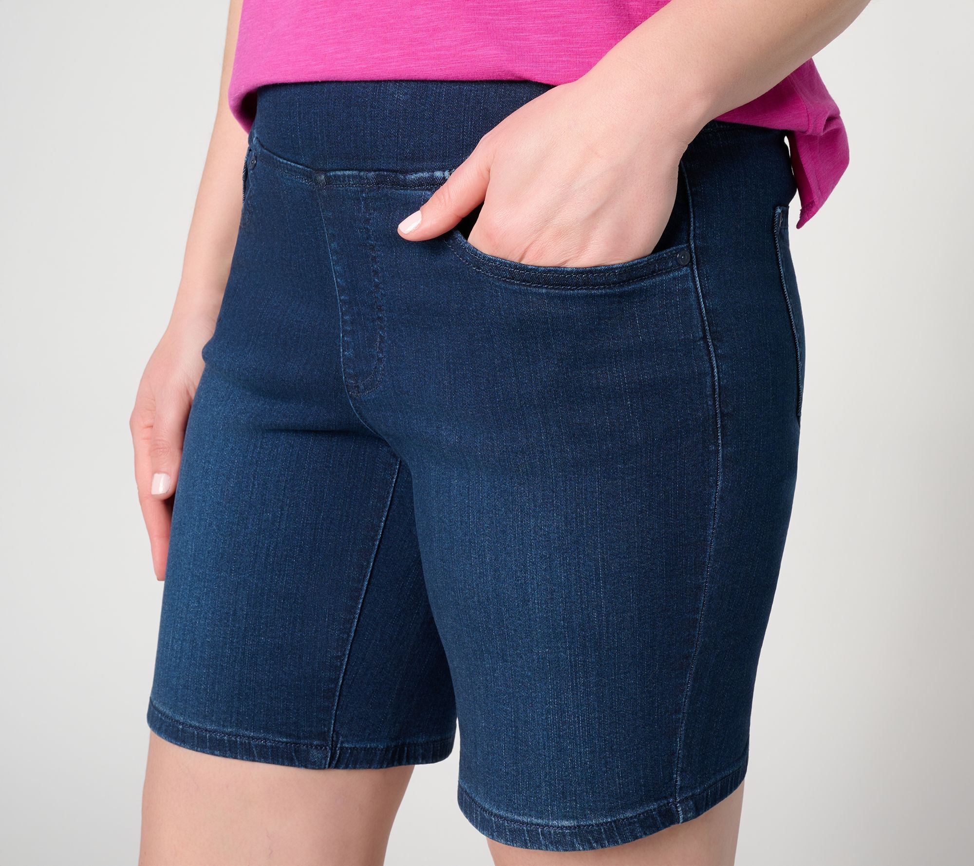 Don't look now, but summer's right around the corner! Get ready for some fun in the sun with these five-pocket shorts that perfectly blend style with comfort -- courtesy of your favorite Belle, Kim Gravel. Luxurious TripleLuxe Denim provides a silky-soft feel with a hint of stretch, while the easy pull-on style creates a smooth look under tops (no button-fly lumps or bumps here). So, if you're tired of shorts being too short/long/tight/loose, you'll be overjoyed when you discover this pair is just right. Now, let's go soak up some of that sunshine, shall we? From Belle by Kim Gravel.