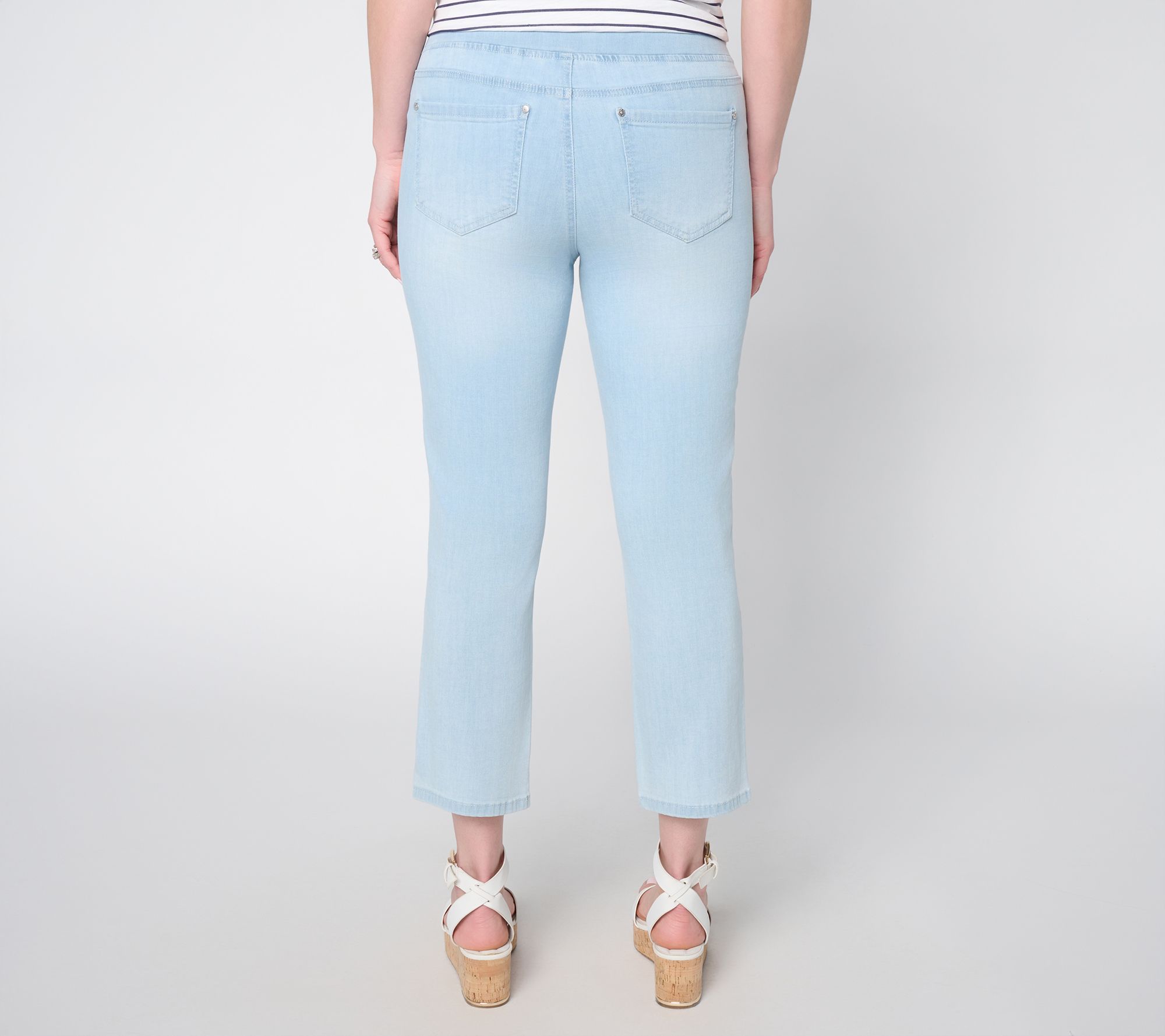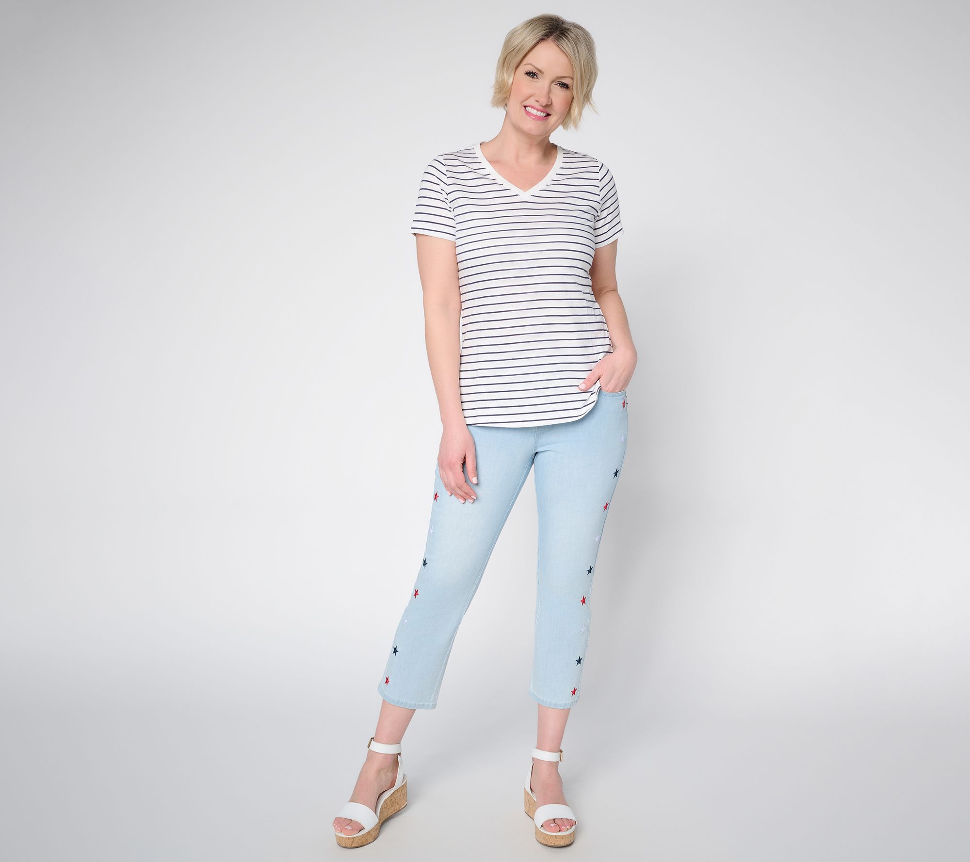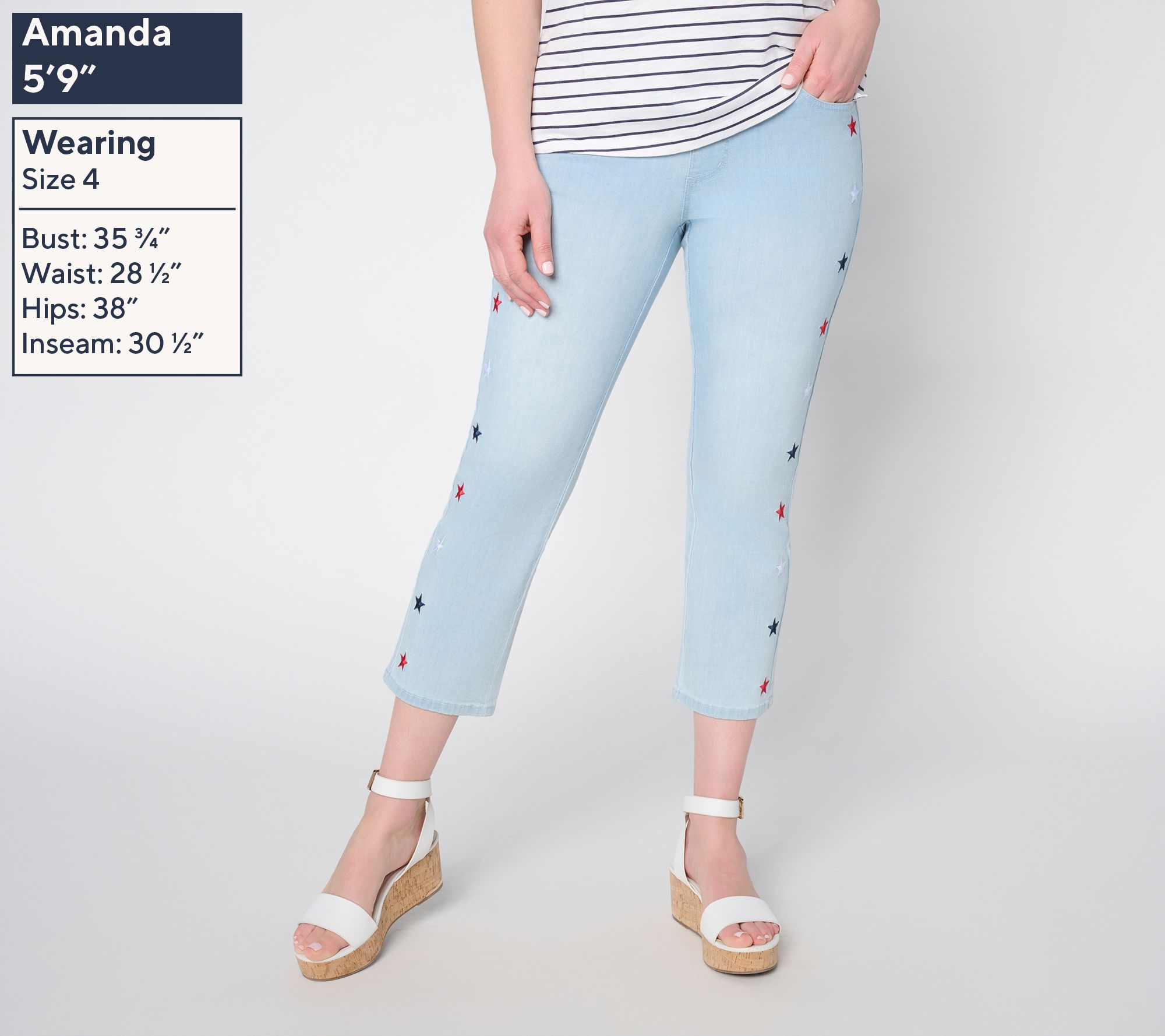 With these cropped jeans, you're the star of the show! The night sky's got nothing on you when you're in comfortable star-studded TripleLuxe denim from Kim Gravel. Classic five-pocket styling and a pull-on waistband offer practical ease, while subtle star detail along the leg outseam brings a festive feel to this foundation. From Belle by Kim Gravel.
