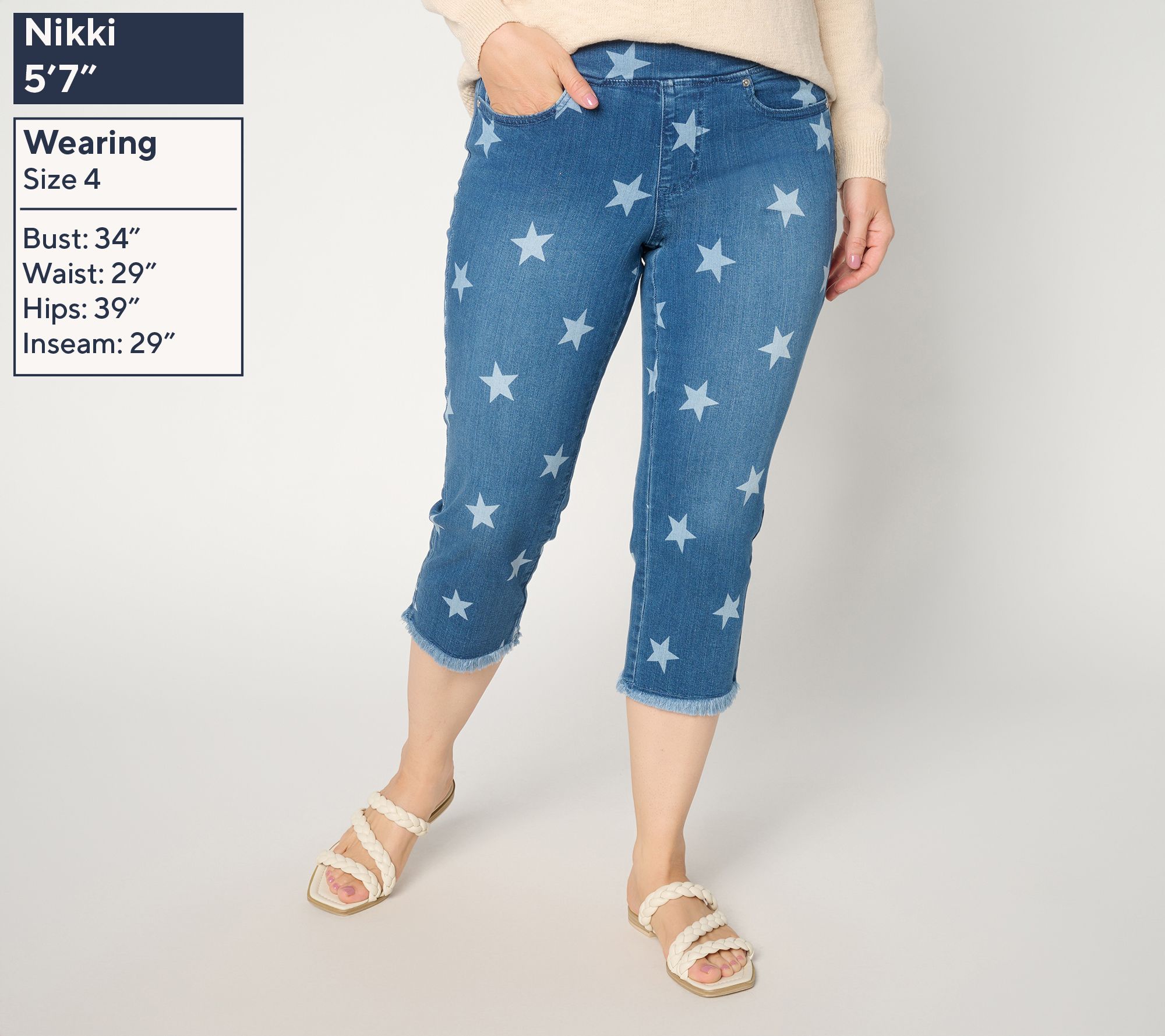 Features: denim, pull-on style, five pockets, frayed hem, star detail, capri length