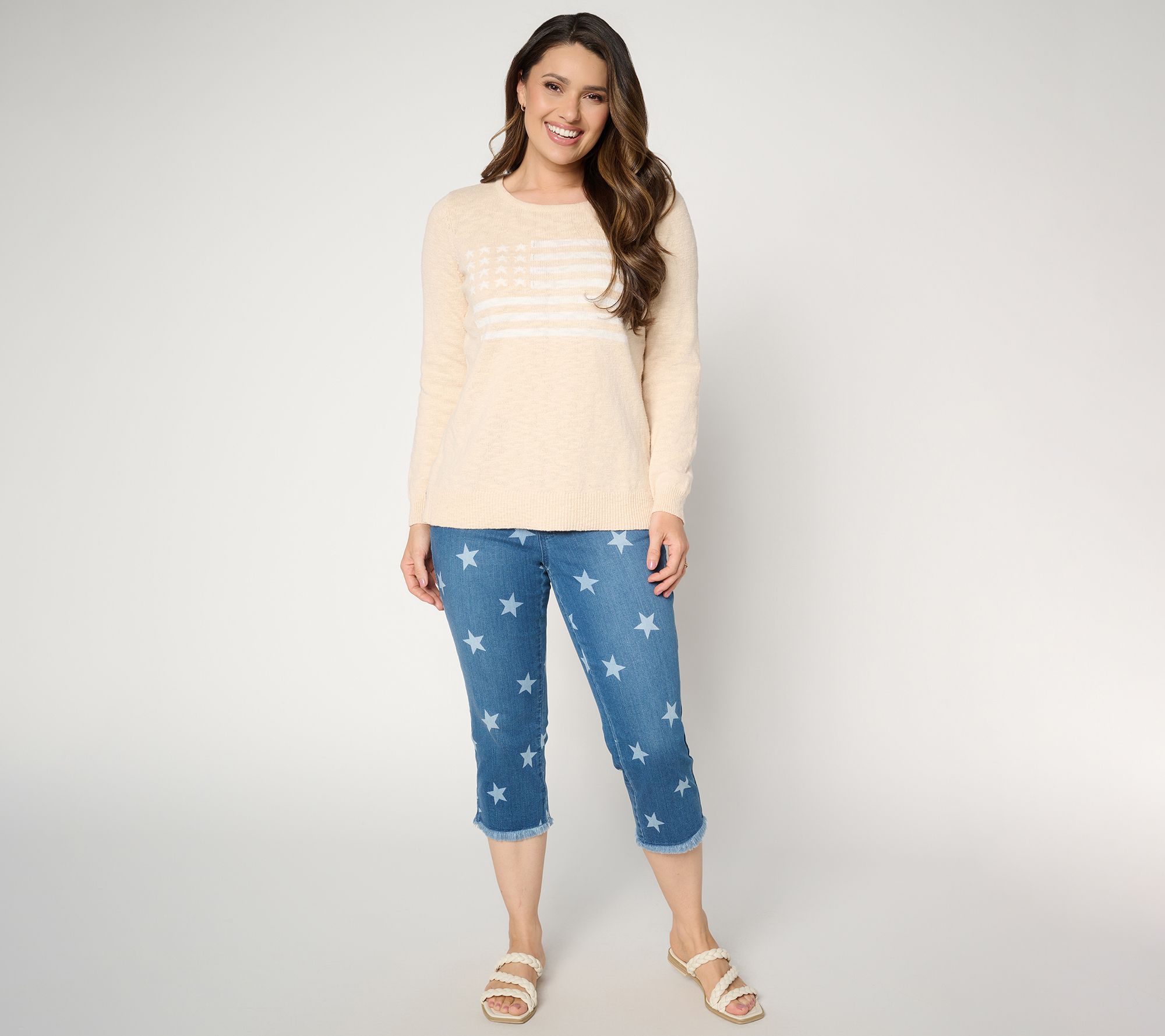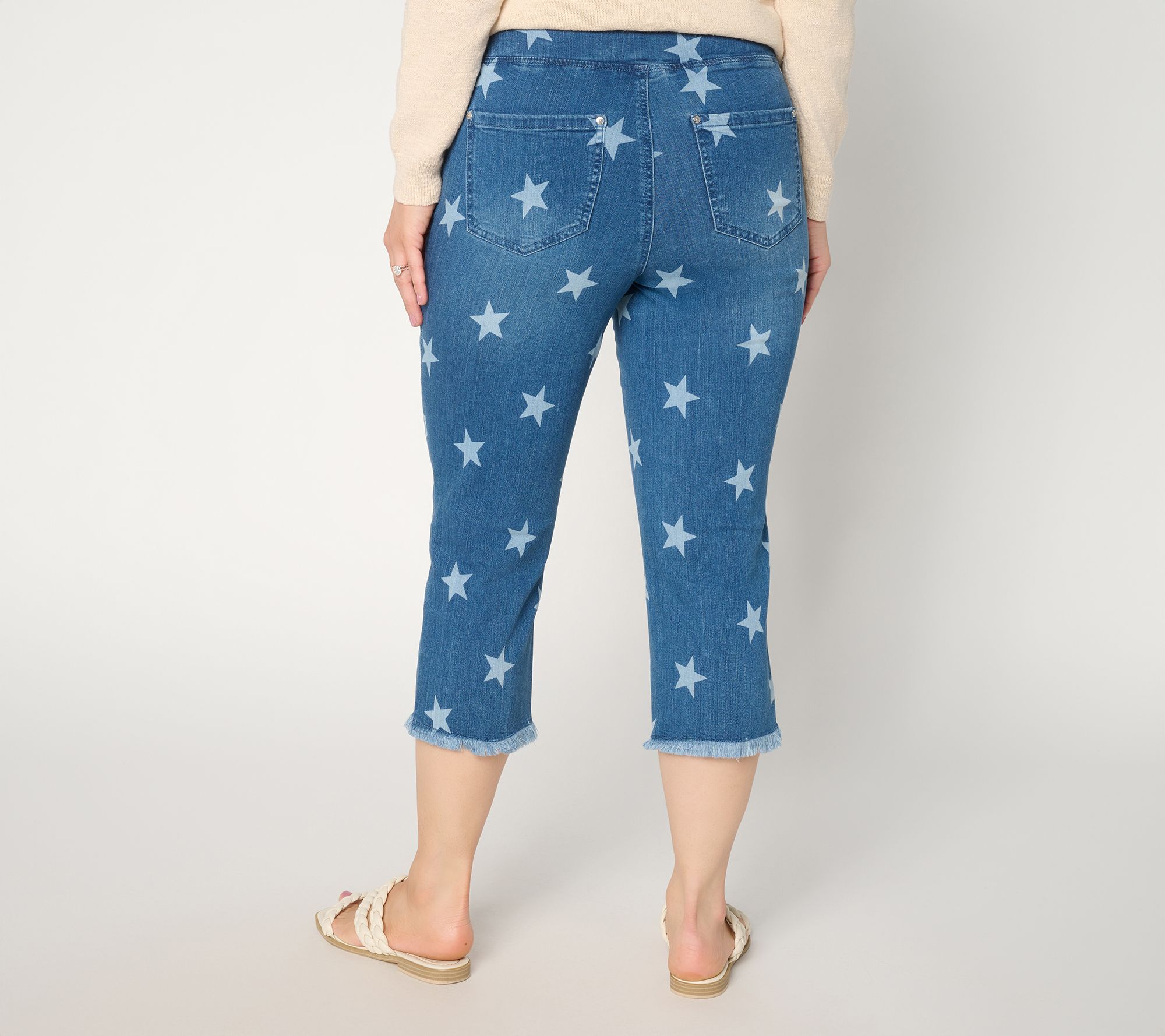 Sun-soaked days are calling -- meet them head on with these straight-leg denim capris from Kim Gravel. Playful frayed hems keep things caszh for laid-back plans -- and the star-studded pattern ensures your personal style shines through from Memorial Day to Labor Day -- and beyond! From Belle by Kim Gravel.