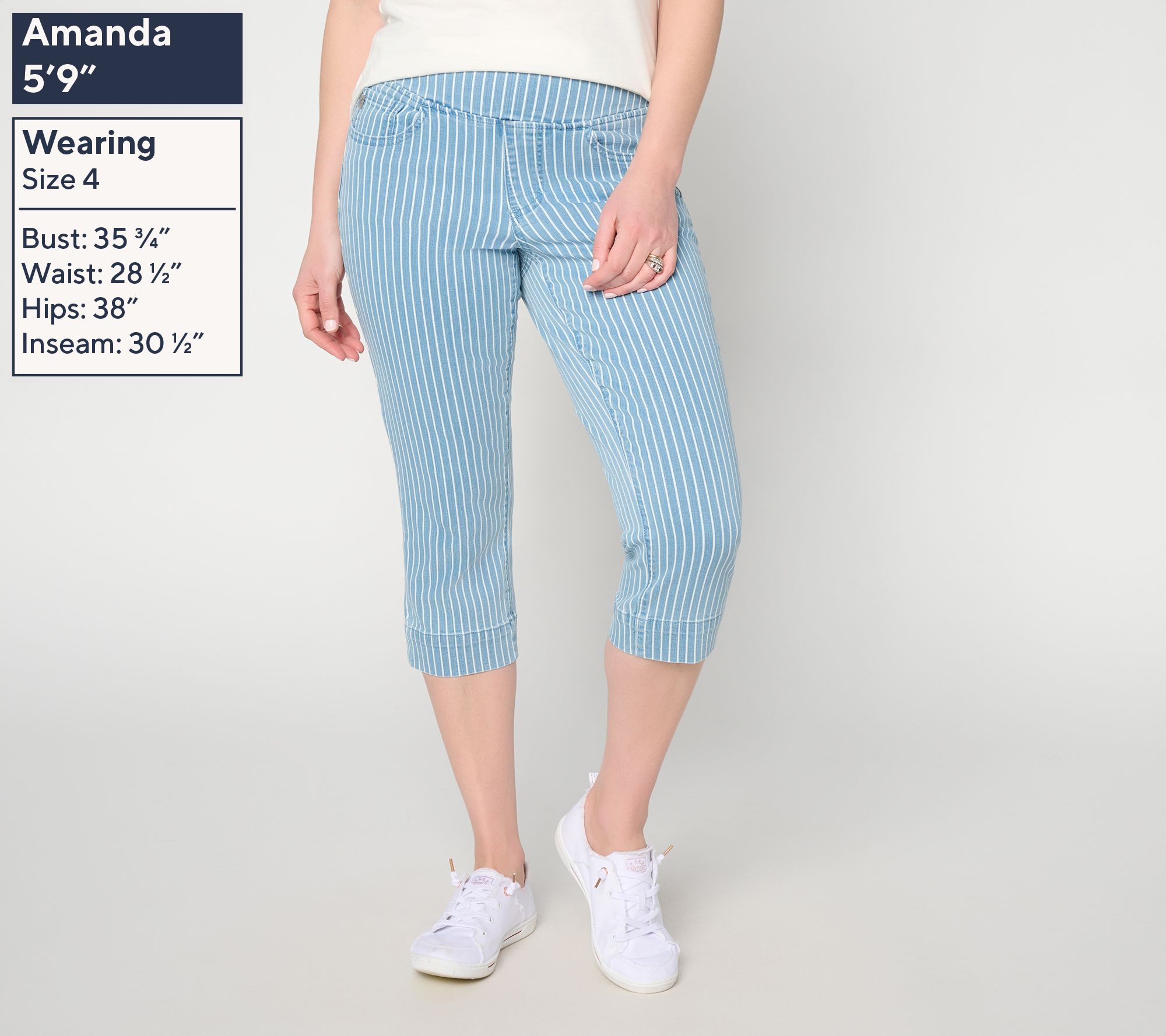 Take on busy weekends and sunny outings in these striped TripleLuxe Denim capris, softly crafted to move with you from errands to family time. Classic five-pocket styling pairs effortlessly with your favorite tee or a breezy blouse for versatile everyday looks. From Belle by Kim Gravel.