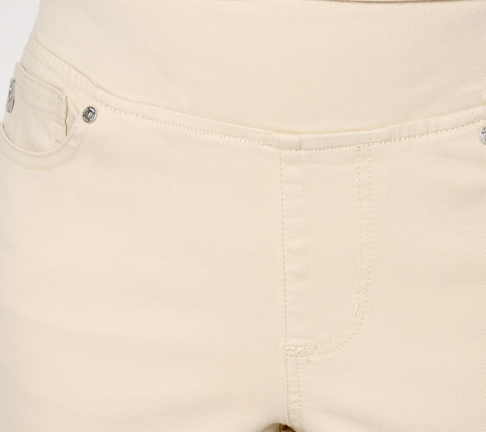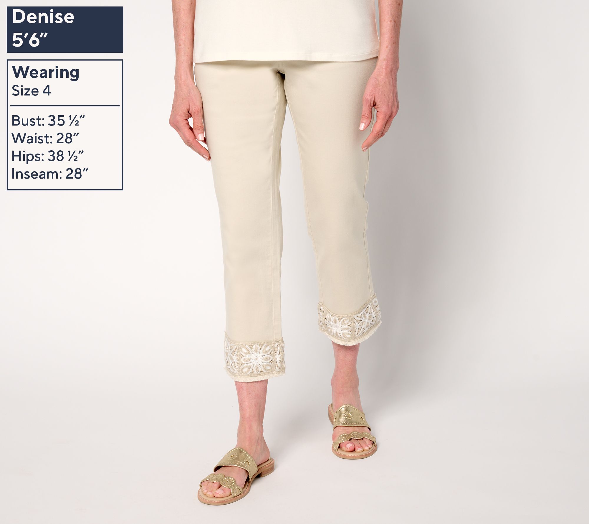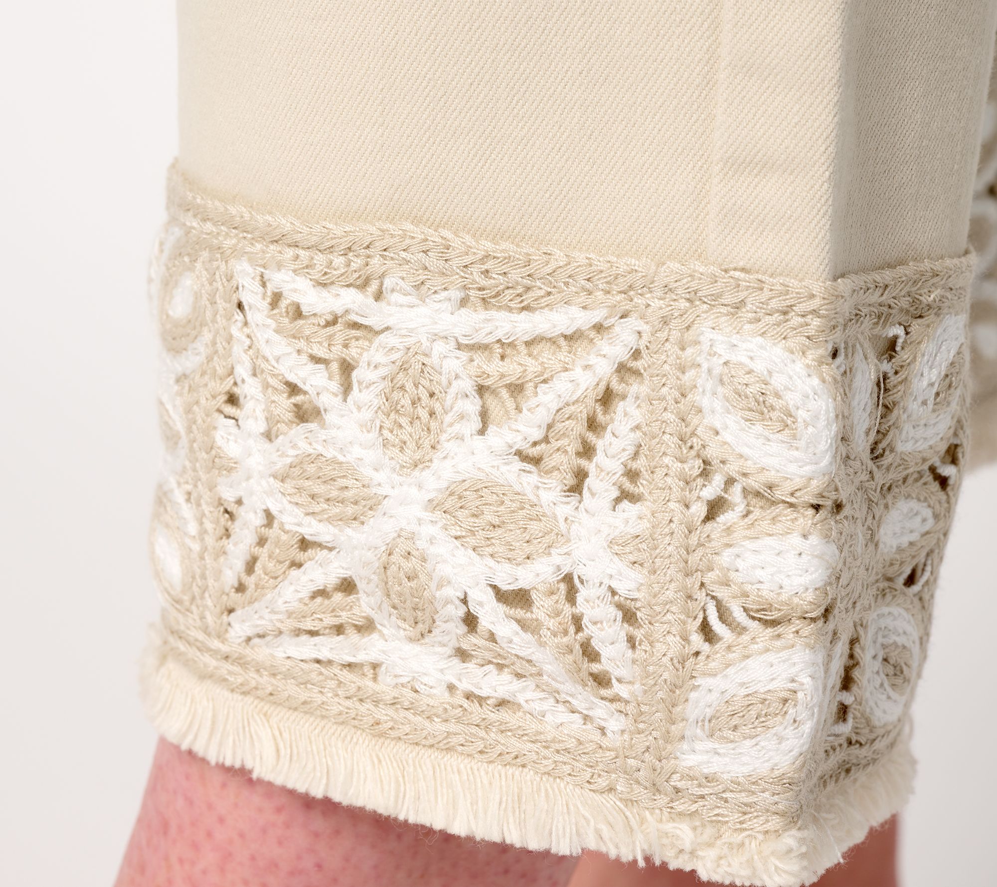 Sashay! Crochet! Work your charm in these sweetly trimmed crops crafted in Kim's beloved (and dance move-friendly) TripleLuxe Denim. From Belle by Kim Gravel.