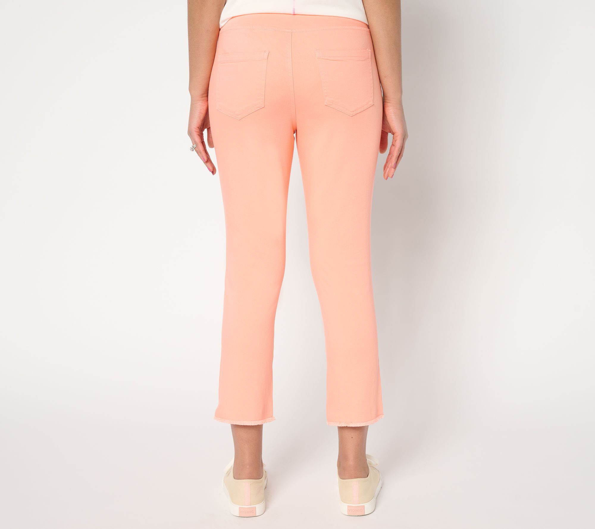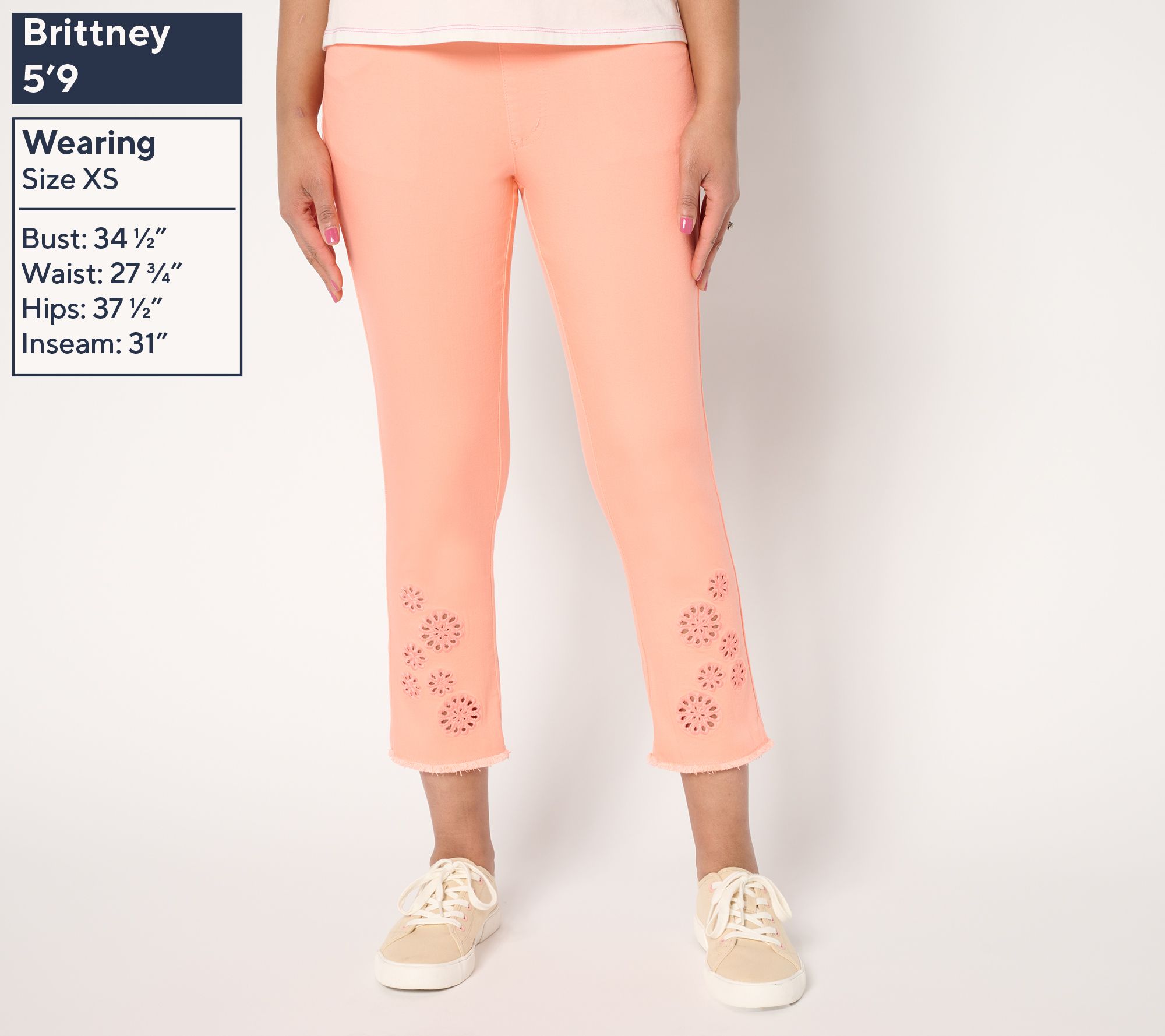 • Features: pull-on style, five-pocket styling, eyelet detail at leg hem, frayed edge, crop length