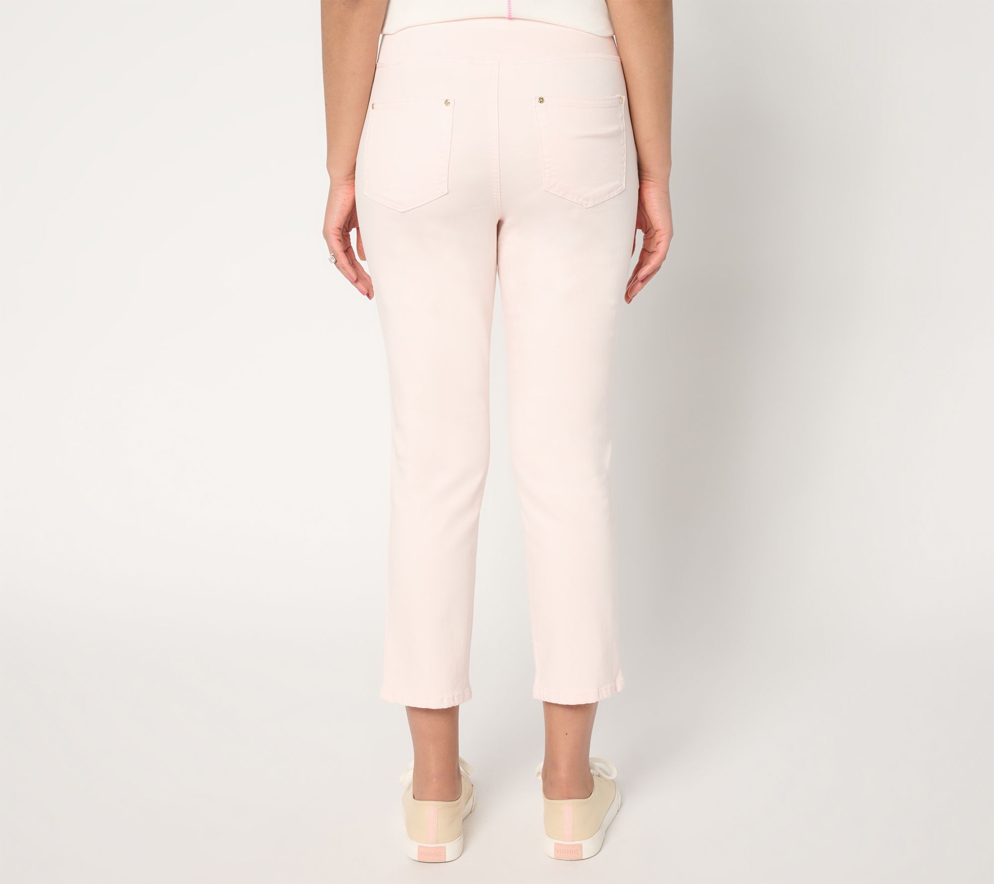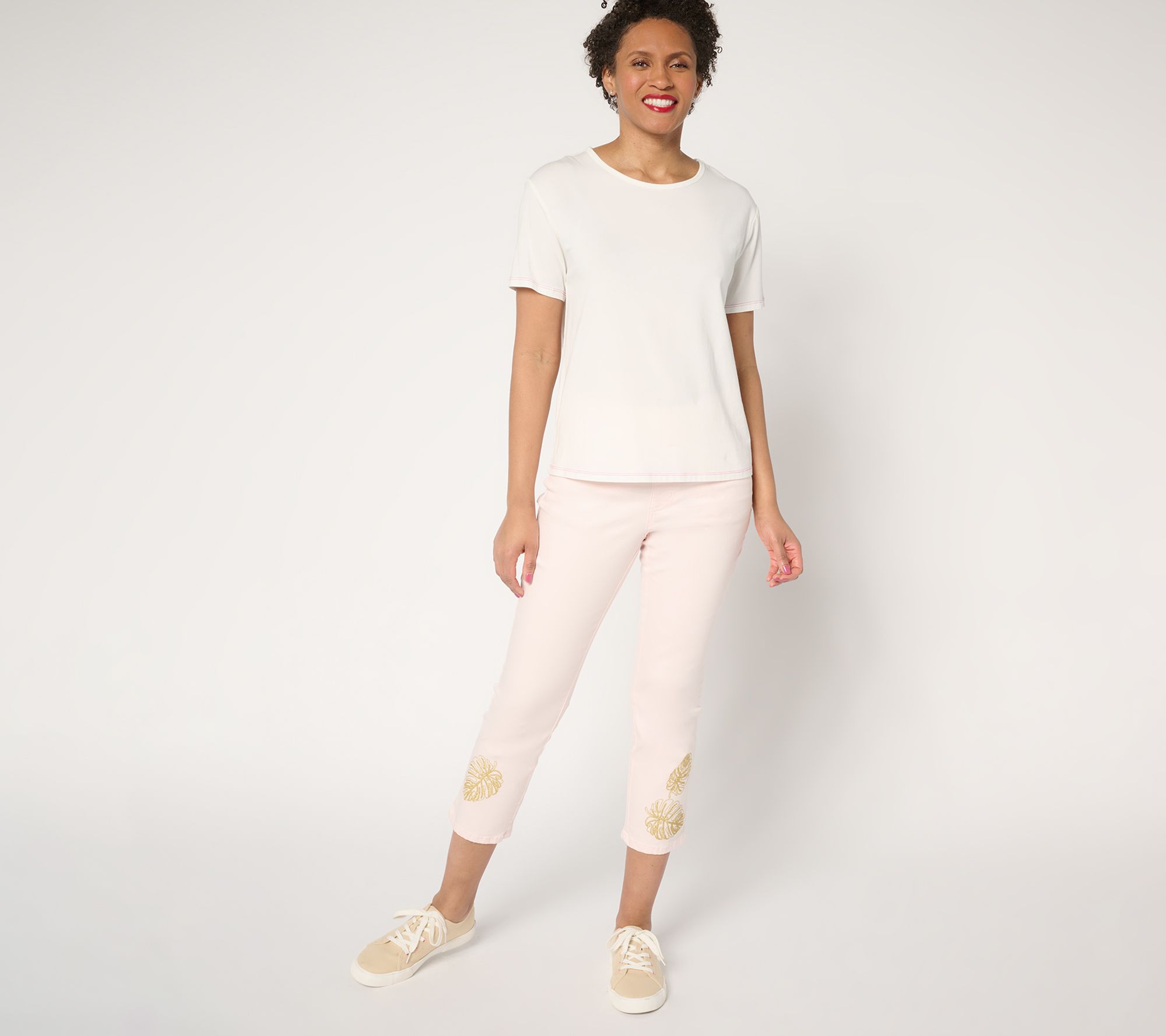 Elevate your casual days with these TripleLuxe Twill Gold Palm cropped jeans. Featuring chic embroidery at the leg opening, these pull-on jeans effortlessly blend comfort and style. From Belle by Kim Gravel.