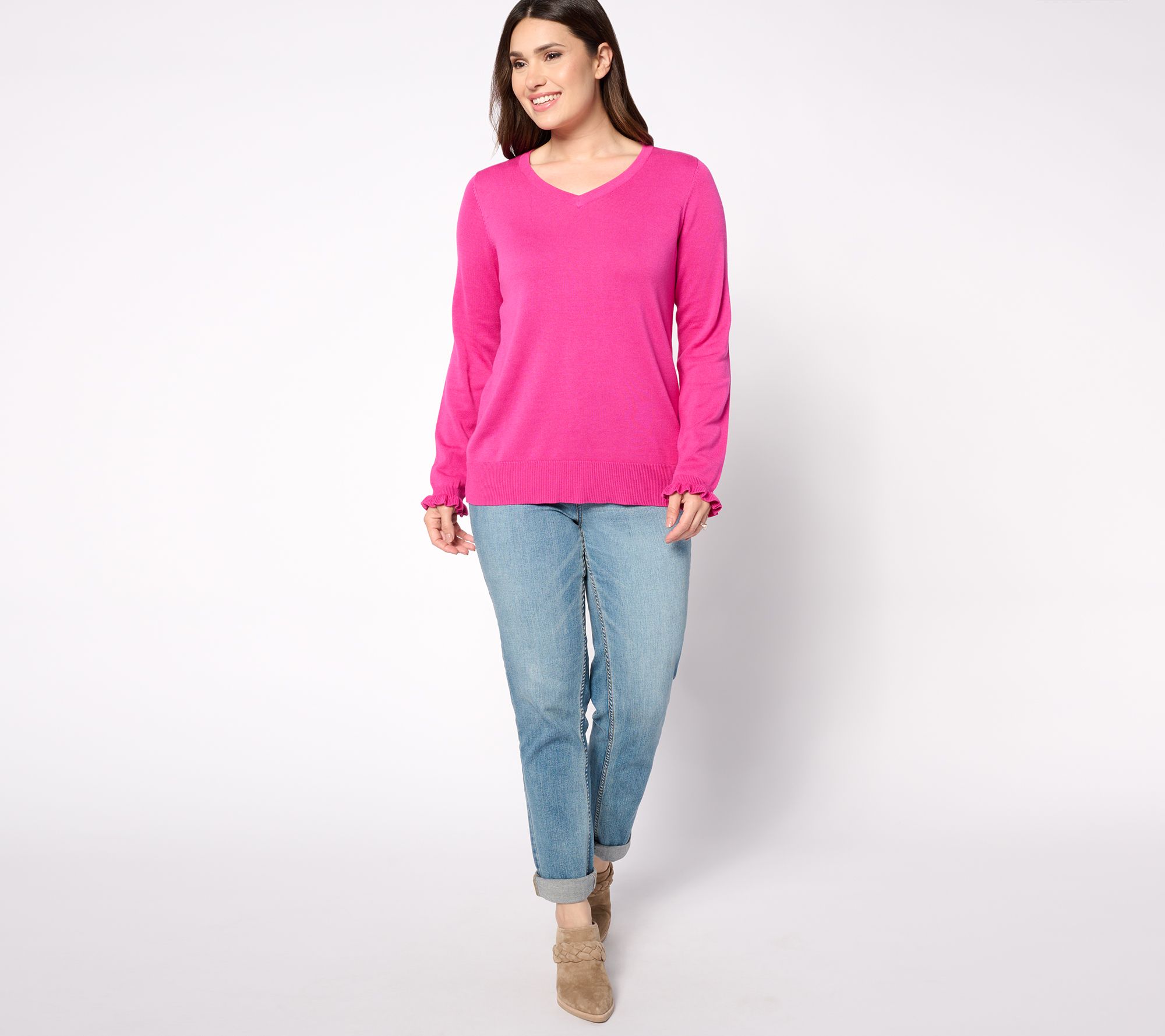 You can't go wrong adding a classic long-sleeve sweater to your collection. The perfect piece to style with your favorite pair of boots and jeans, it creates an outfit that lasts. From Belle by Kim Gravel.