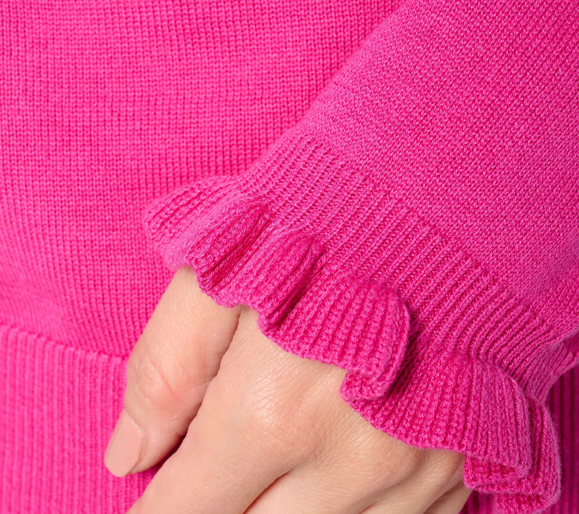 Features: V-neckline, straight hem, ribbed bottom band, ruffle trim at sleeve opening
