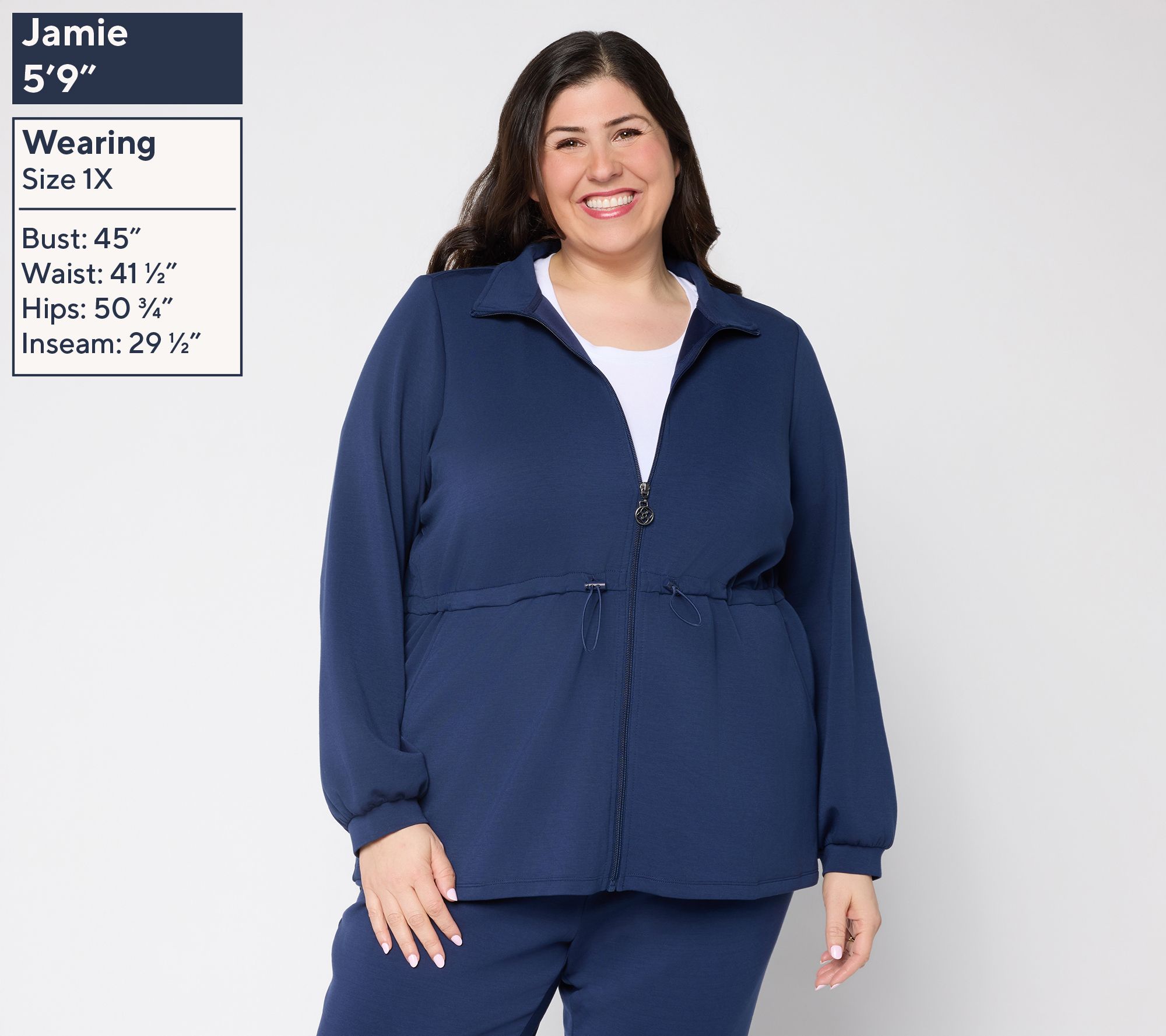 Your everyday adventures just got a new upgrade with this ScubaLuxe zip-front jacket. Cinch the adjustable waist for a customized fit as you run errands, or add a sleek look to your casual outings with the mock neck, slight blouson sleeves, and soft stretch fabric. This lighter weight layer has fashion and function all zipped up. From Belle by Kim Gravel.