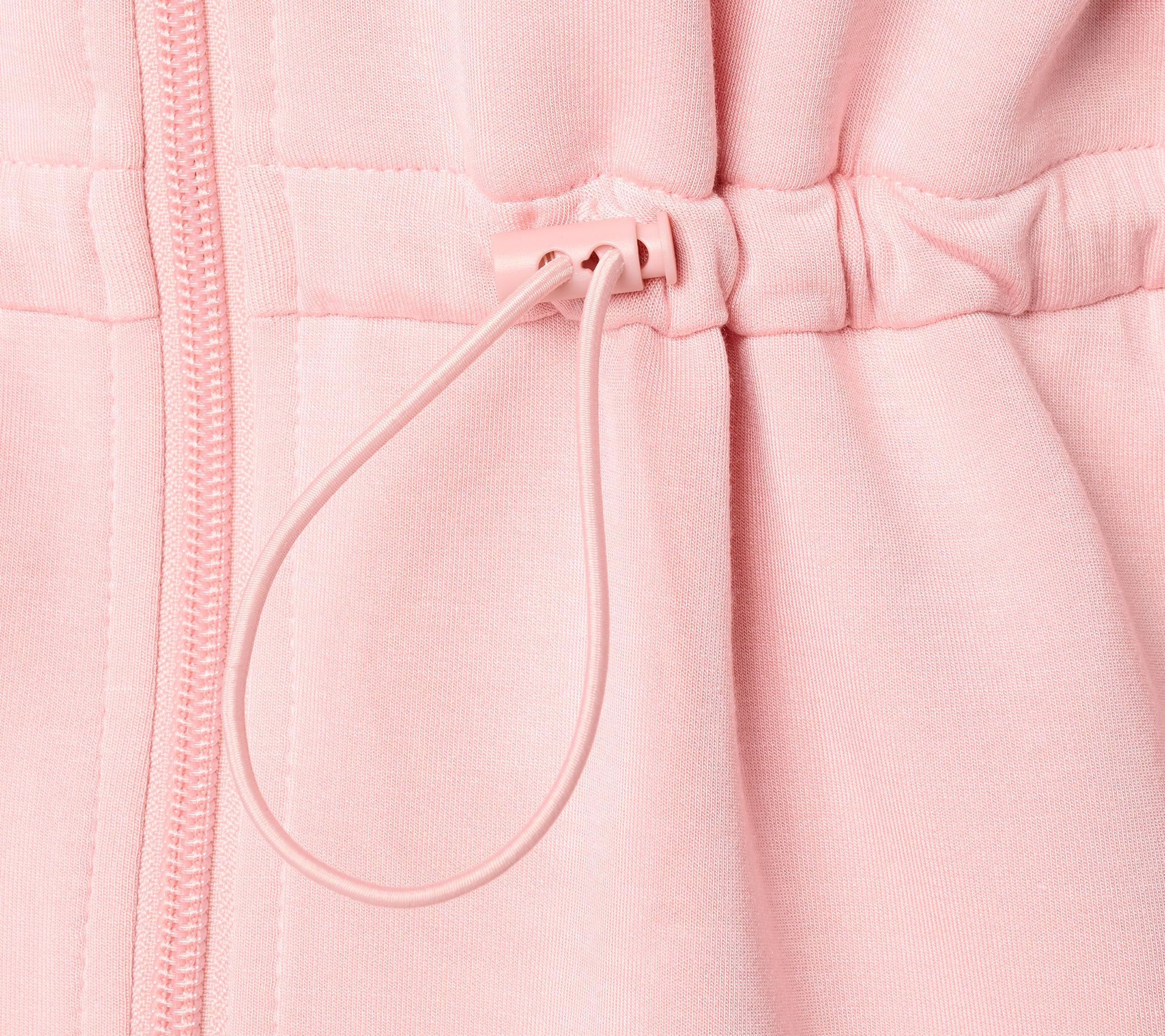 Features: mock neck, long slightly blouson sleeves with cuff, adjustable waist with toggle, side seam pockets, straight hem