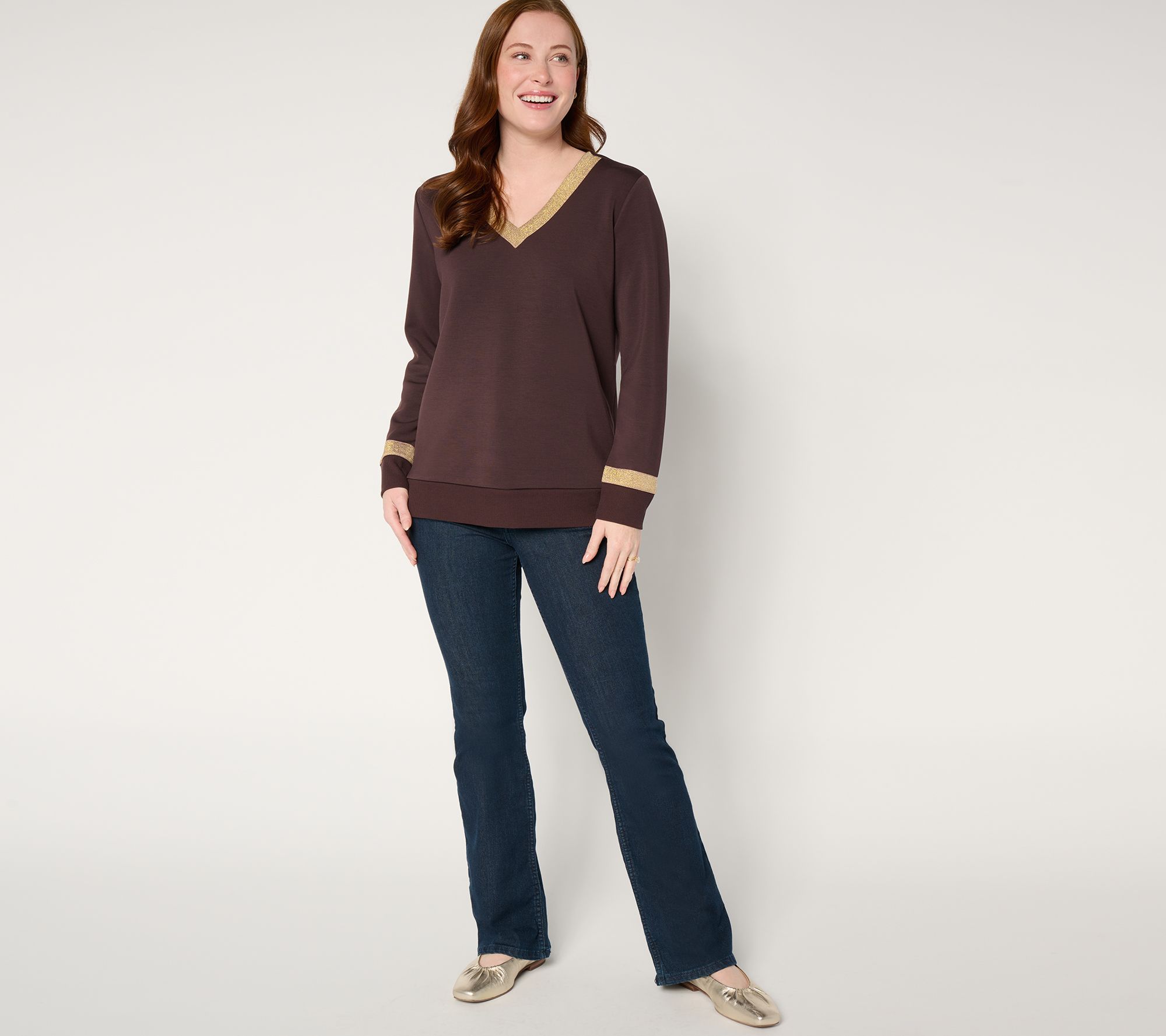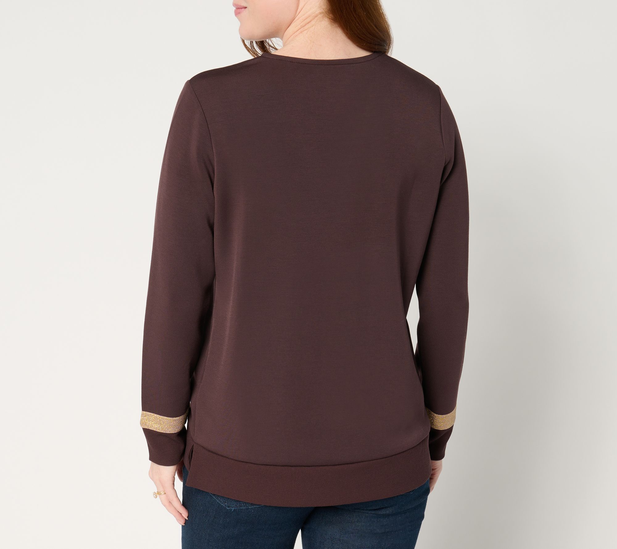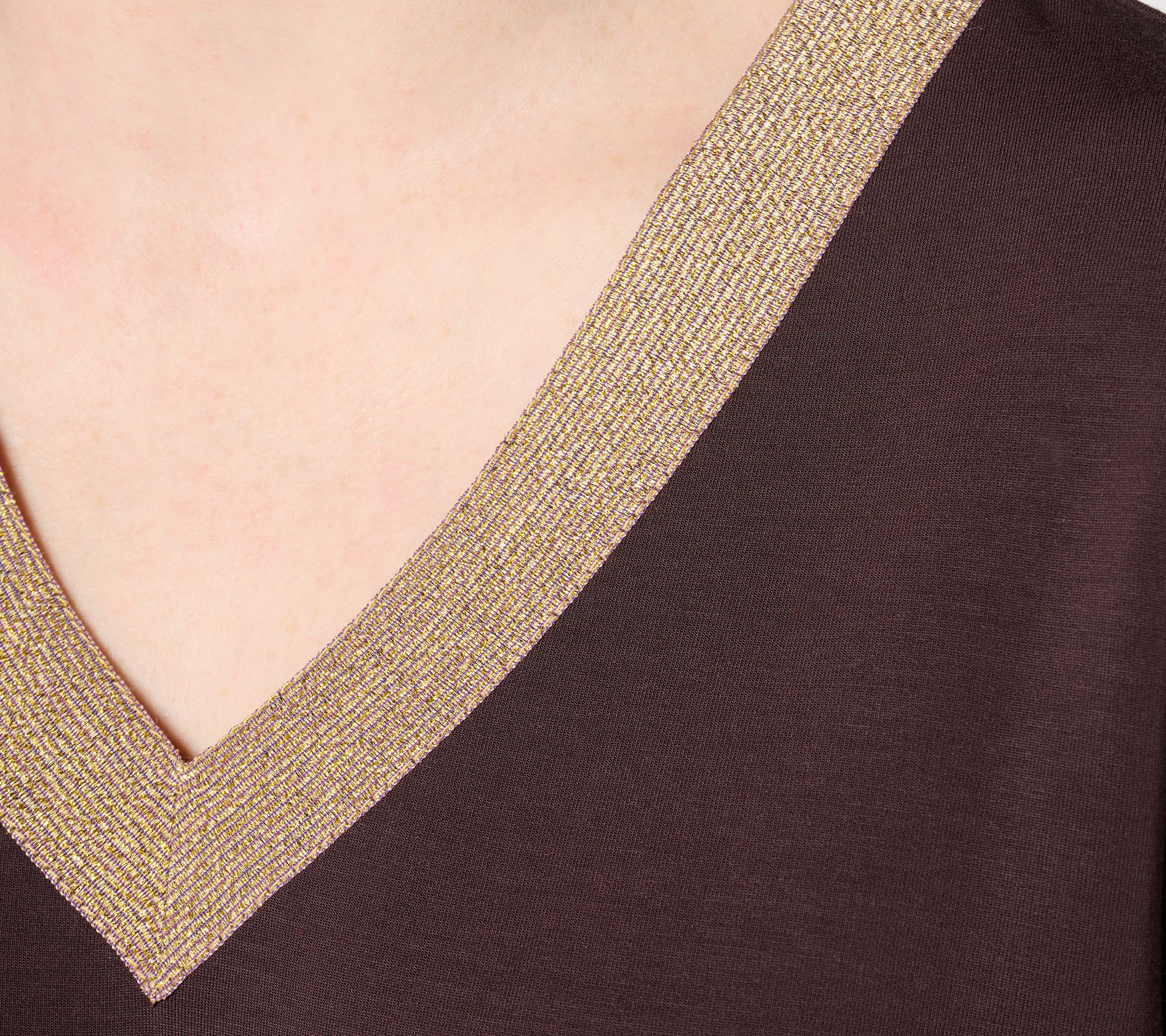 Shine on! Carry the joy of the season into the new year -- and all the cozy dinners with friends, emerging travel plans, and you-focused weekends -- with this silky soft ScubaLuxe top. Shine details in shimmery neutrals help you maintain your glamorous edge without feeling over the top. From Belle by Kim Gravel.