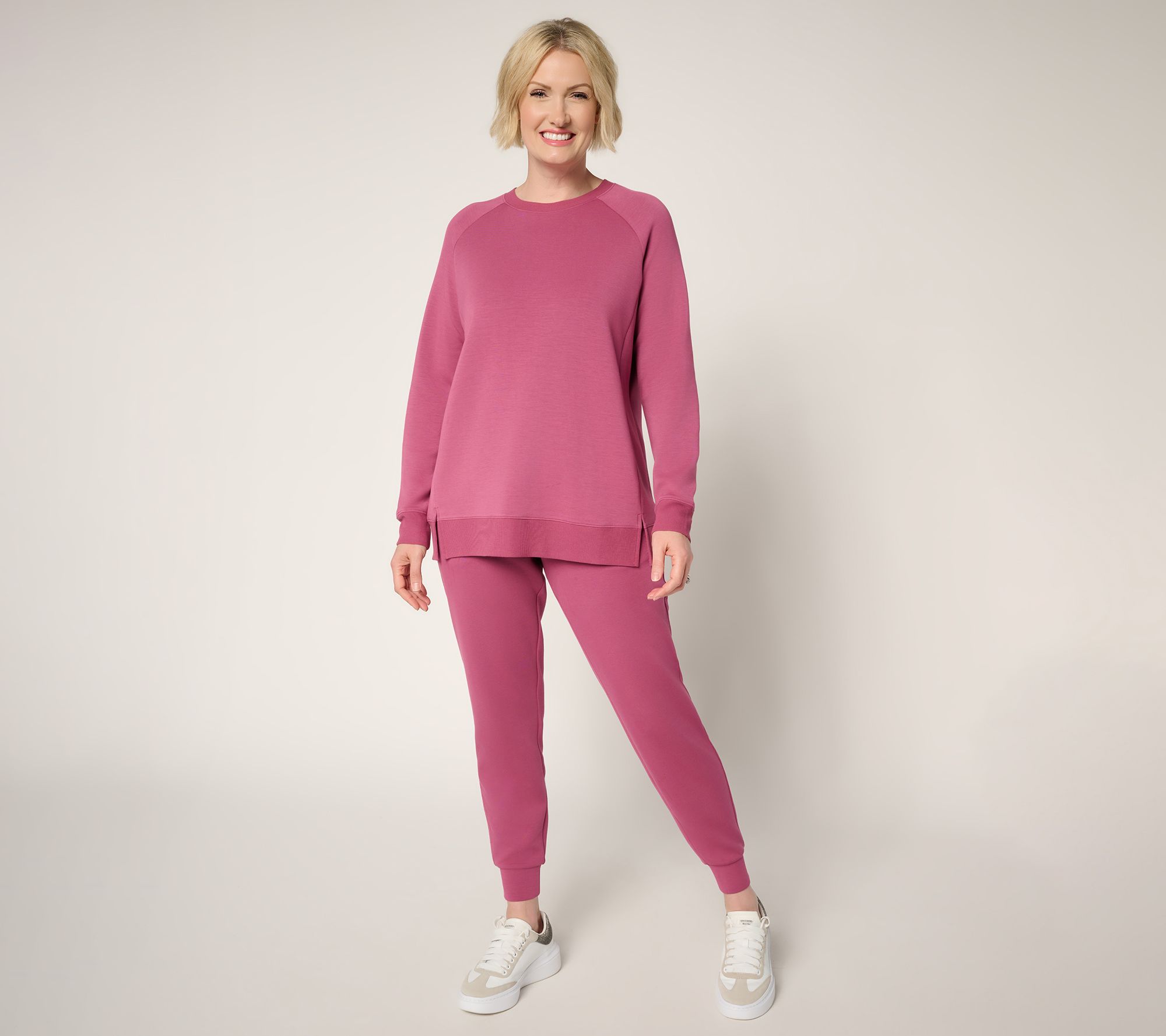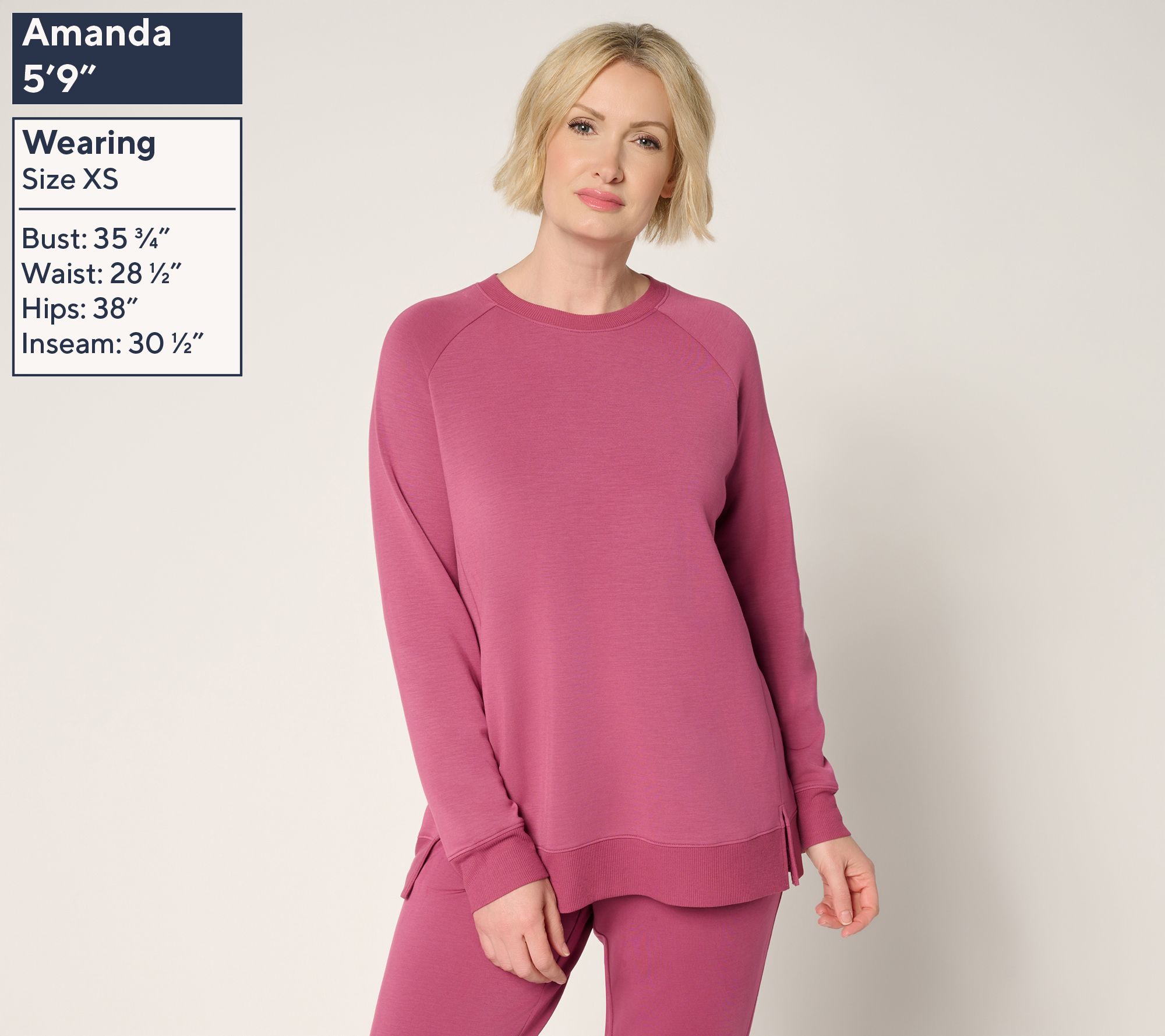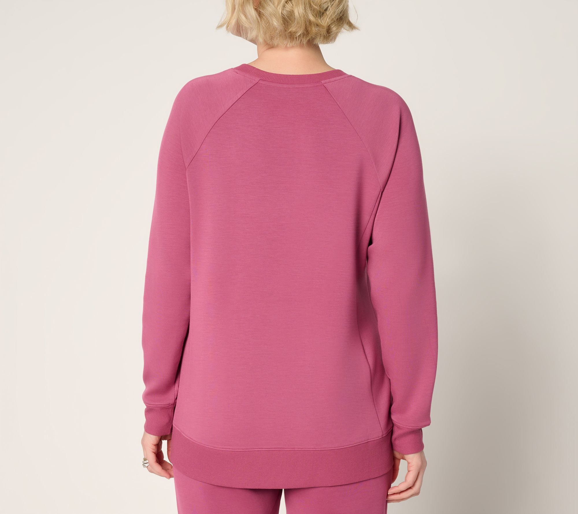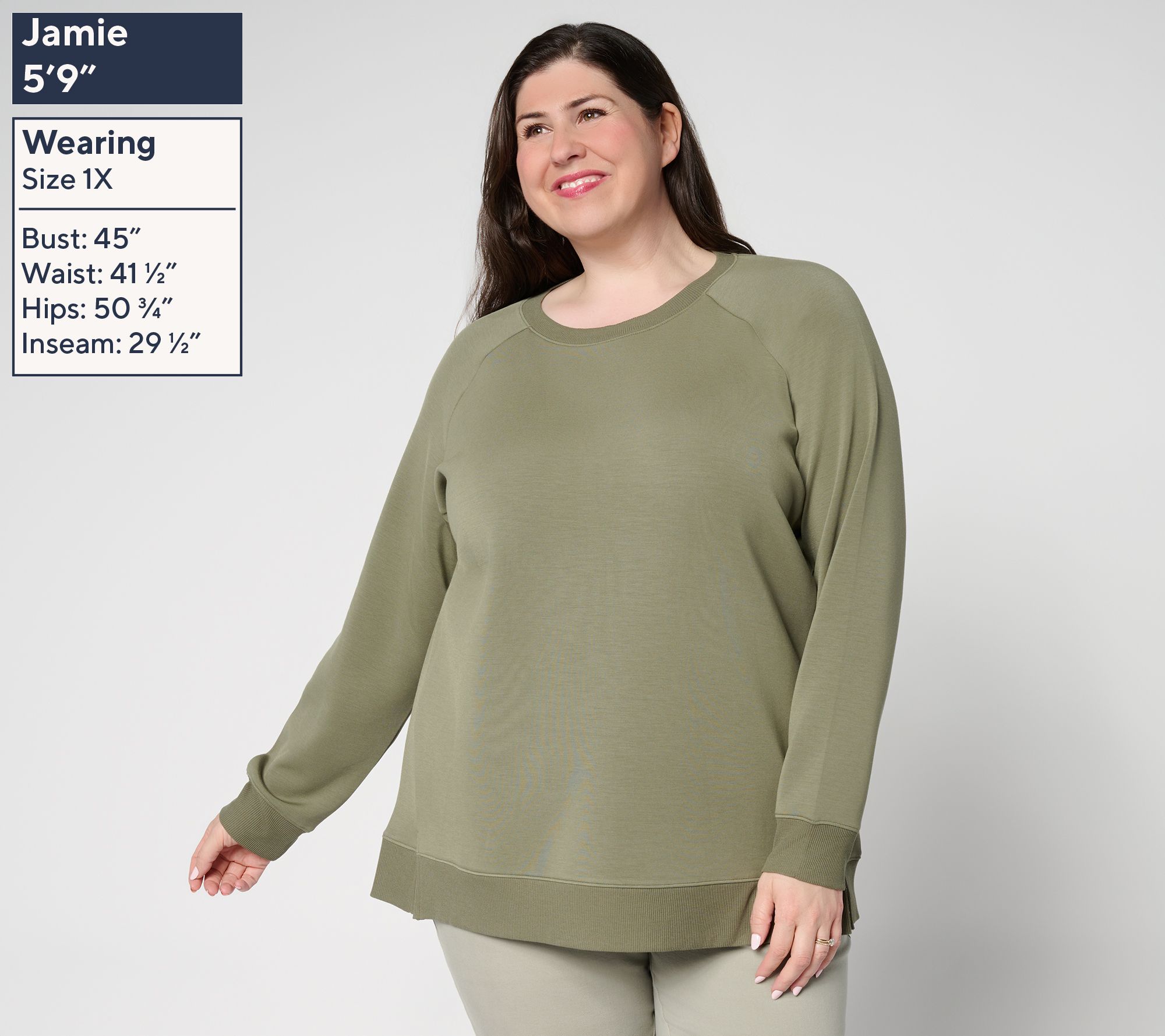 From all-day outings to lounging at home, this ScubaLuxe raglan crew sweatshirt creates countless moments of effortless comfort. Soft knit fabric meets casually relaxed lines, finished with ribbed trim and functional side slits for easy movement. Toss it on with your favorite jeans or leggings and you're out the door or ready to relax at home. From Belle by Kim Gravel.