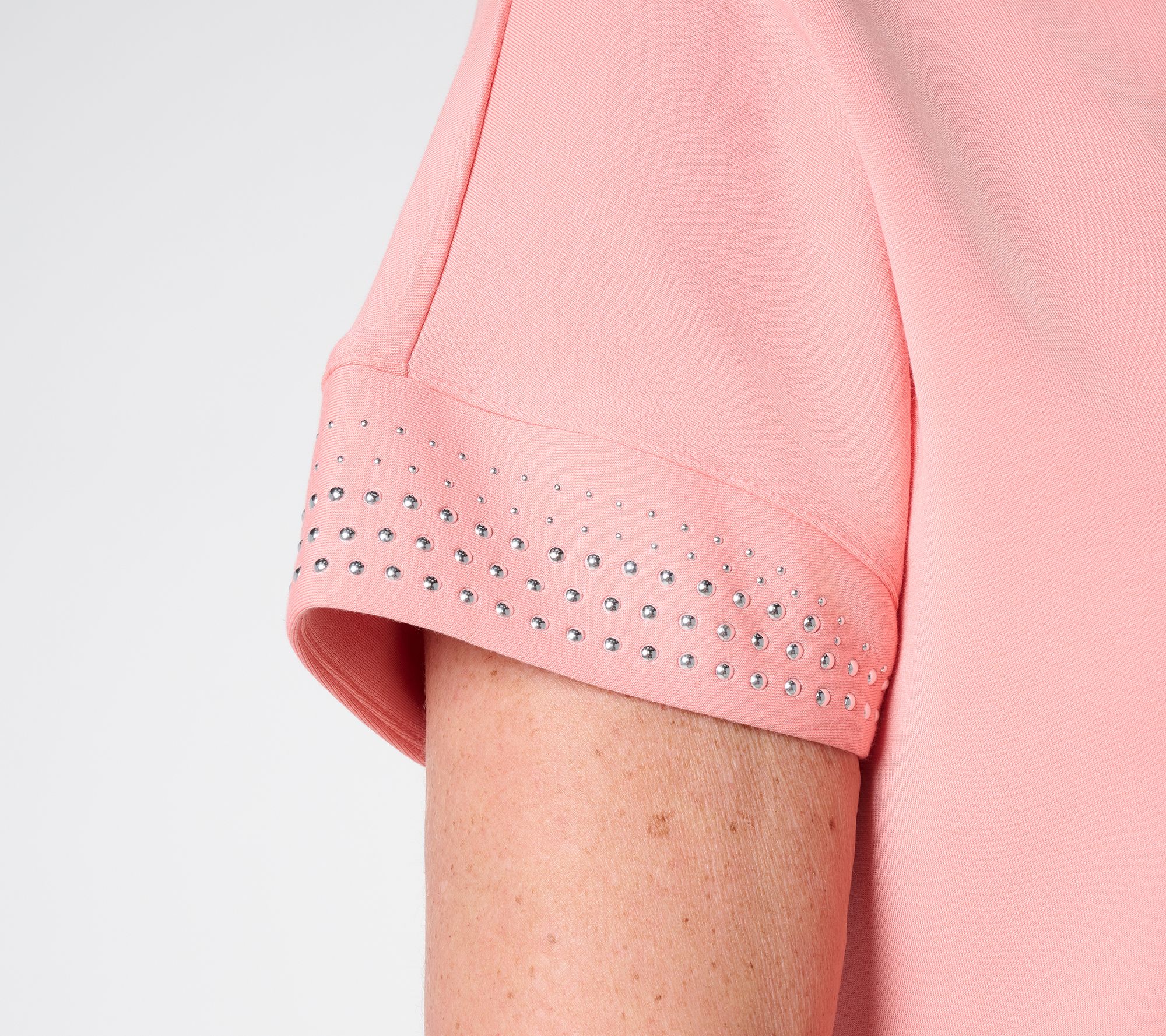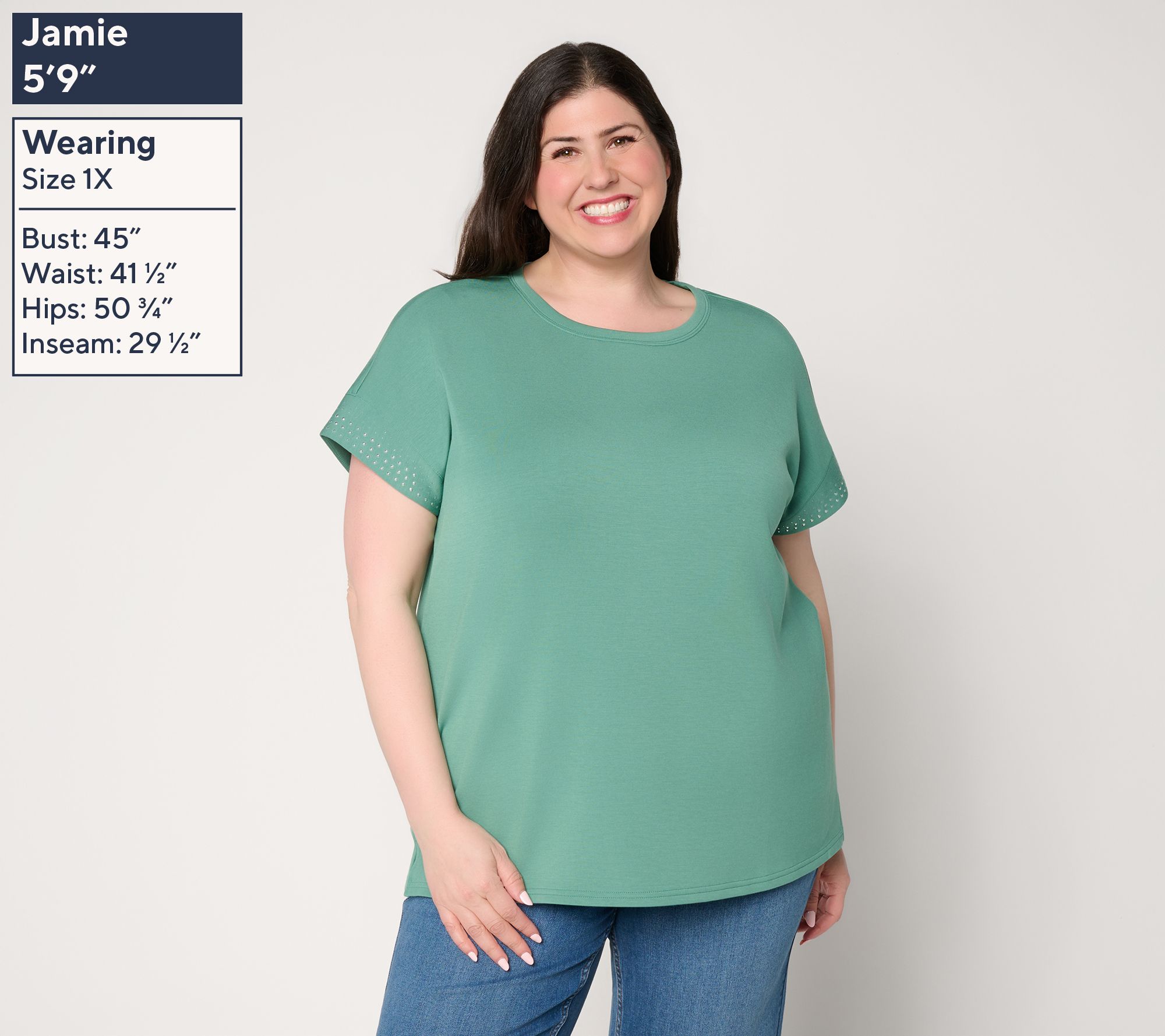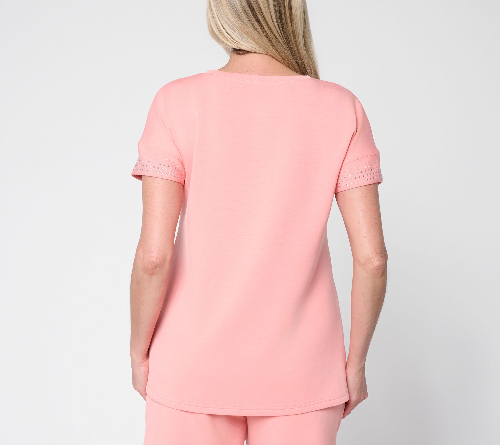 A shimmer of sparkle and a soft knit make this short-sleeve top your go-to for festive gatherings, dinners out, or nights when you want your look to shine a little brighter. The studded details elevate casual jeans or add a playful touch to tailored pants, delivering comfort with just the right hint of glam. From Belle by Kim Gravel.