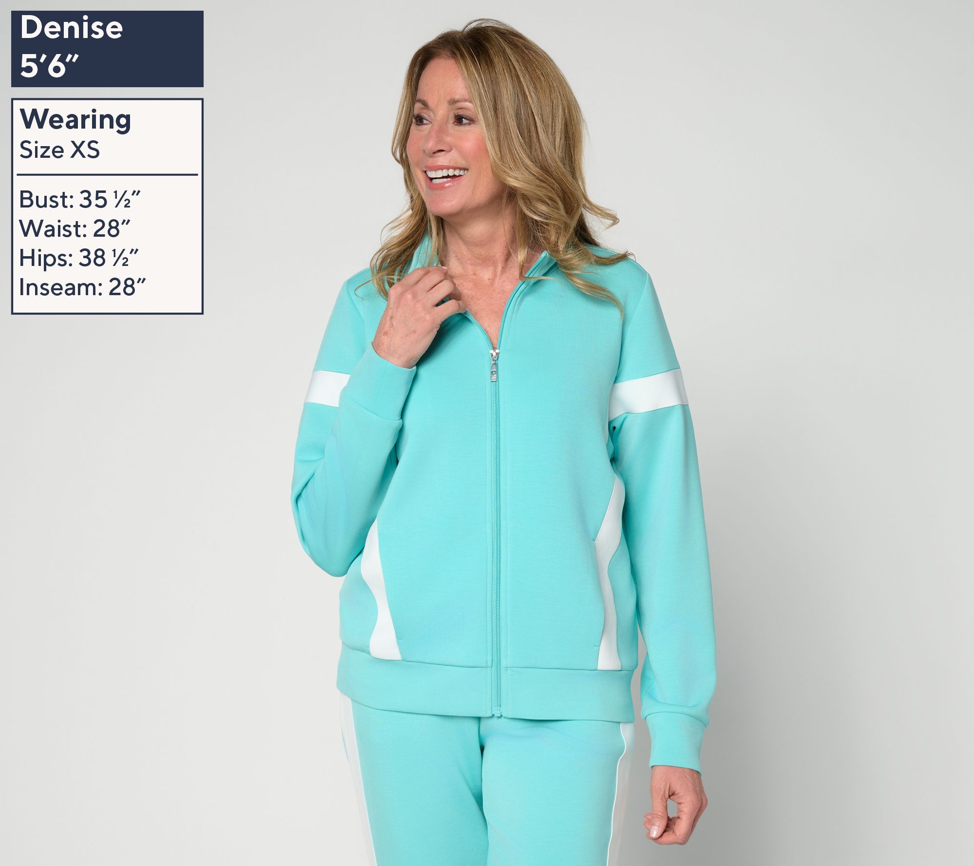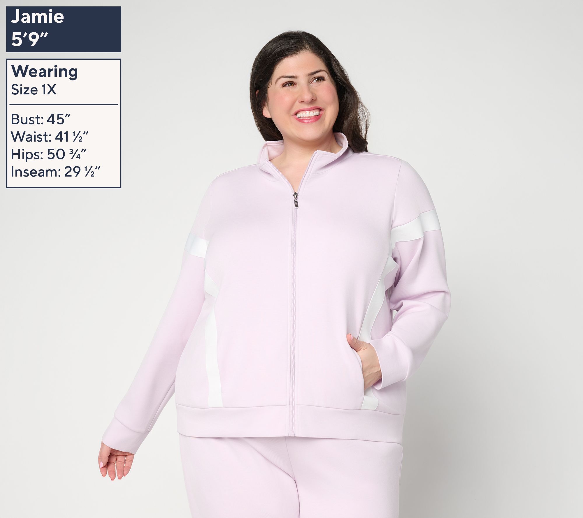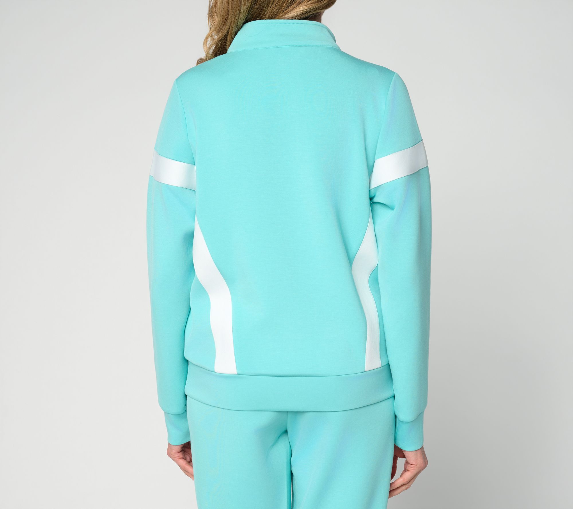 Get sporty with it! Kim's silky-smooth ScubaLuxe knit takes on a whole new dimension with the addition of sporty stripes. Pair this mock neck jacket with your favorite sneakers, some upbeat tunes, and plenty of sunshine -- and go after it! From Belle by Kim Gravel.
