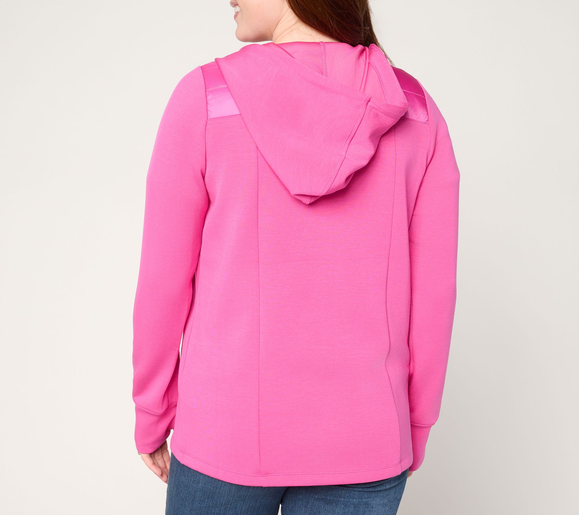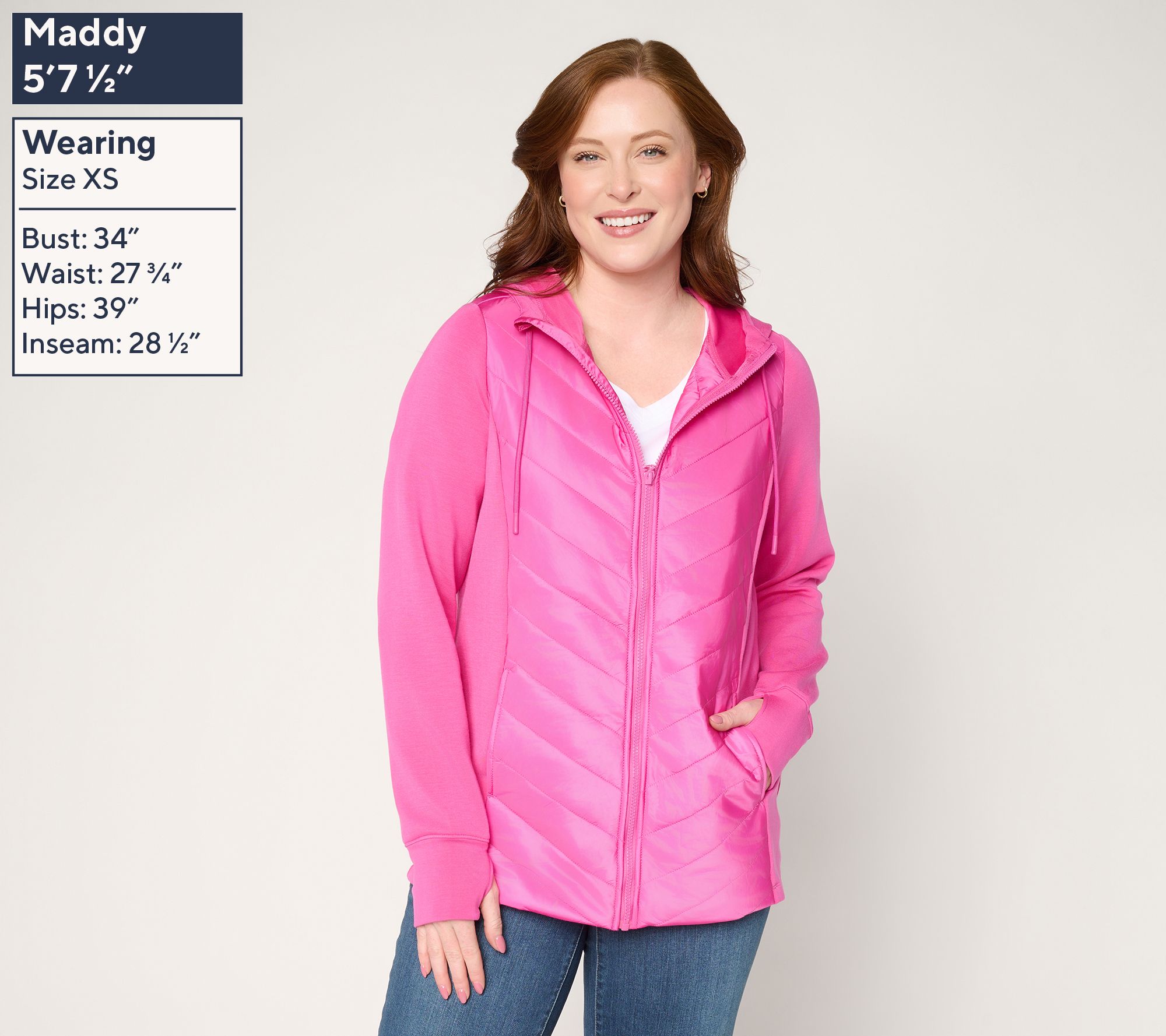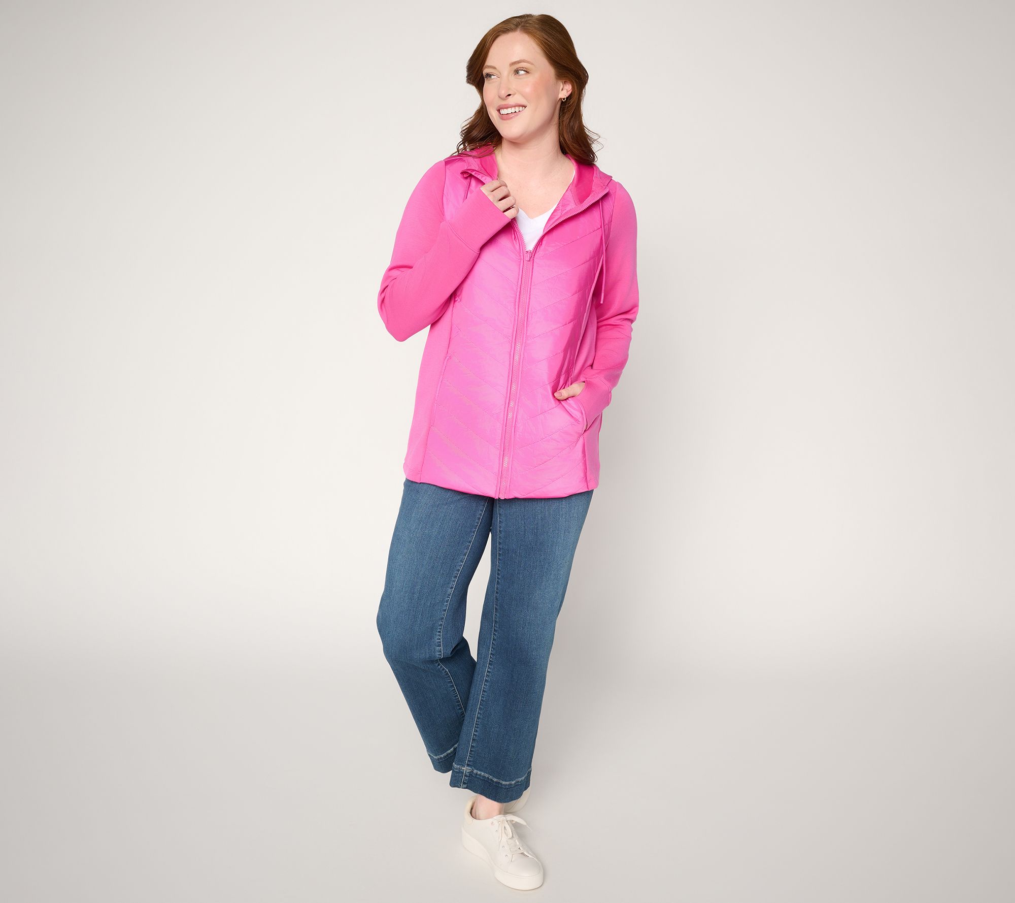 Introducing your jacket dream team: Kim's ScubaLuxe Knit + comfy-cozy quilting. With made-to-move fabrication, a roomy-enough-to-layer fit, and a generous hood, this mixed-media marvel becomes your instant go-to for everyday appointments, fresh air walks, and fabulous weekending. From Belle by Kim Gravel.