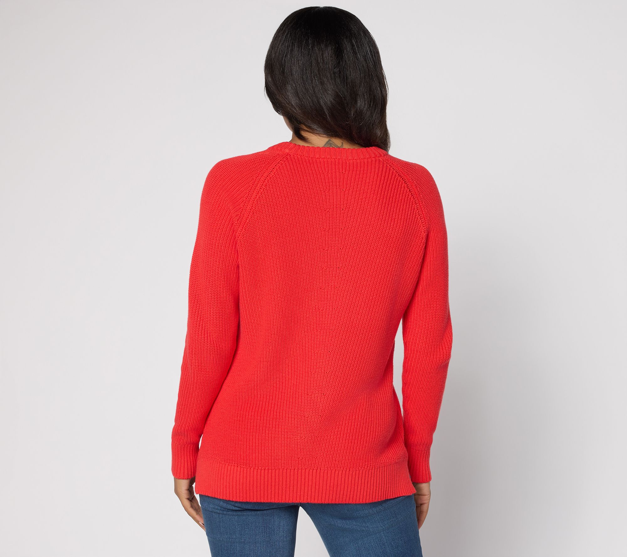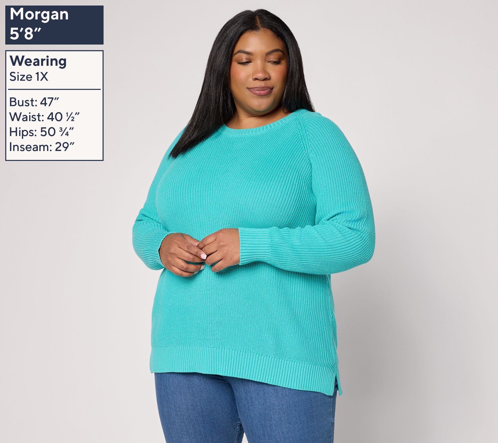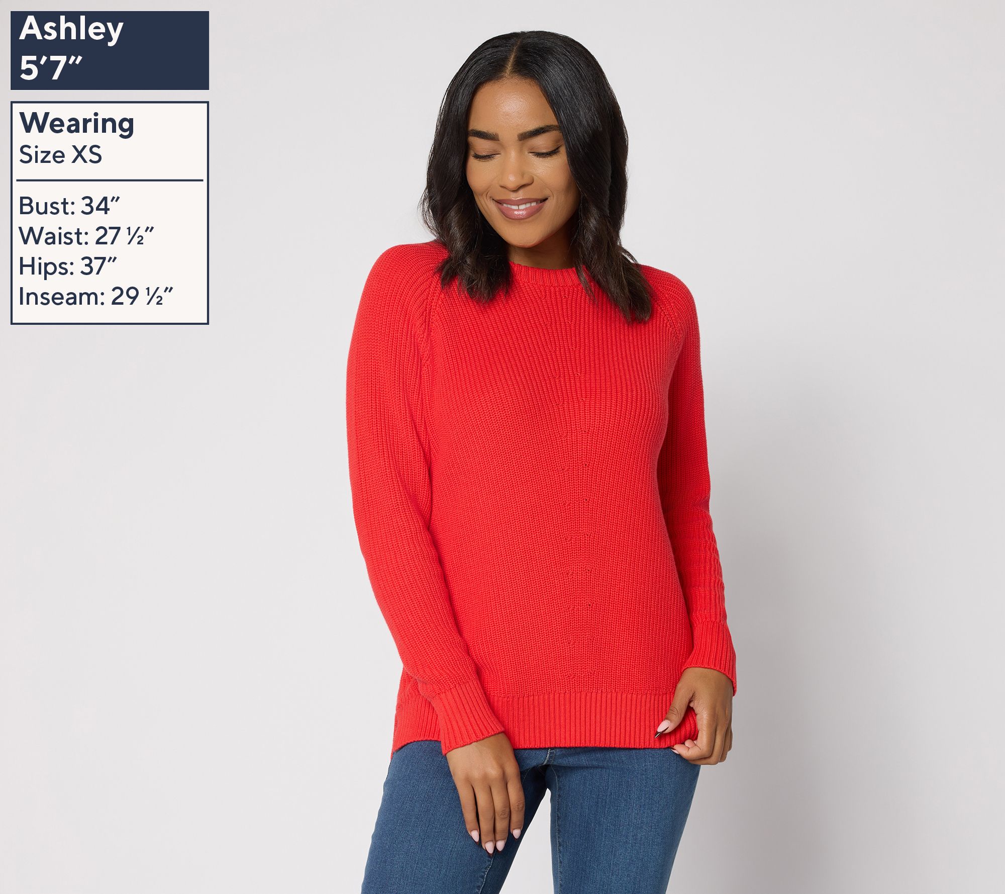 Features: crew neckline, long raglan sleeves, center front and back pointelle stitch detail, ribbed cuffs and bottom band, straight bottom hem, side slits