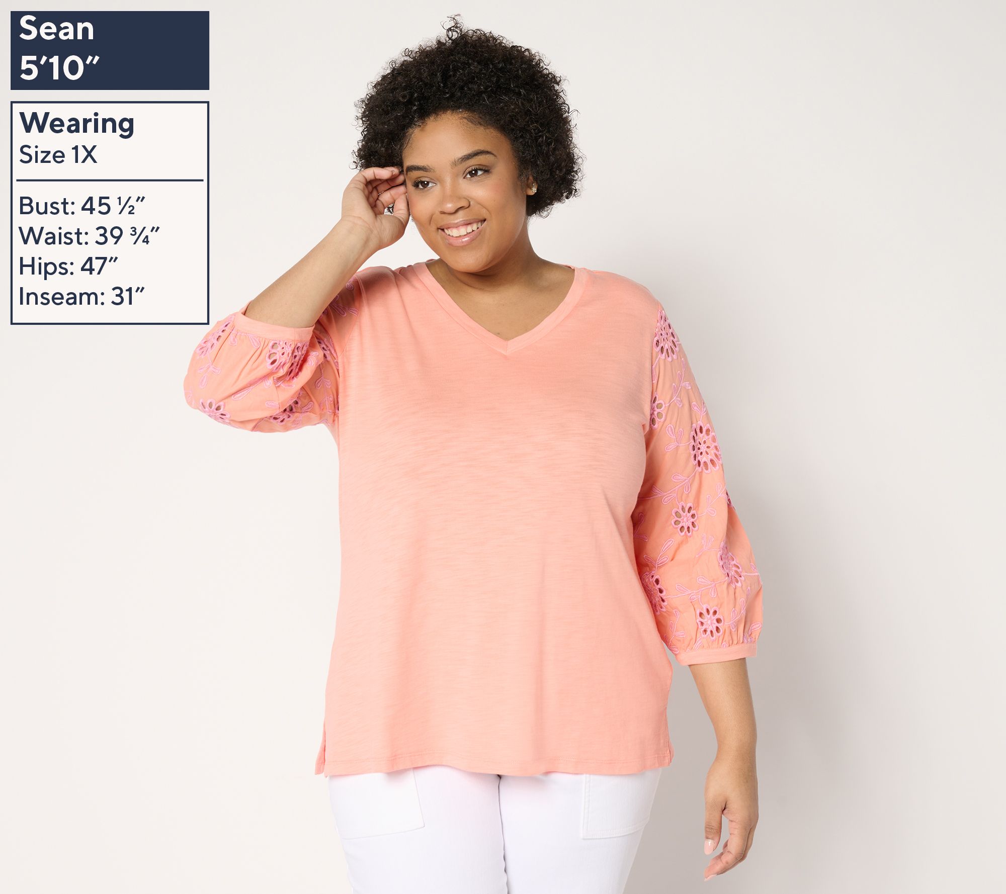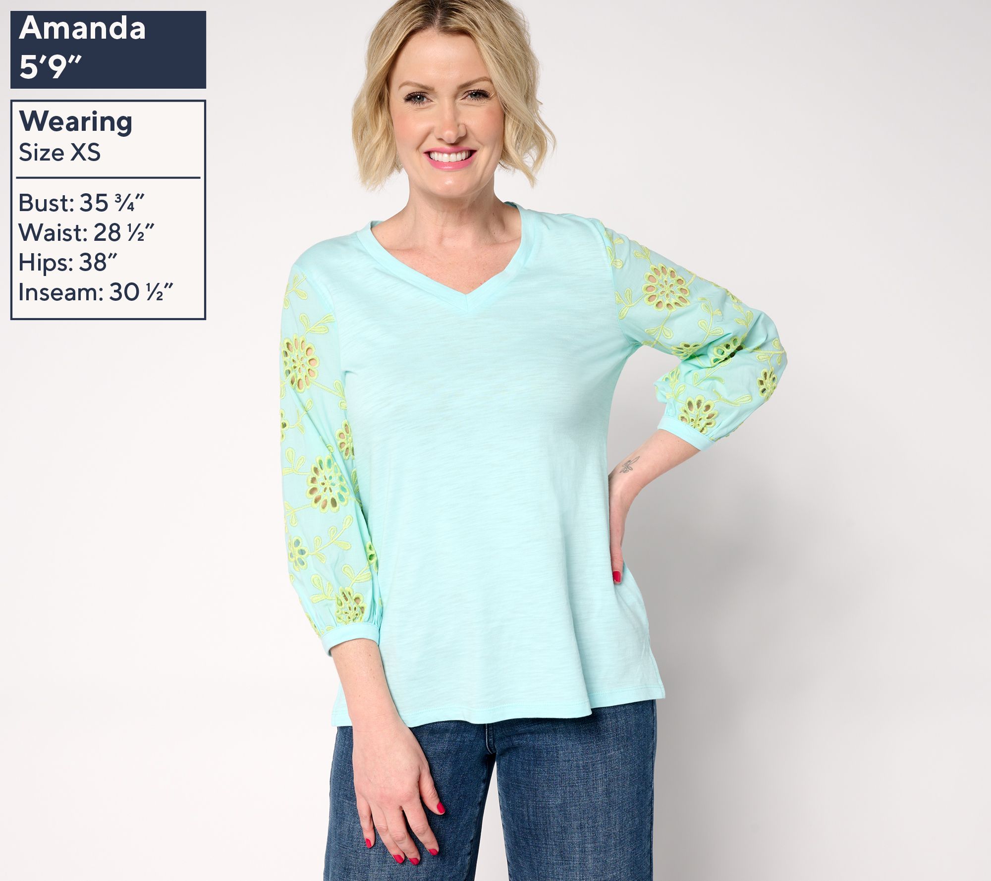 - Fabrication: slub knit body, woven contrast eyelet sleeves