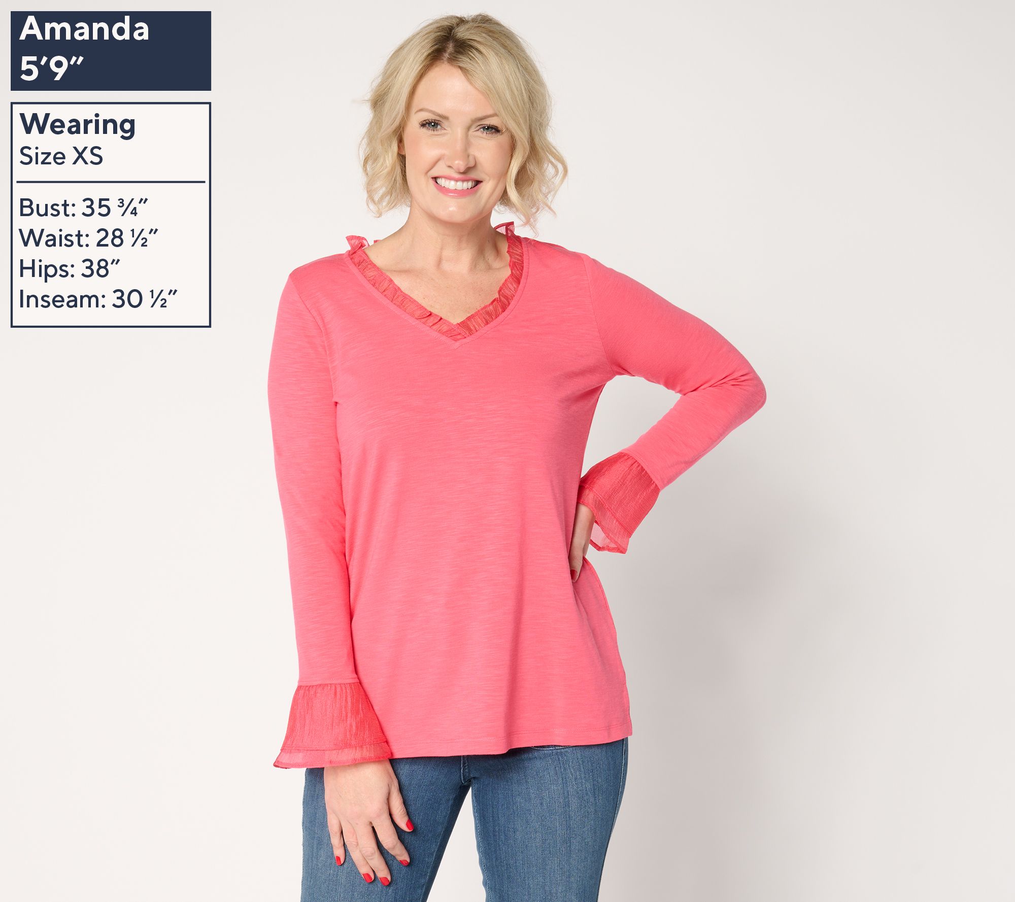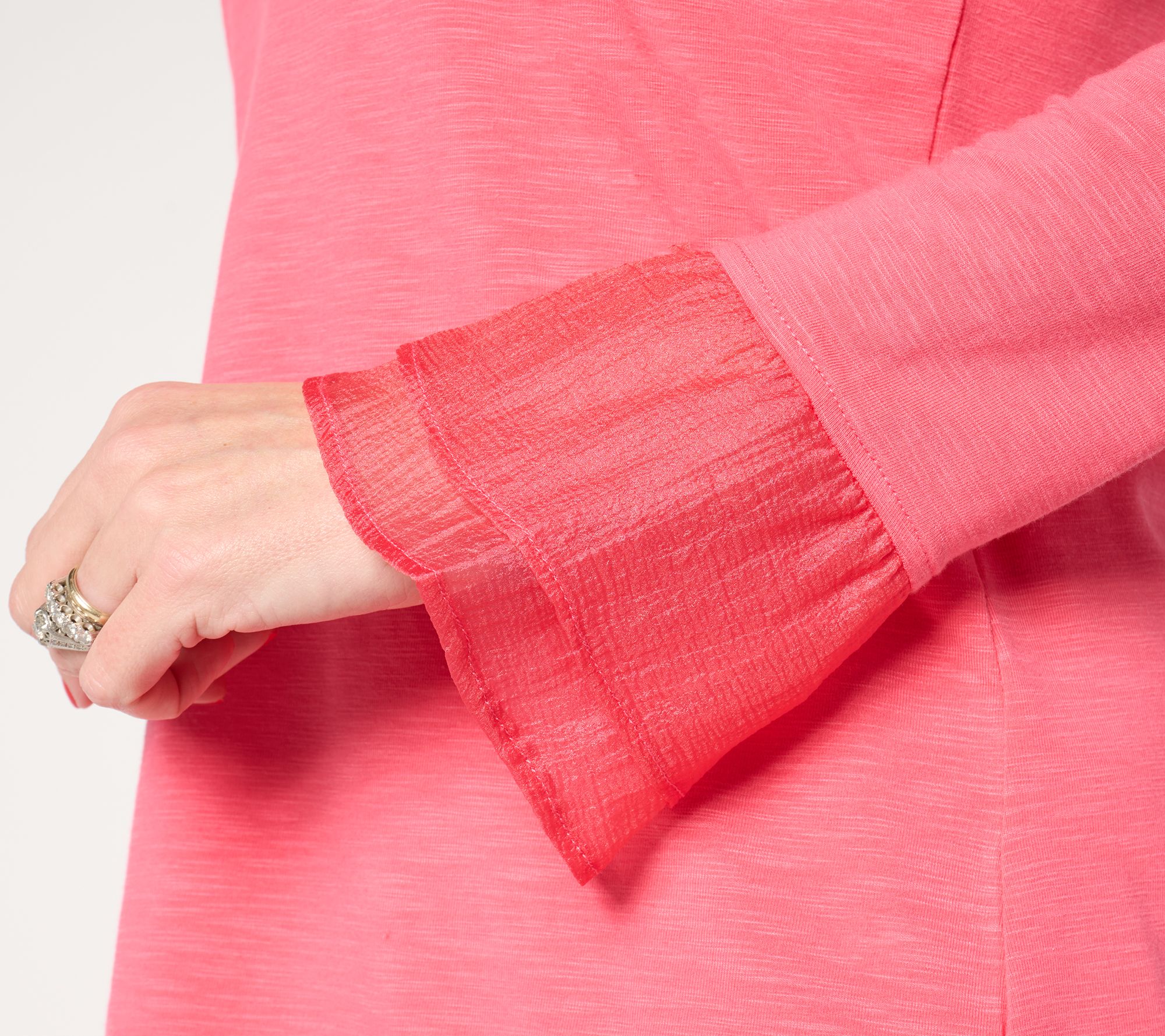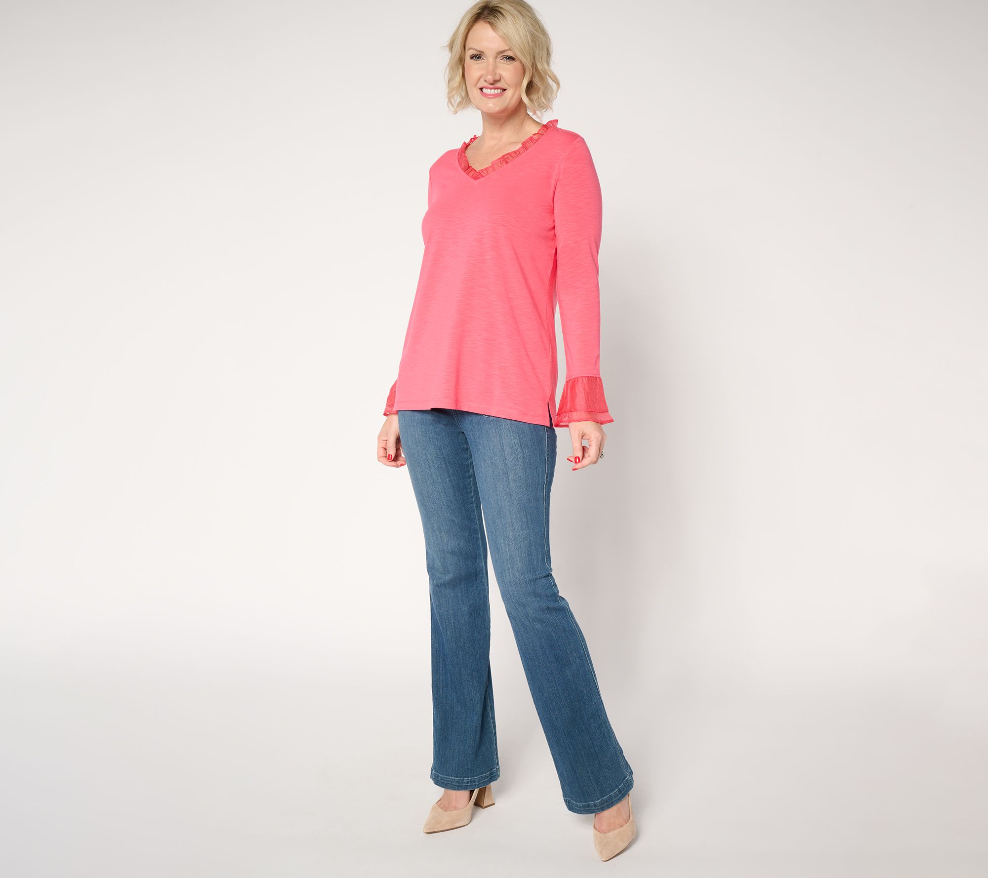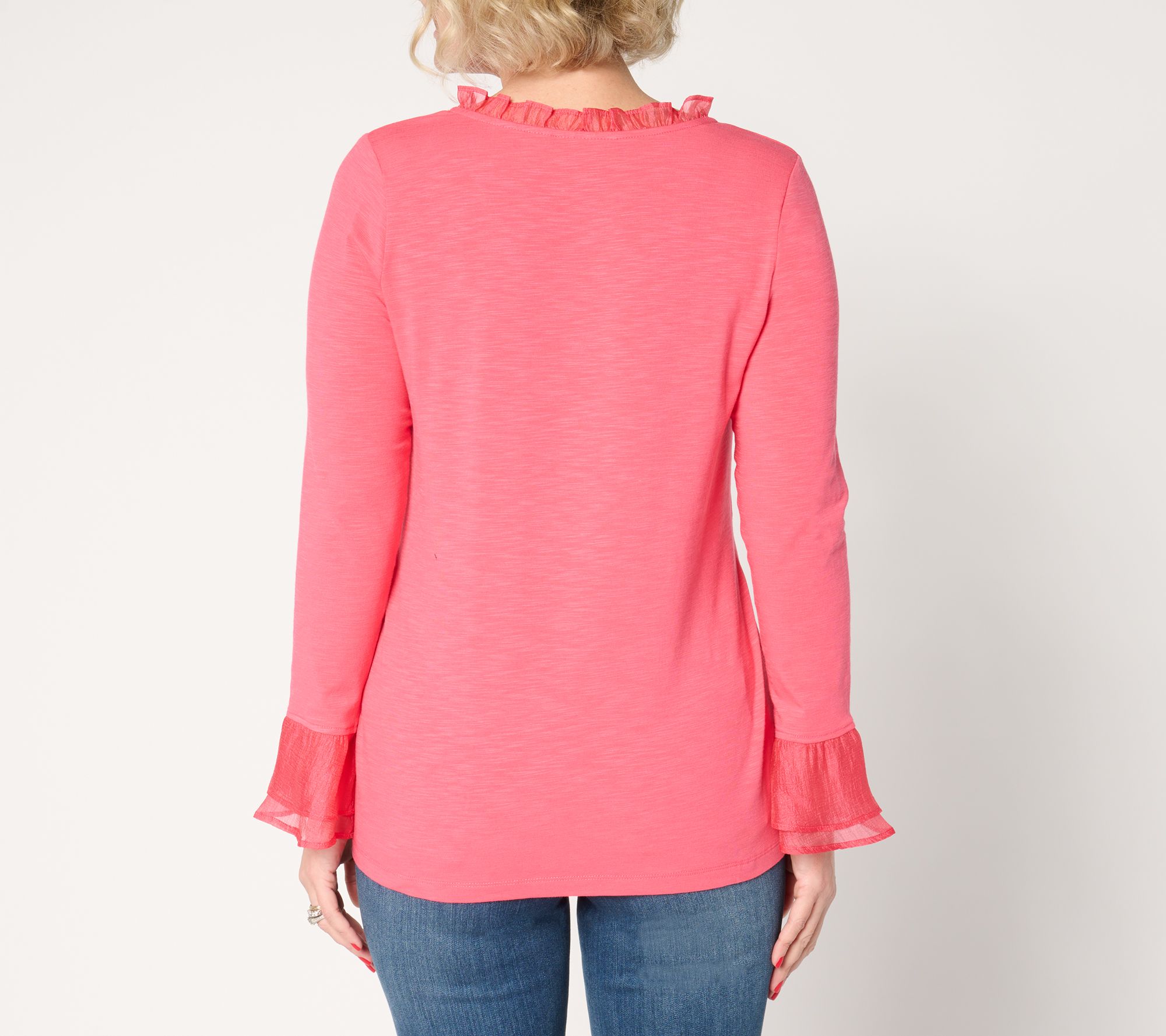 Never plain, always playful! If that's your of-the-moment mantra, this soft slub knit top from Kim Gravel is gonna be your go-to piece in any season. Look forward to slipping into effortless elegance with its ruffled neckline and double flutter sleeve cuff -- and never look back! You'll feel stylishly spright at casual outings and dressier events alike with its feminine charm. From Belle by Kim Gravel.