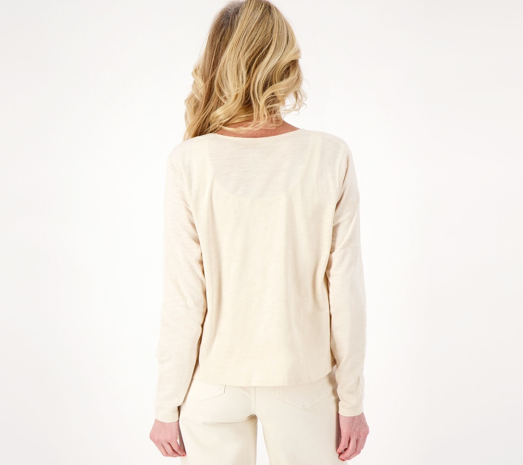 A cute alternative to a cardigan or hoodie, this slub knit shrug is perfect when paired with high-waist pants. From Belle by Kim Gravel.