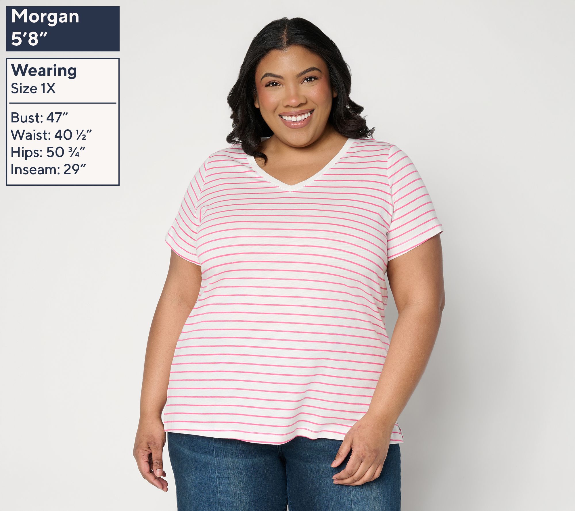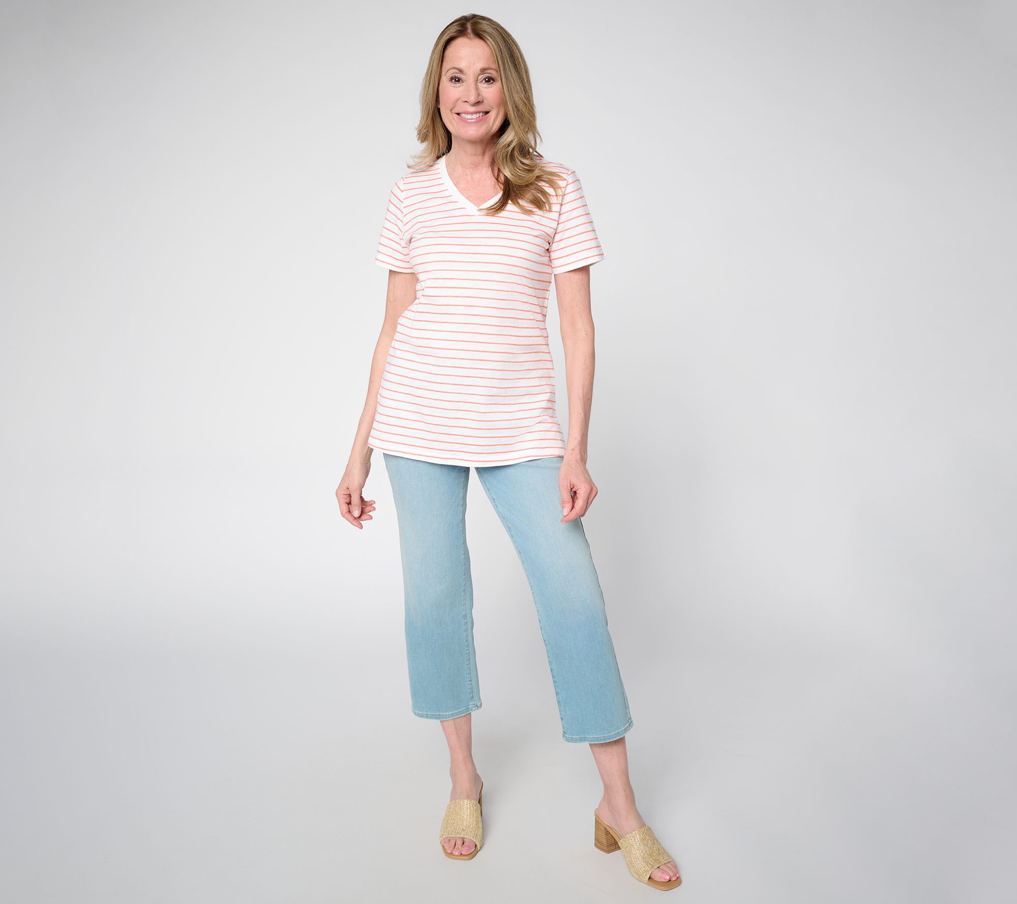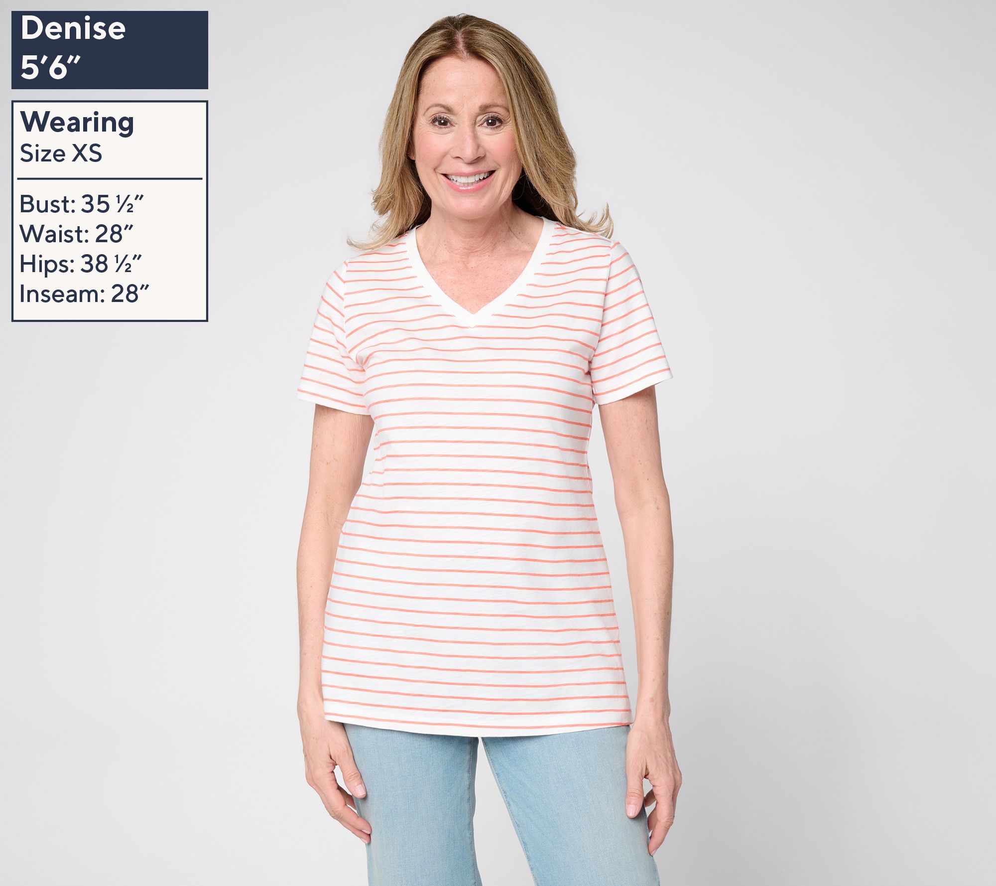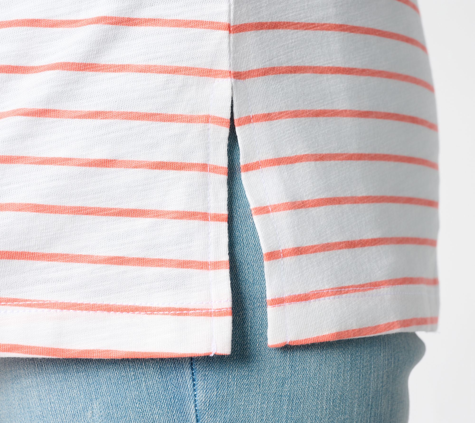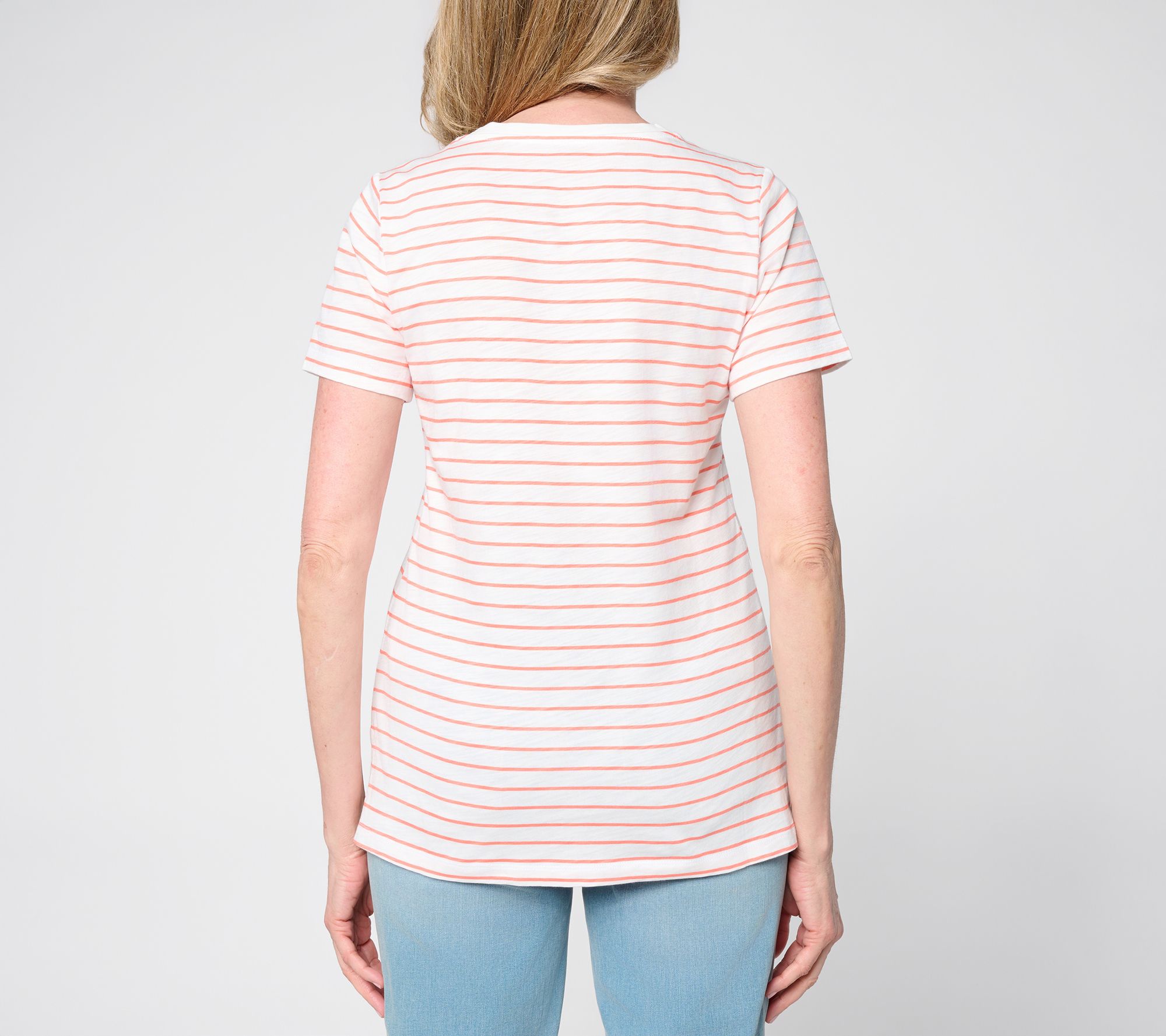 Versatility comes easy with this slub knit striped V-neck top, blending a sporty vibe with everyday comfort. Pair it with shorts for a laid-back afternoon or slip it under a blazer for a touch of easygoing polish -- the straight hem and short sleeves keep things relaxed while side slits add extra movement. From Belle by Kim Gravel.