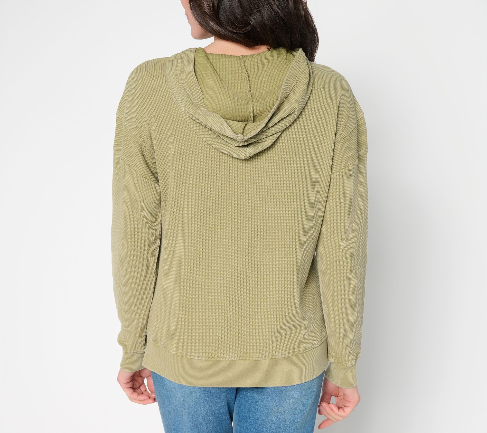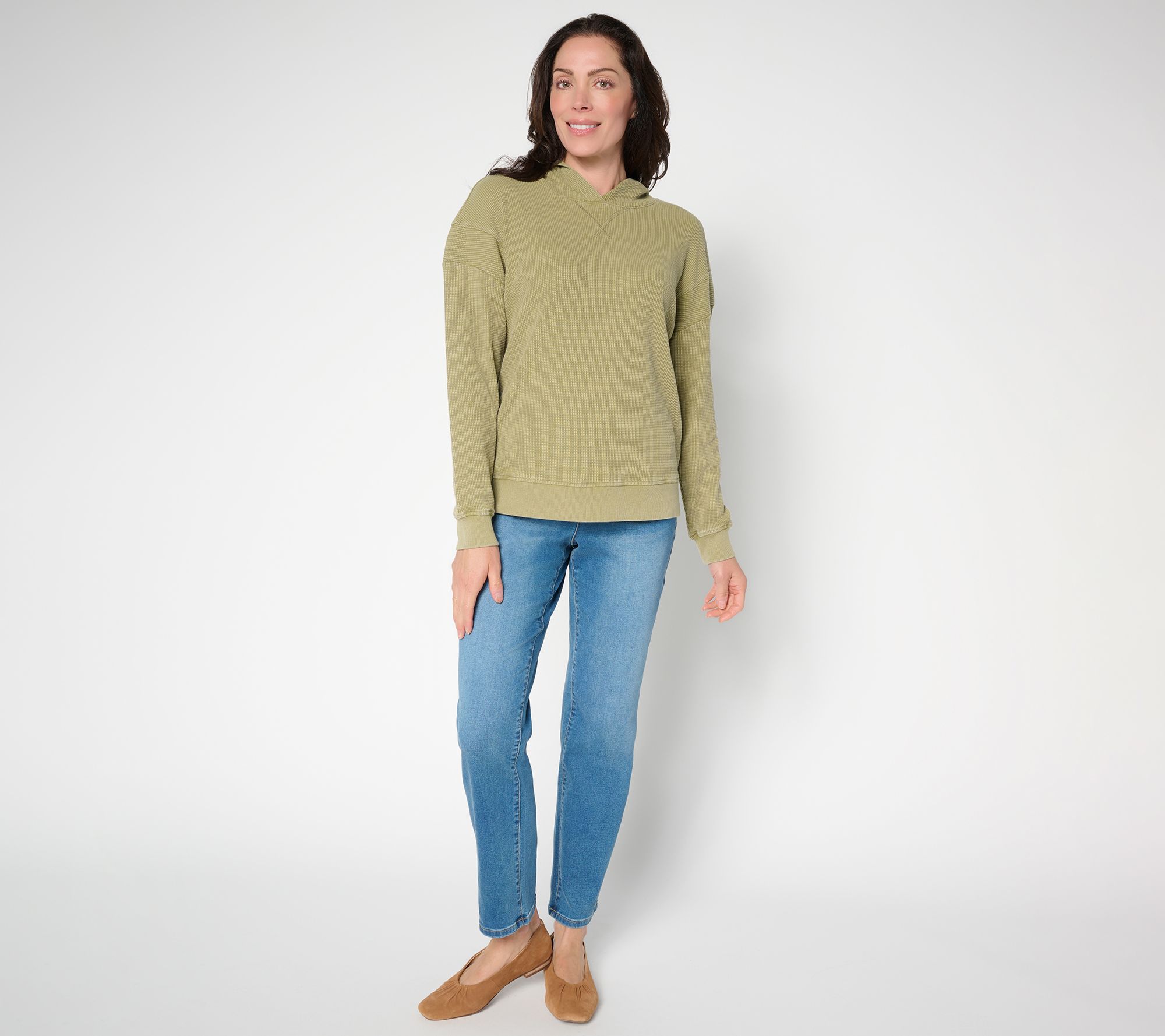 Slip into a snow-washed waffle hoodie that brings cozy comfort and a touch of vintage style to your day, whether you're layering up for errands or going for a casual stroll. The straight hem with side slits and soft-knit texture adds everyday appeal to jeans or leggings. From Belle by Kim Gravel.