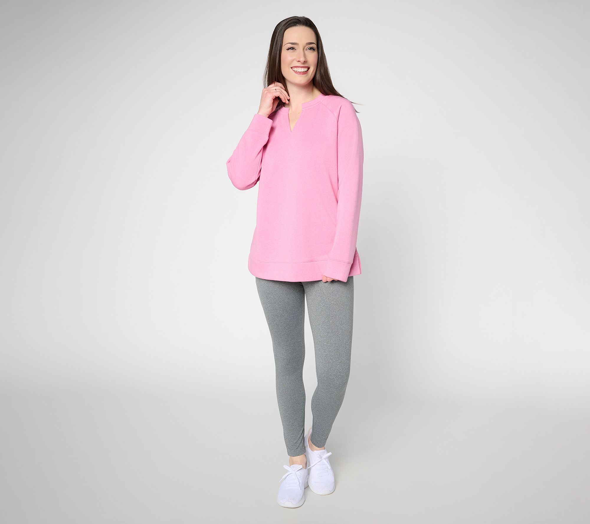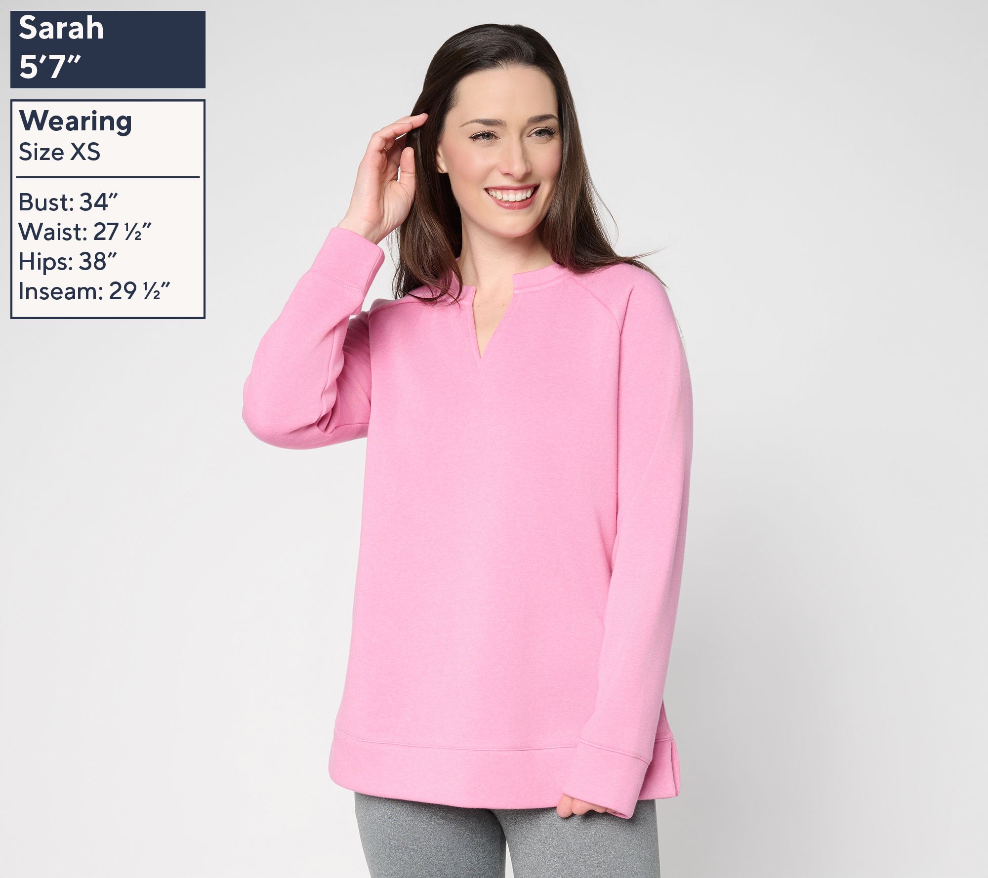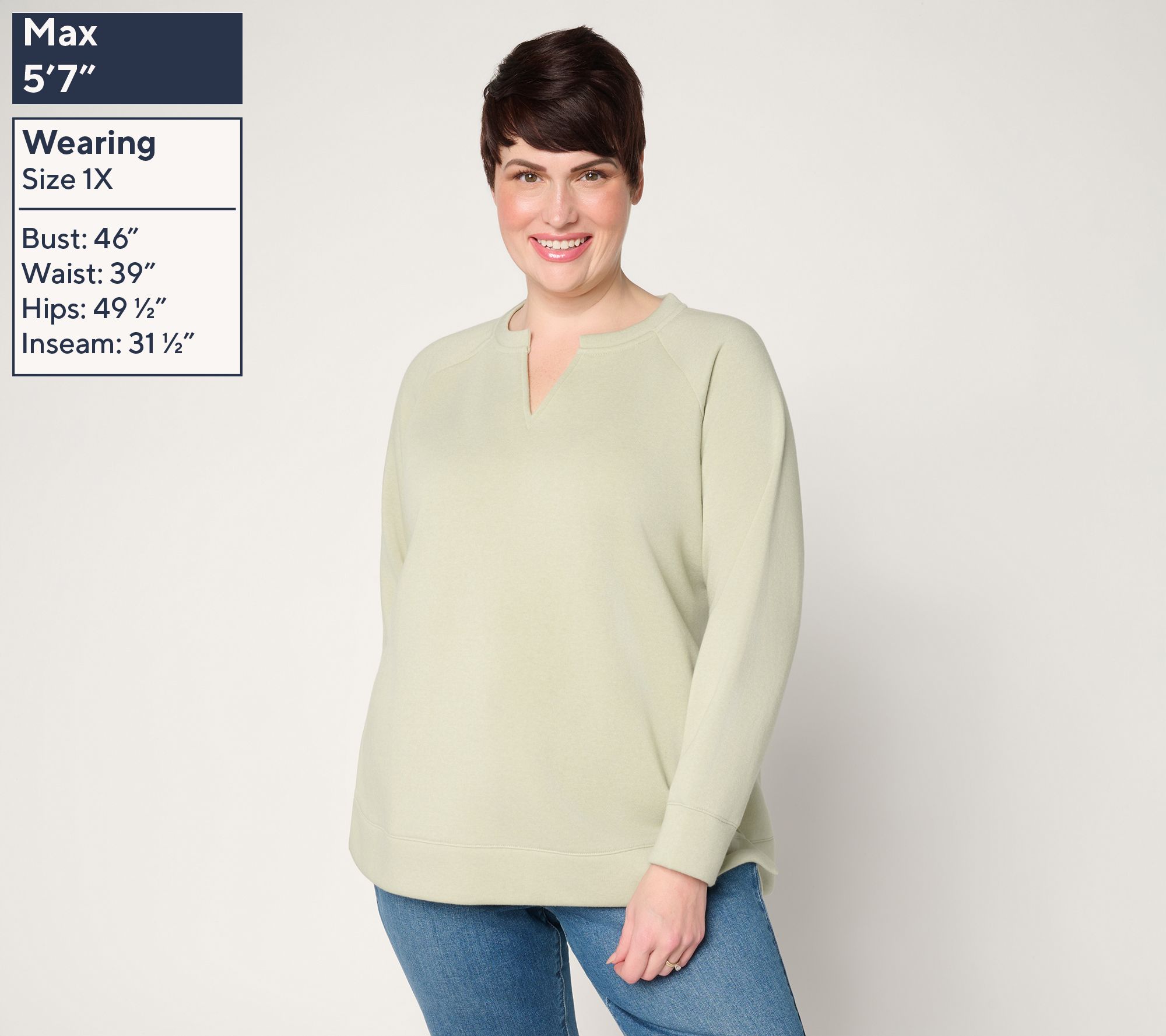 Morning commutes, casual meetups, and relaxed evenings all feel a little more inviting in this split-neck sweatshirt. Raglan sleeves and a soft sponge fleece keep you comfortable, while the cuffs and bottom band add laid-back structure for all your off-duty plans. From Belle by Kim Gravel.