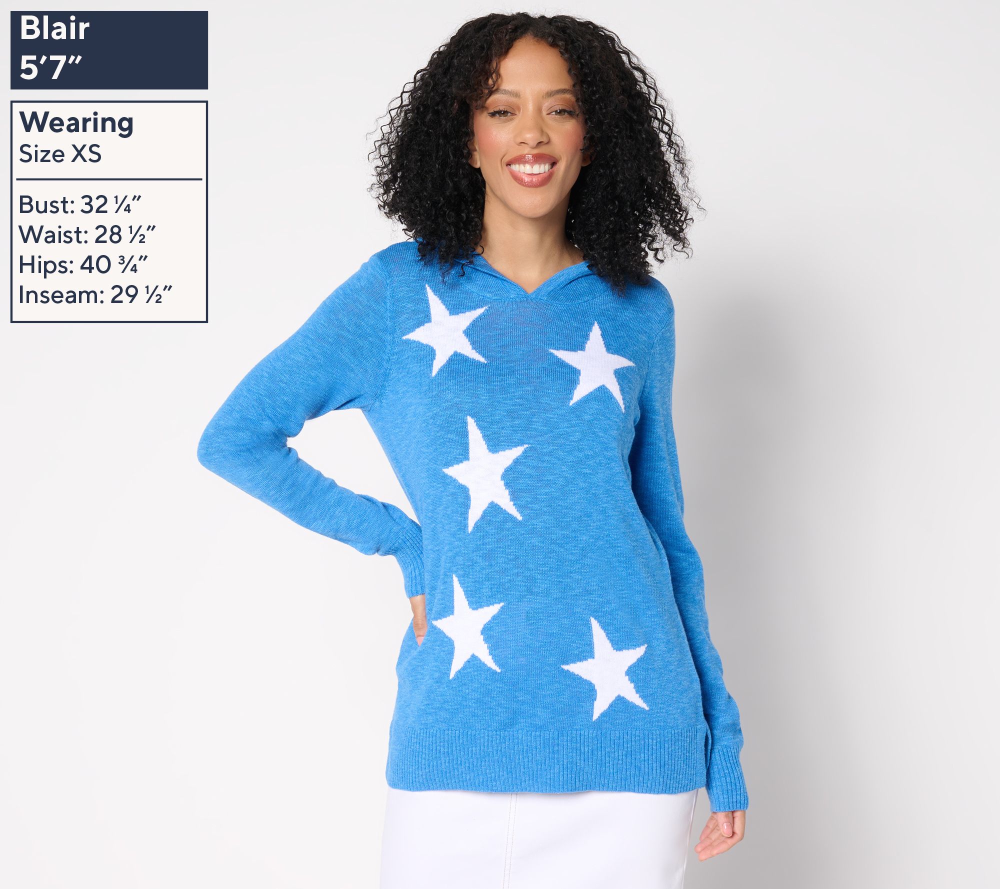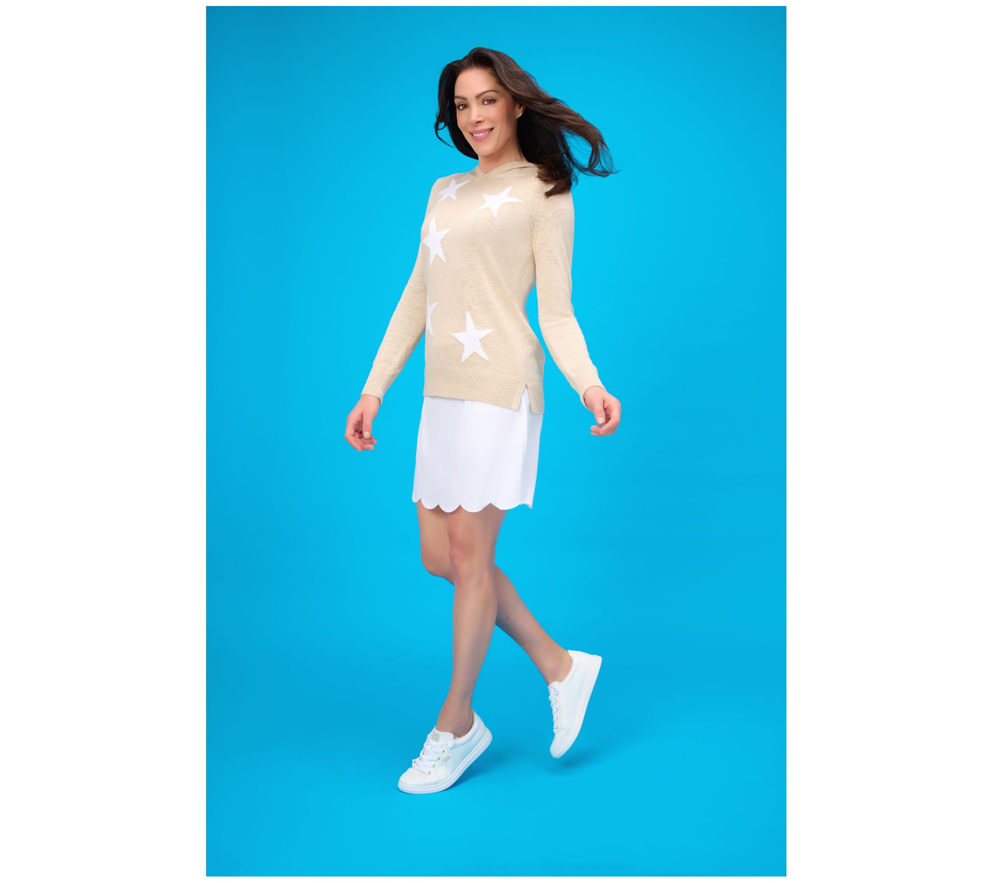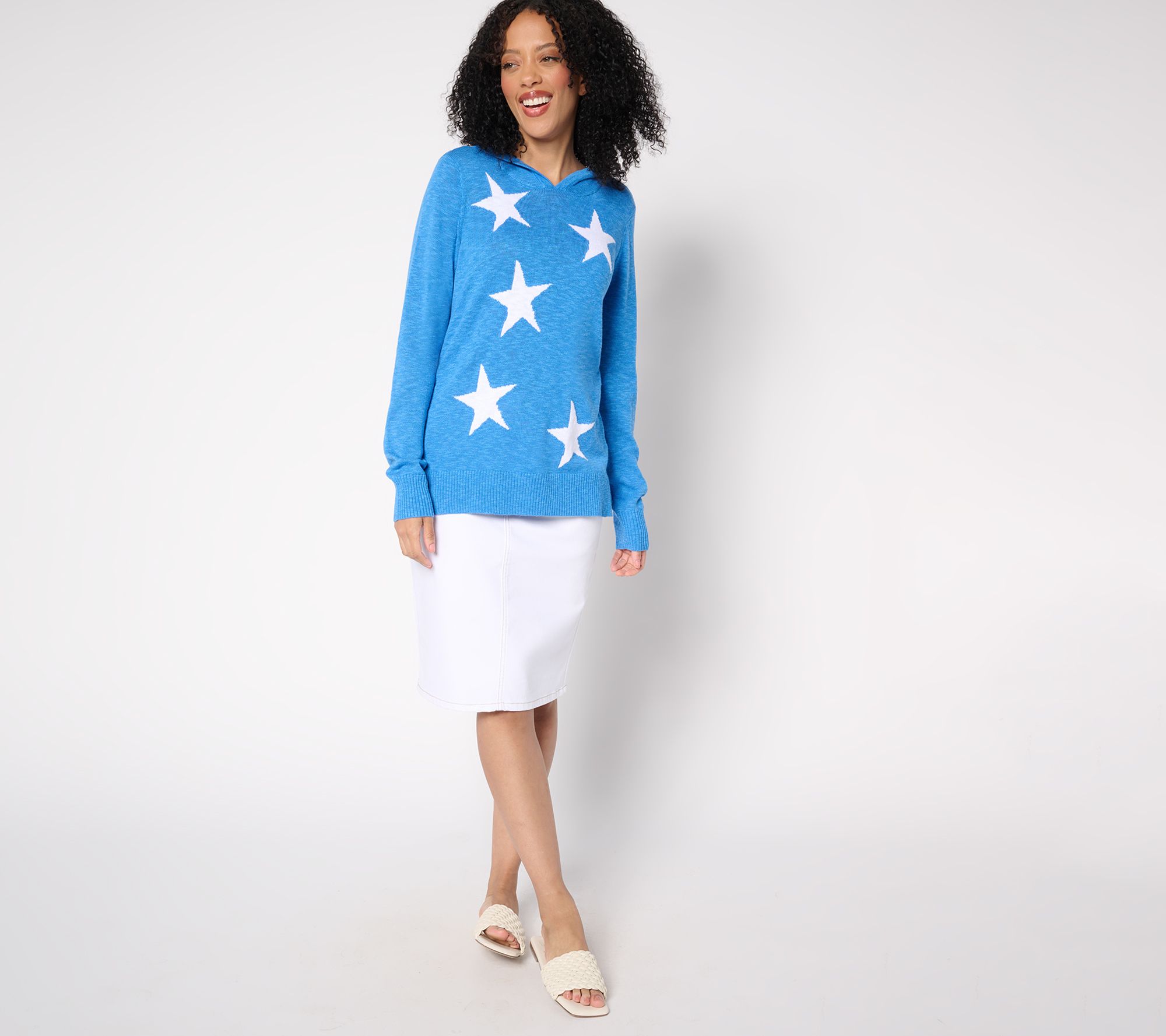 You'll have everyone starry eyed with this summery hoodie from Kim Gravel. Perfect for patriotic picnics, star-spangled celebrations, or evening strolls under the starry skies, it offers just the right amount of coverage without compromising on star power. From Belle by Kim Gravel.