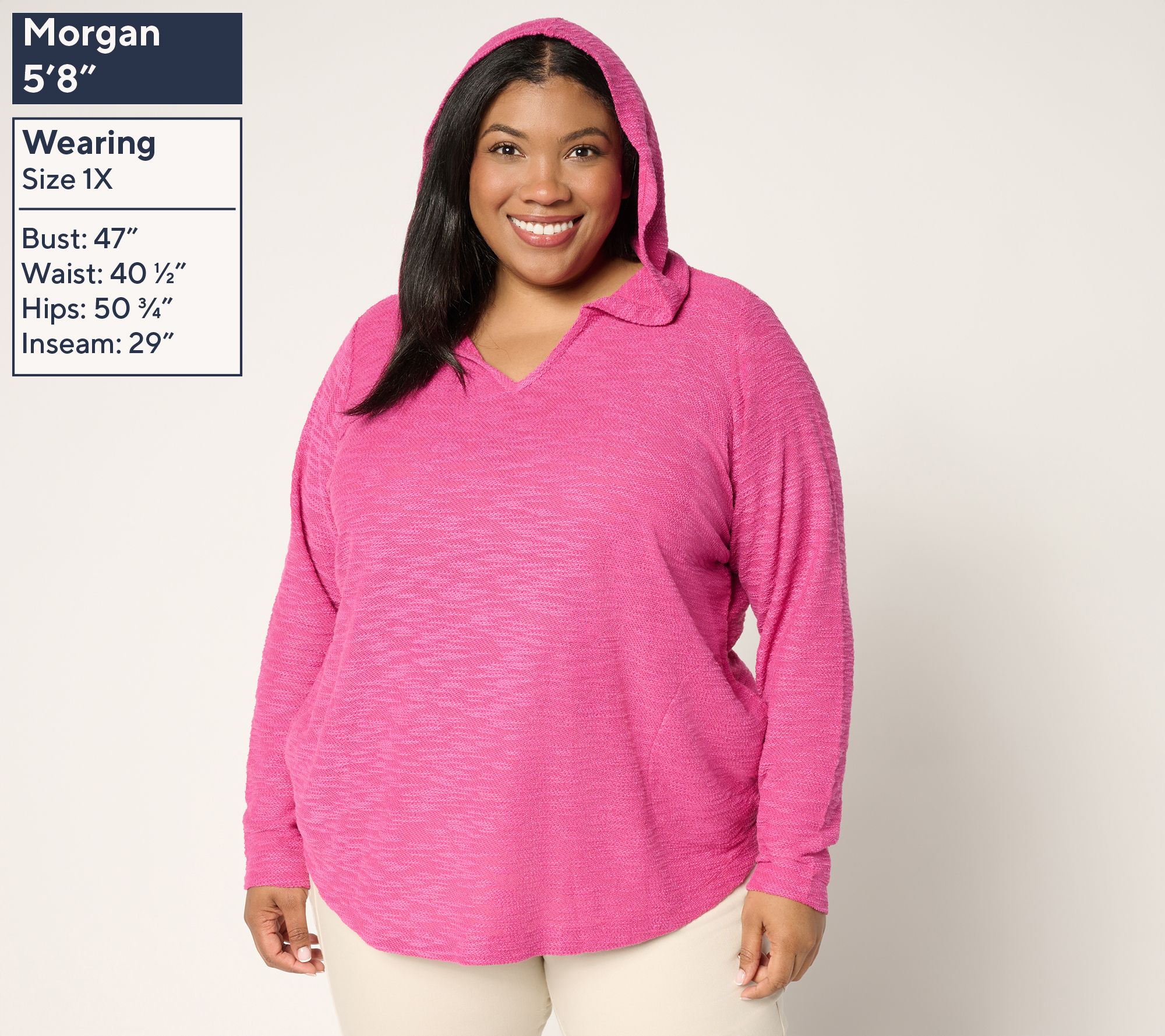 Here's a hooded sweatshirt that keeps casual days looking pulled together. The soft, slubby knit brings an easygoing vibe, while side pockets provide a place for your phone (or snacks). Try pairing it with your favorite joggers for laid-back outings or layer it over leggings for a comfy day at home. From Belle by Kim Gravel.