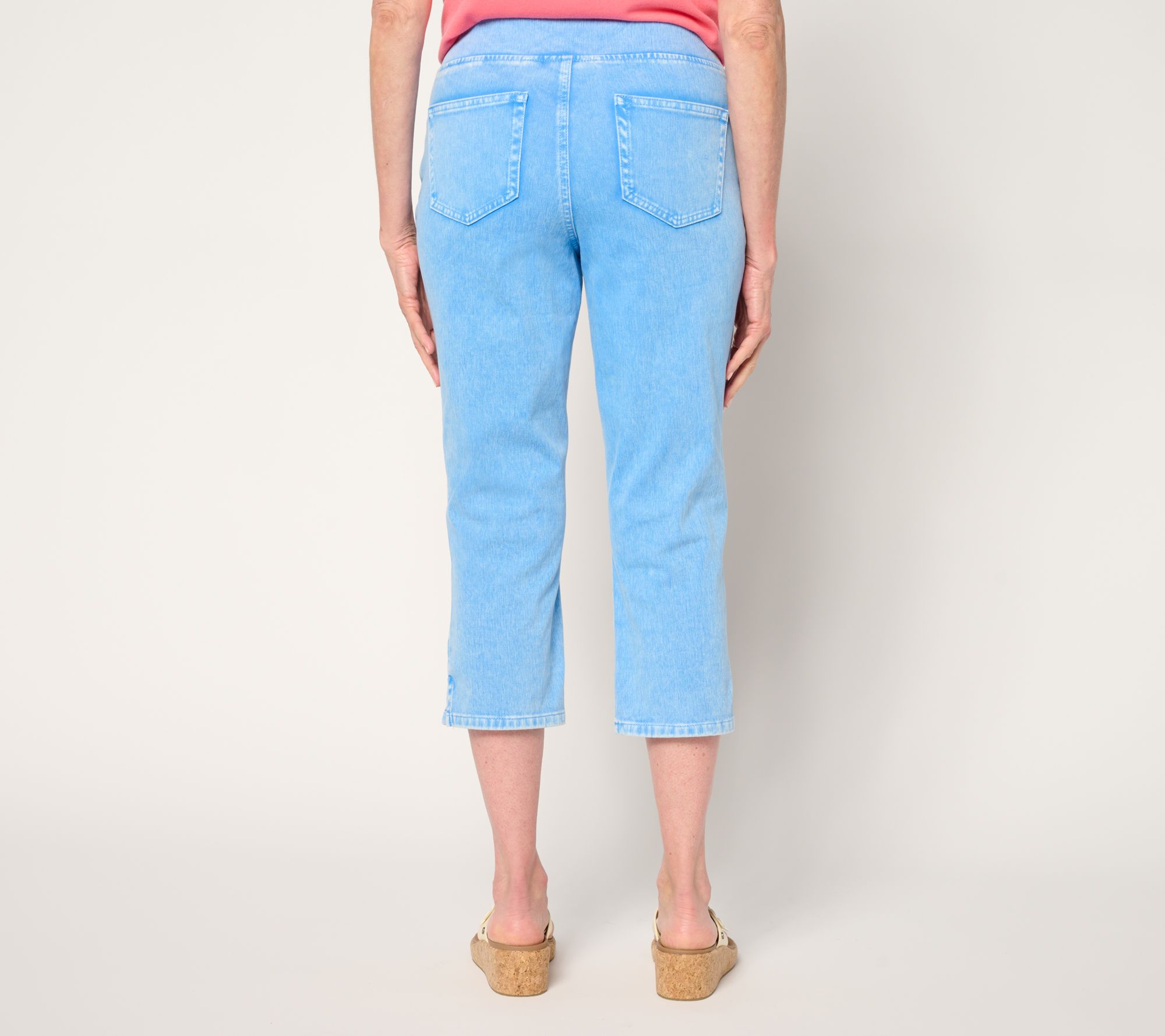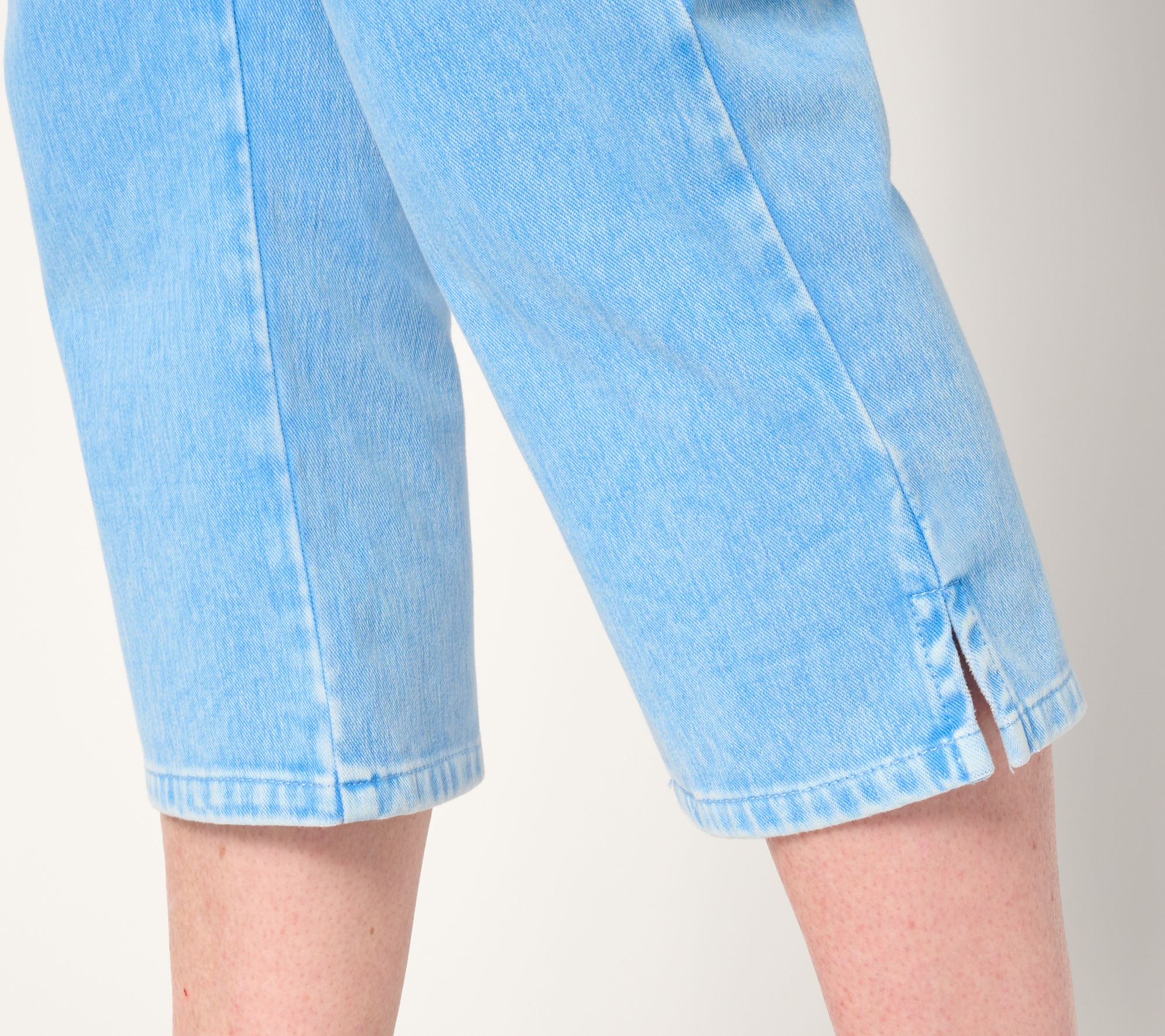 Soft and lightweight with a touch of stretch (your regular jeans don't recover like that!), Delray denim is a yarn-dyed fabric with an acid wash you'll adore this spring and summer. Pair the carefree pull-on design with a light sweater on those breezy beach nights or a crisp blouse and wedges when you're headed to dinner. And yes, they also partner effortlessly with all your tanks, tees, and tunics. No matter how you wear them, you'll find yourself wishing you had these comfy capris in every color because they're... Just. That. Fabulous. From Belle by Kim Gravel.