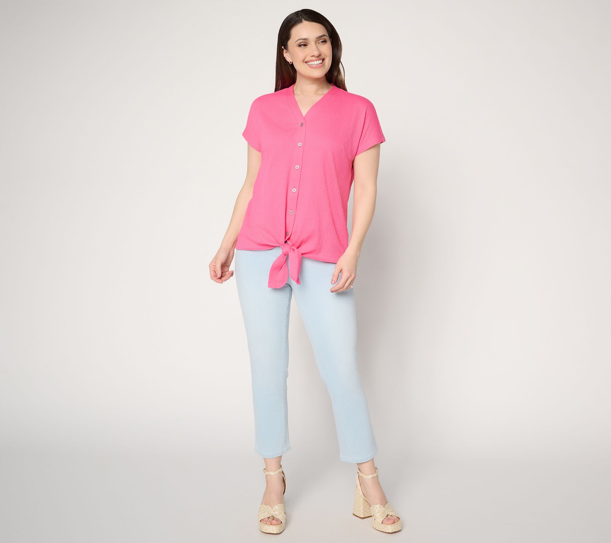 Undeniably flattering with a fitted silhouette, these pull-on crops are made even better thanks to the TripleLuxe Denim fabrication that combines cotton (for comfort), spandex (for figure-hugging stretch), and modal (for another layer of smooth softness). And the straight leg pairs perfectly with wedge sandals when you're feeling flirty, sweet sneaks when you're on your feet, and simple flats for just about any occasion. Your new favorite jeans -- a special delivery coming your way! From Belle by Kim Gravel.