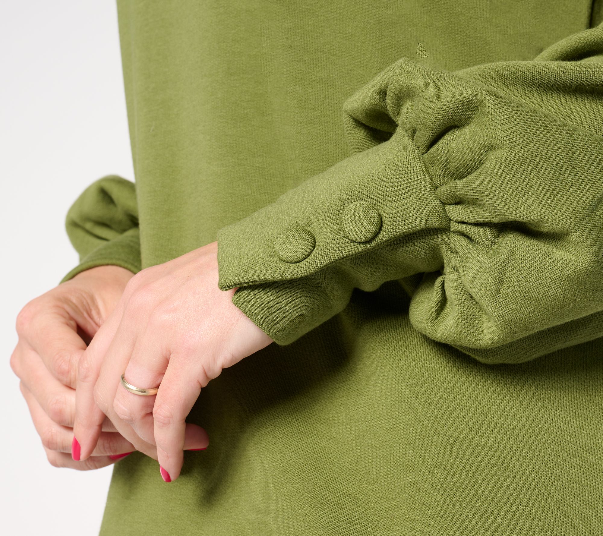 Features: long blouson sleeves with self-covered buttons, crew neckline, hi-low hem