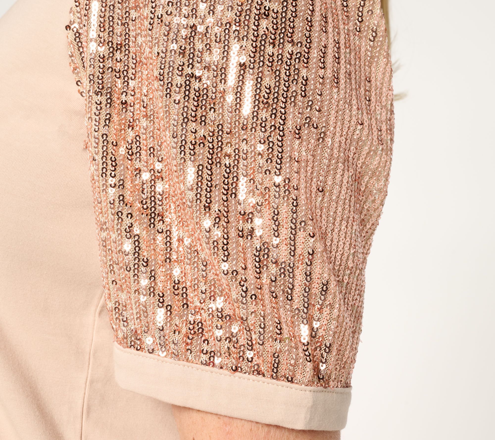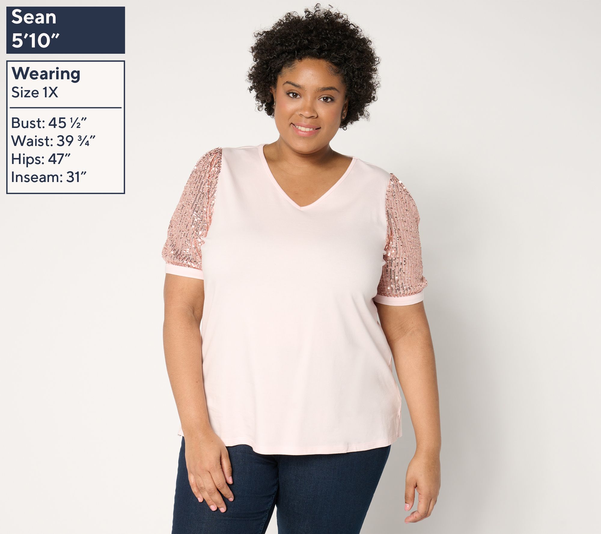 Sparkle and shine don't stop at seasonal 'fits! Bring the glam anytime the mood suits with this TripleLuxe knit puff sleeve top, accented with shimmering sequins to top off year-round party-ready looks. From Belle by Kim Gravel.