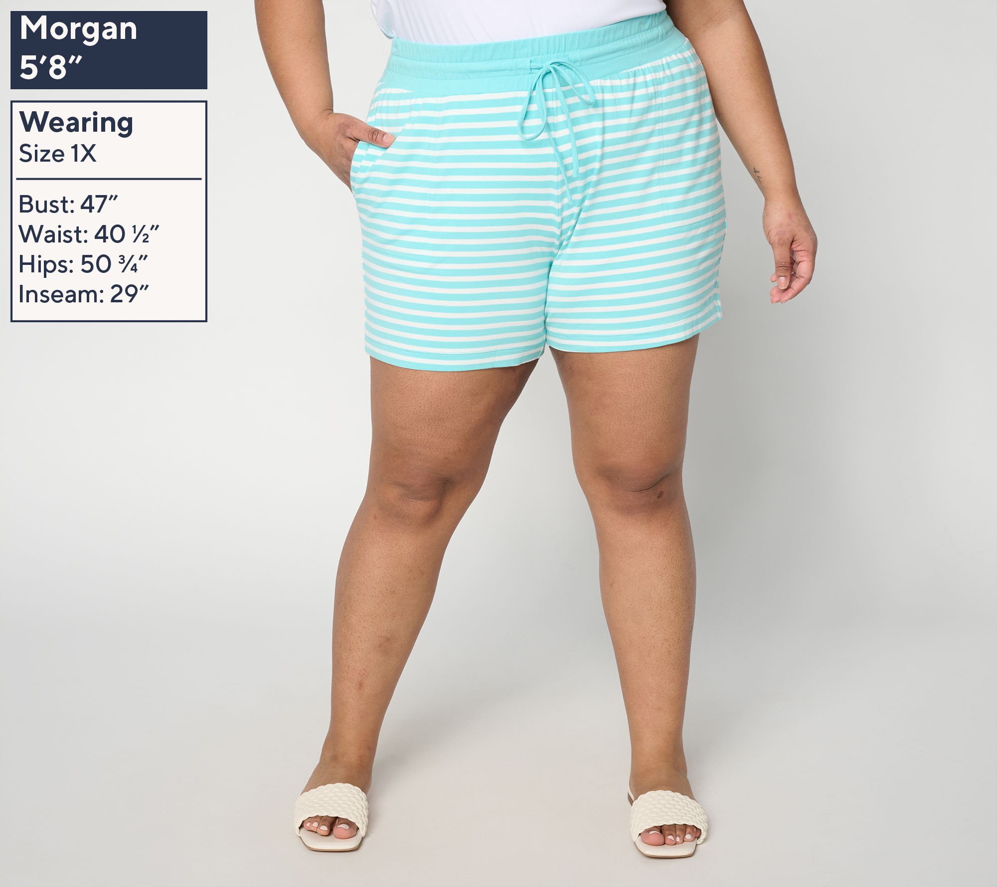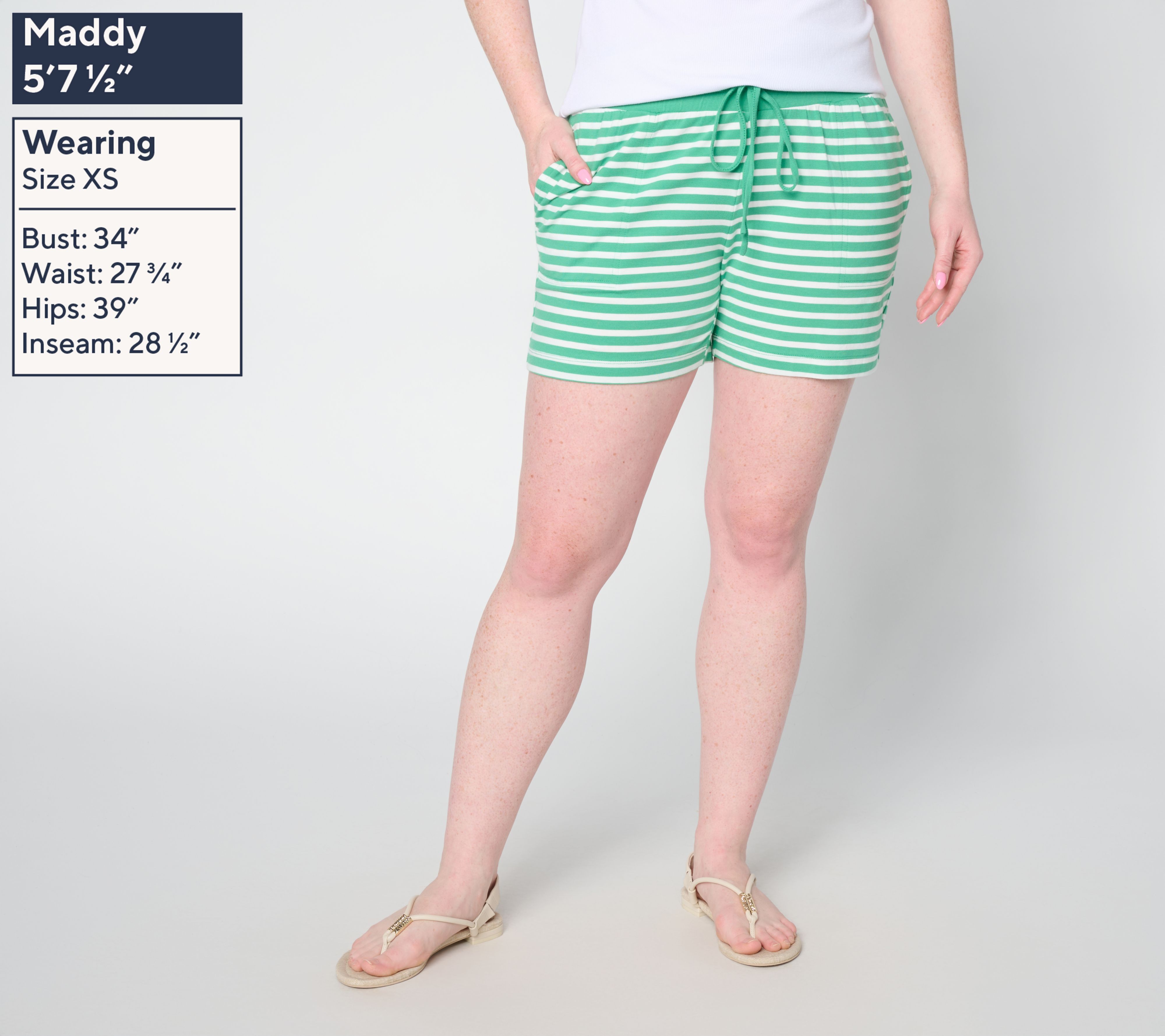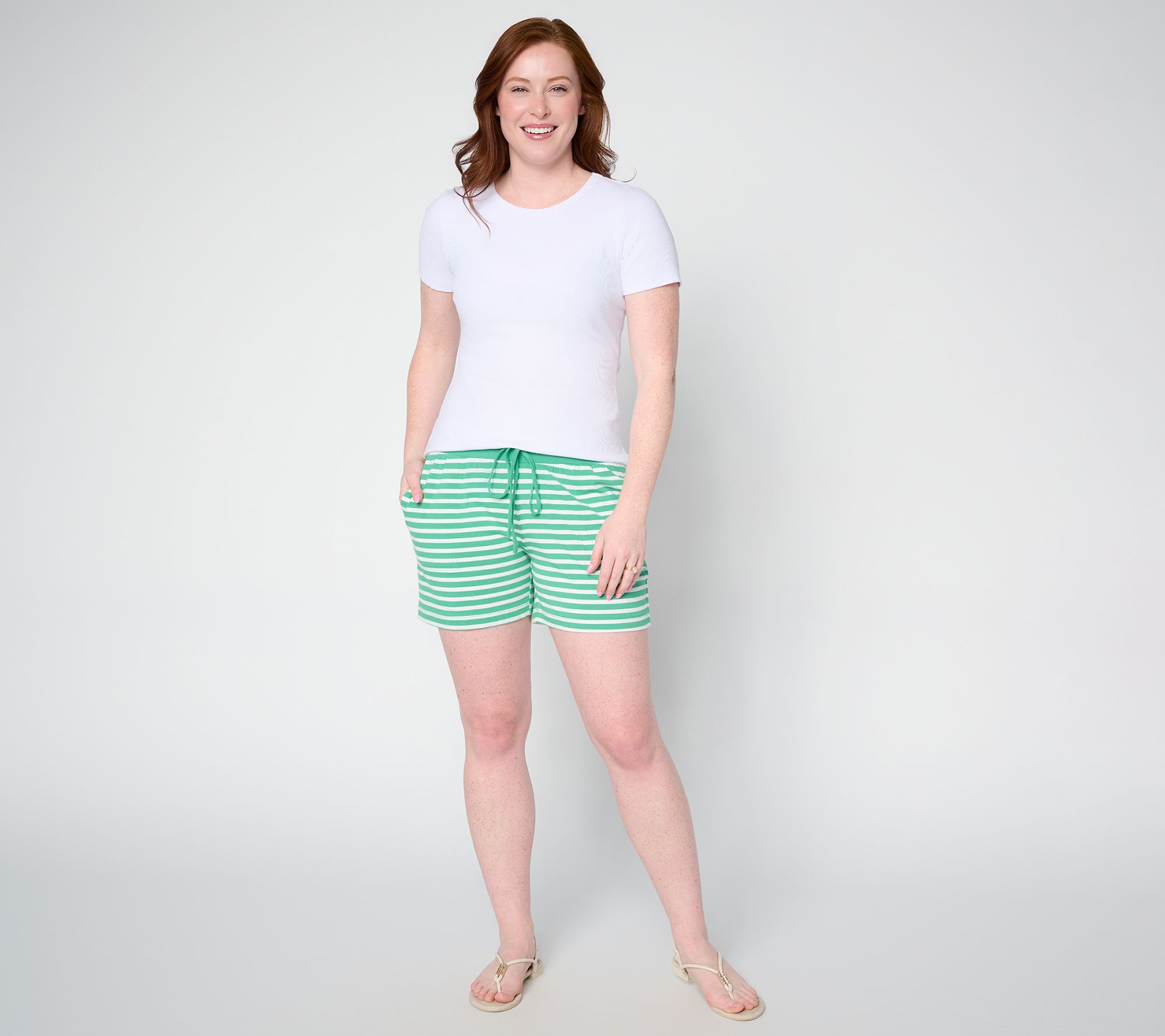 Morning strolls or lunch on the patio get a stylish upgrade with these knit shorts, crafted in a striped pattern that brings playful energy to casual plans. A drawstring waistband and soft, stretch-infused TripleLuxe fabric work together for comfort that lasts as you run errands or relax at home. From Belle by Kim Gravel.