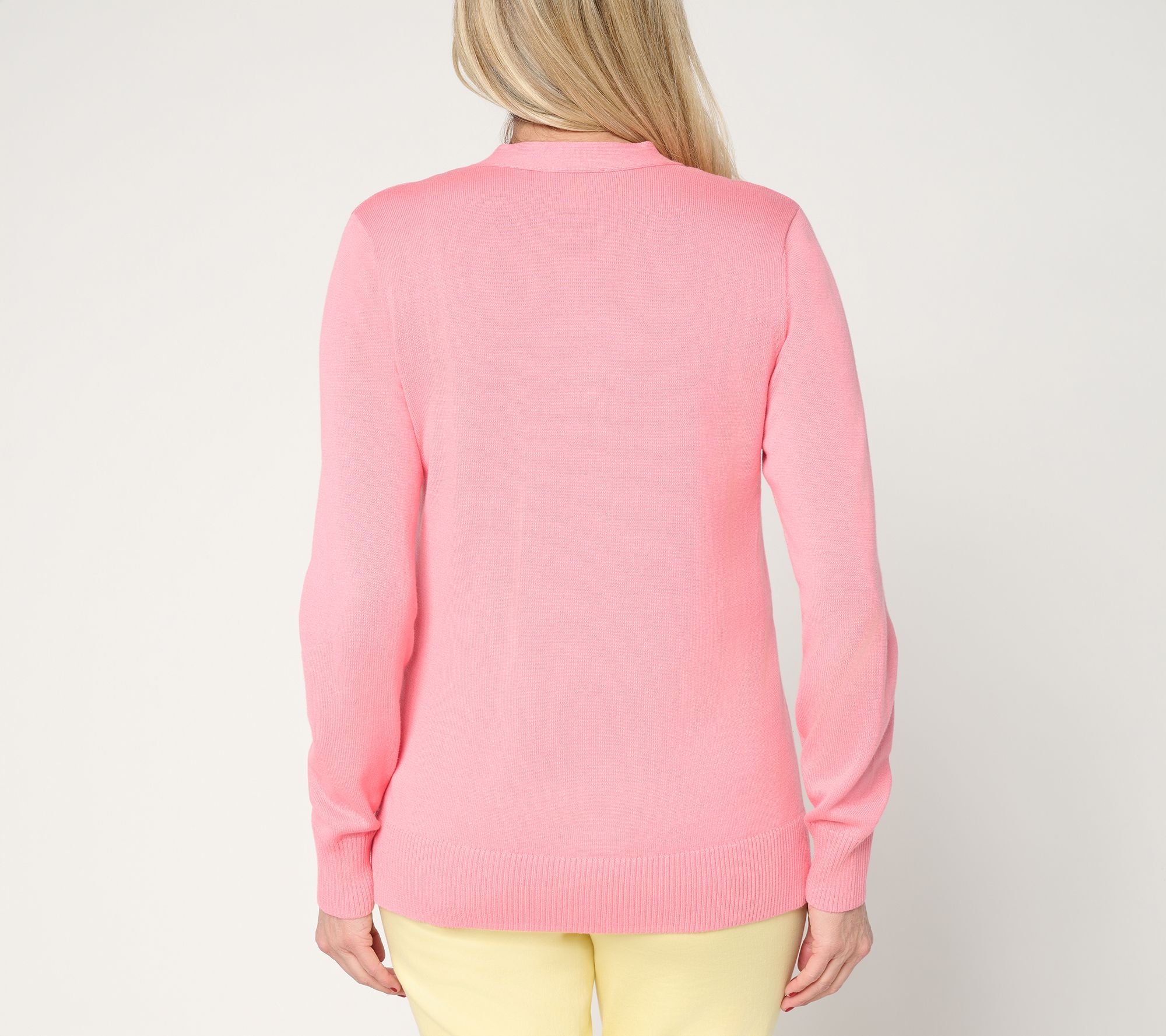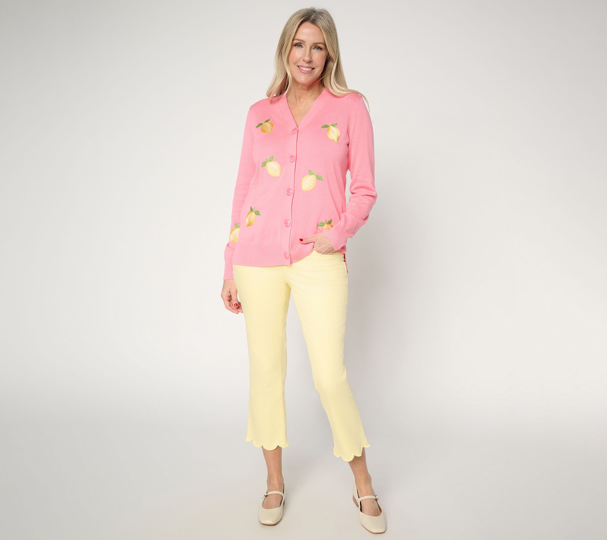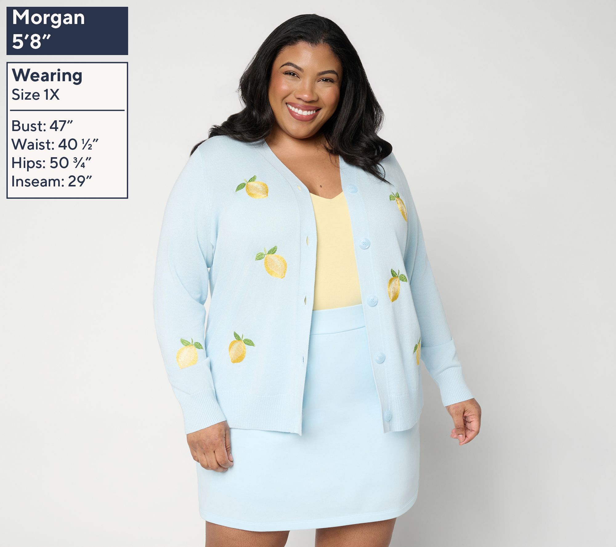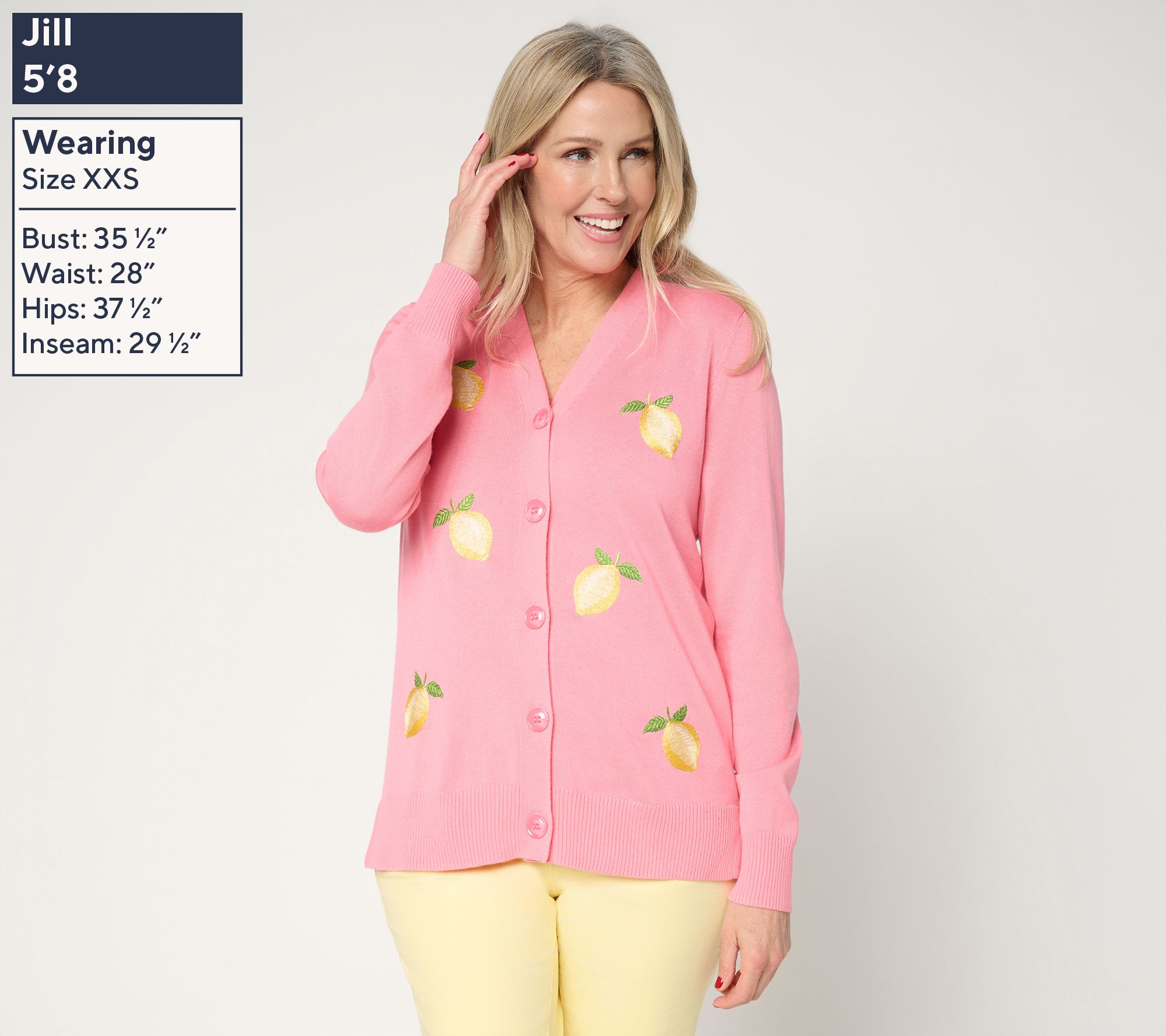 A juicy pick. Add this zesty, citrus-inspired cardi to your springtime layering collection. Squeeze every ounce of fun out of the lemon-peppered pattern that brings a fresh, sunny twist to any 'fit. From Belle by Kim Gravel.