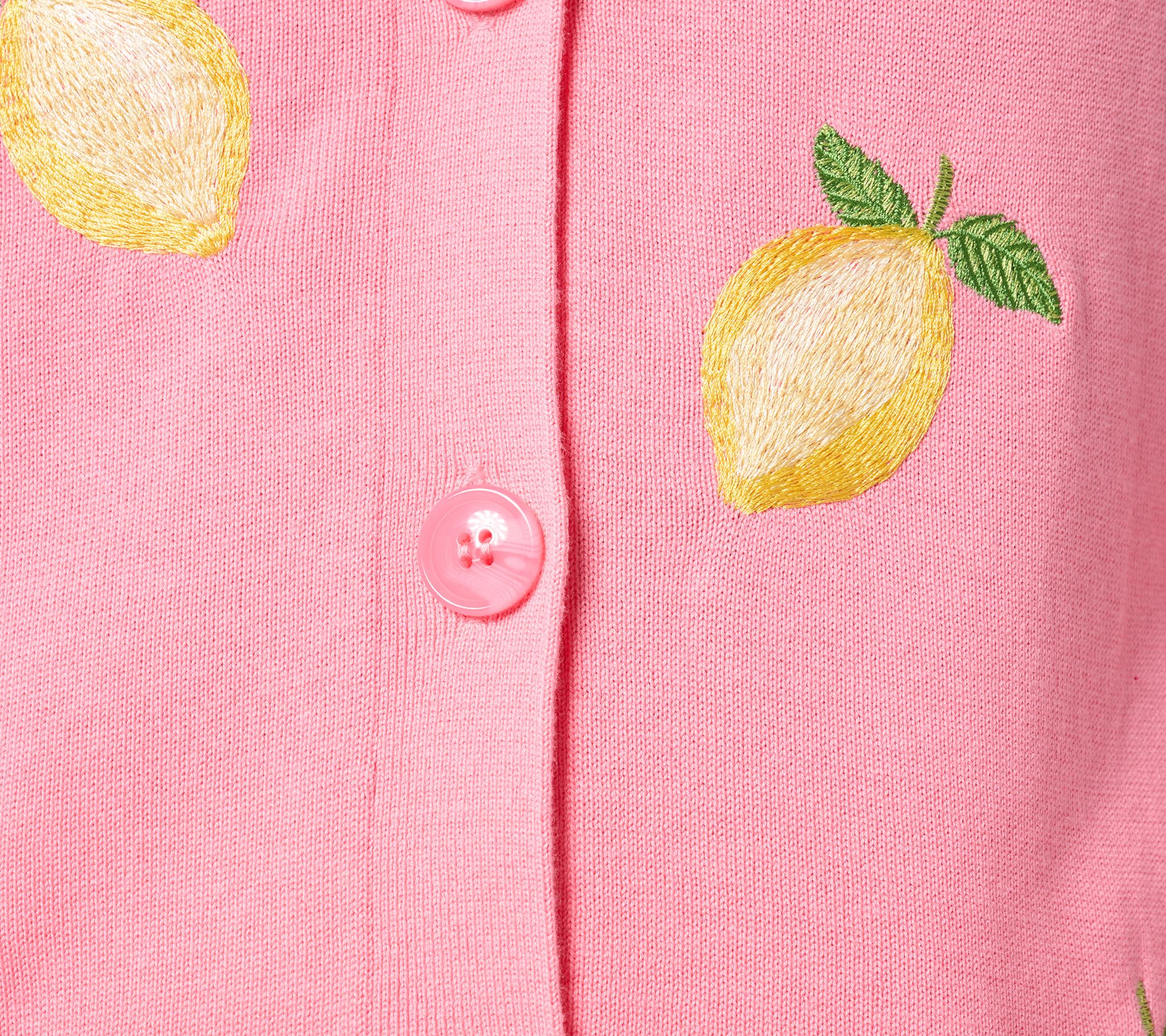 Features: V-neck, button-front closure, long sleeves, ribbed cuffs and bottom band, scattered lemon design