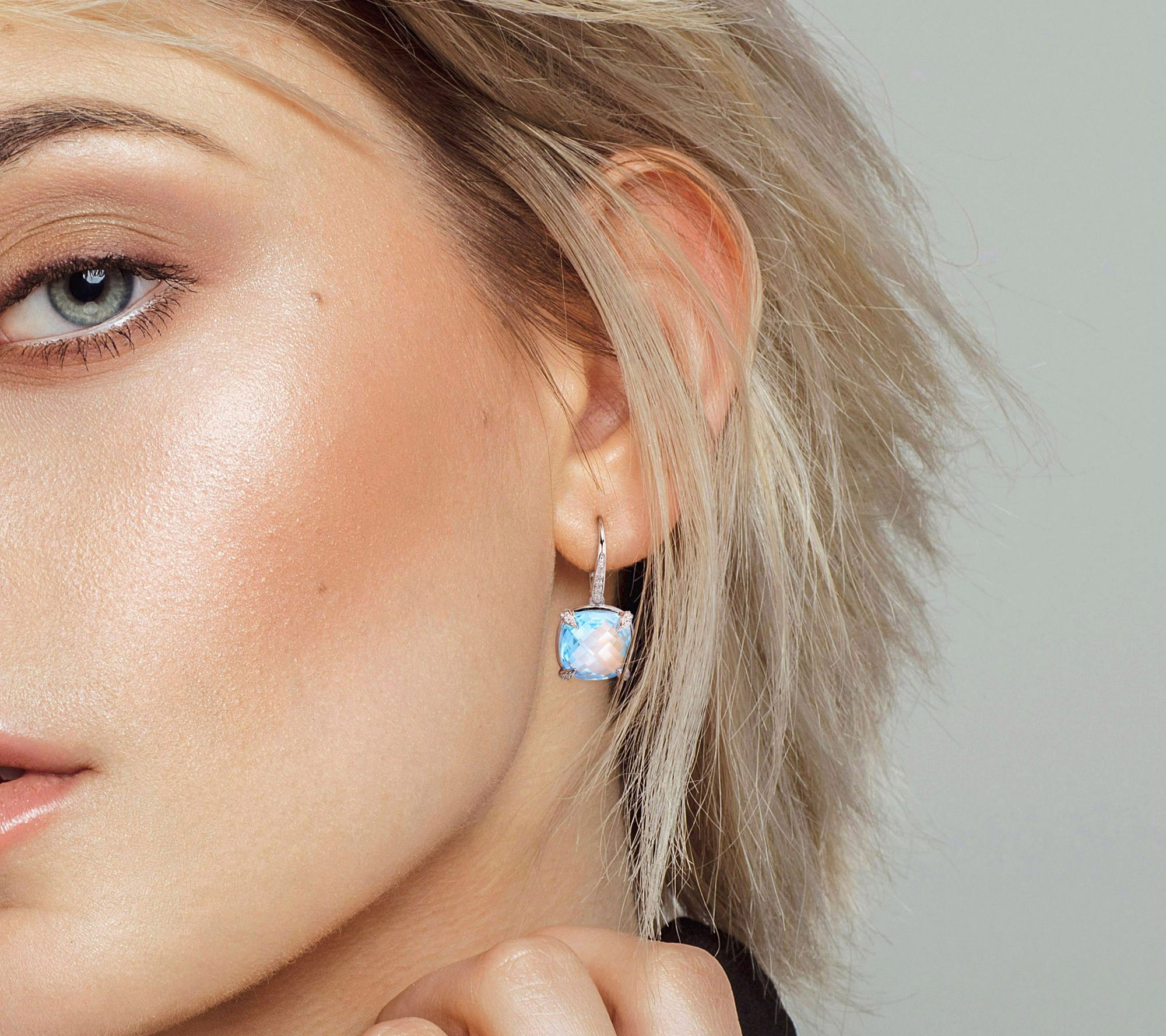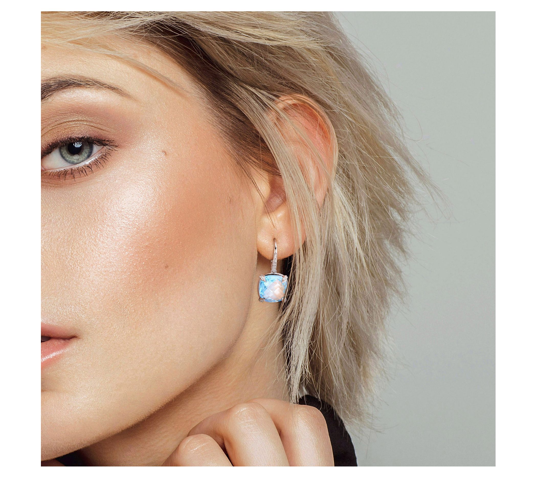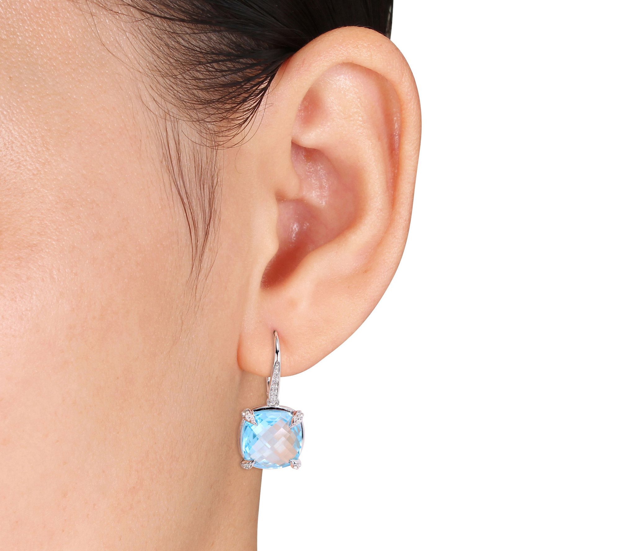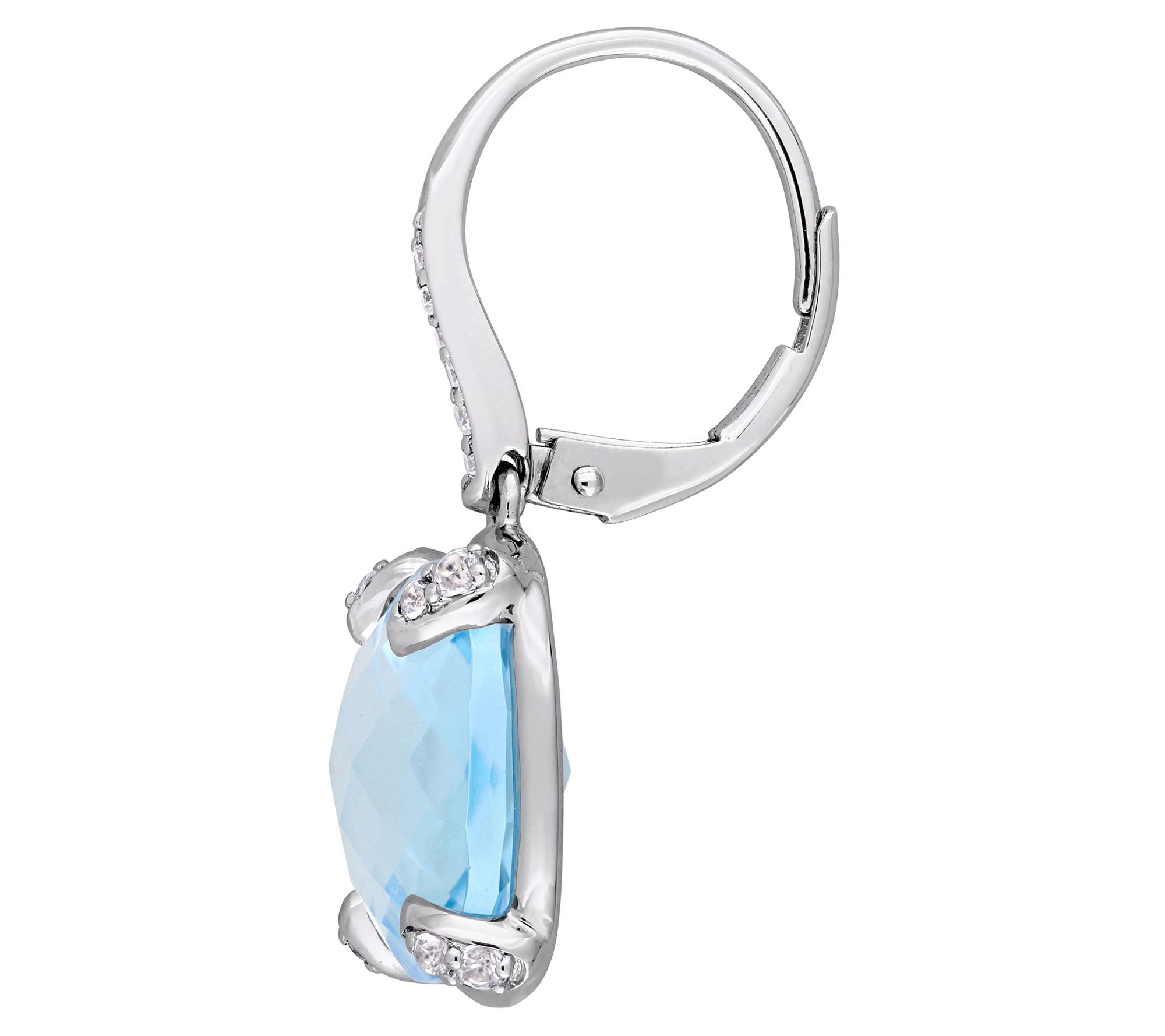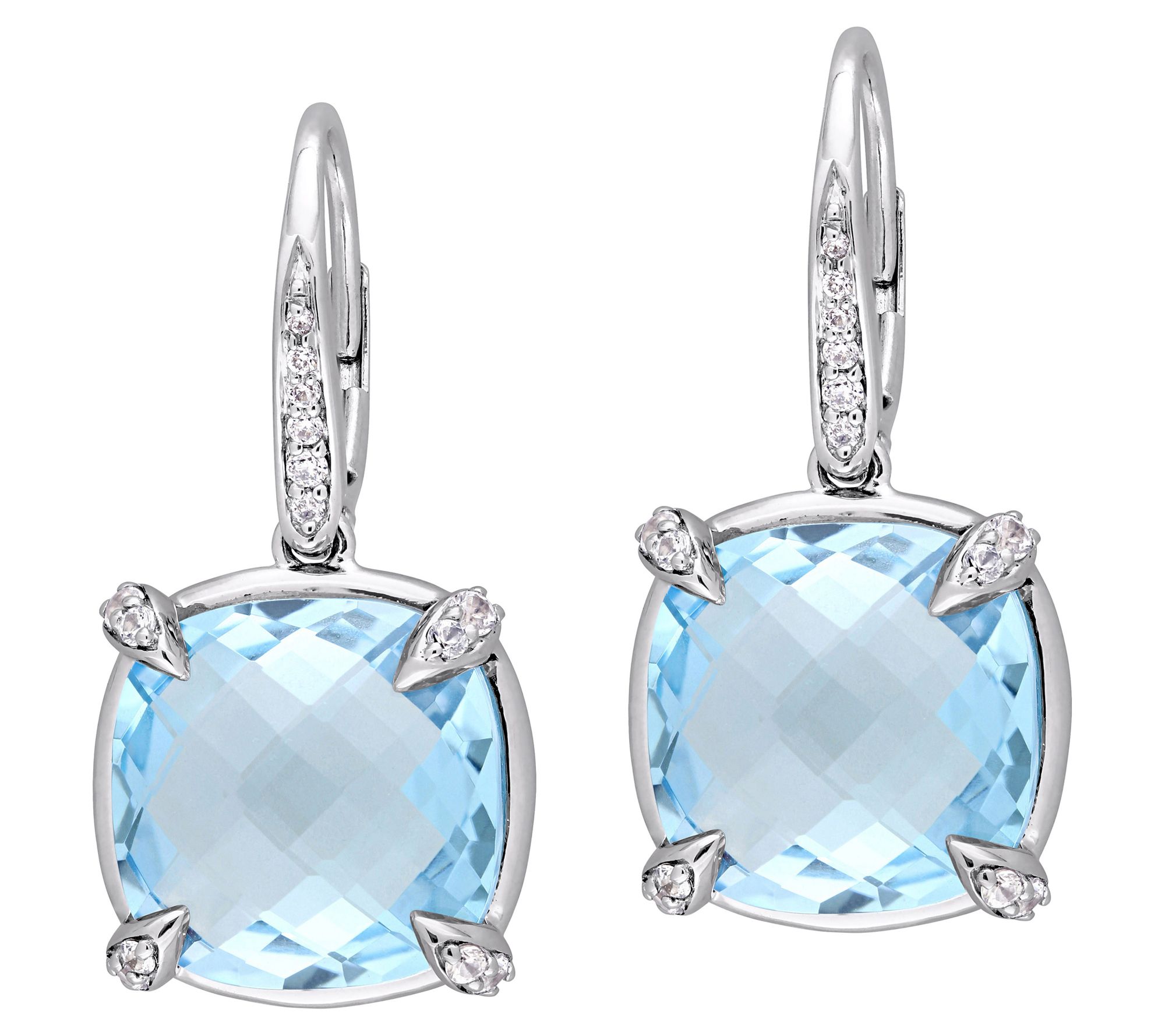 Dangle earrings with cushion, double checkerboard-cut, prong-set blue topaz and round, pave-set white sapphires; round, pave-set diamonds; polished finish