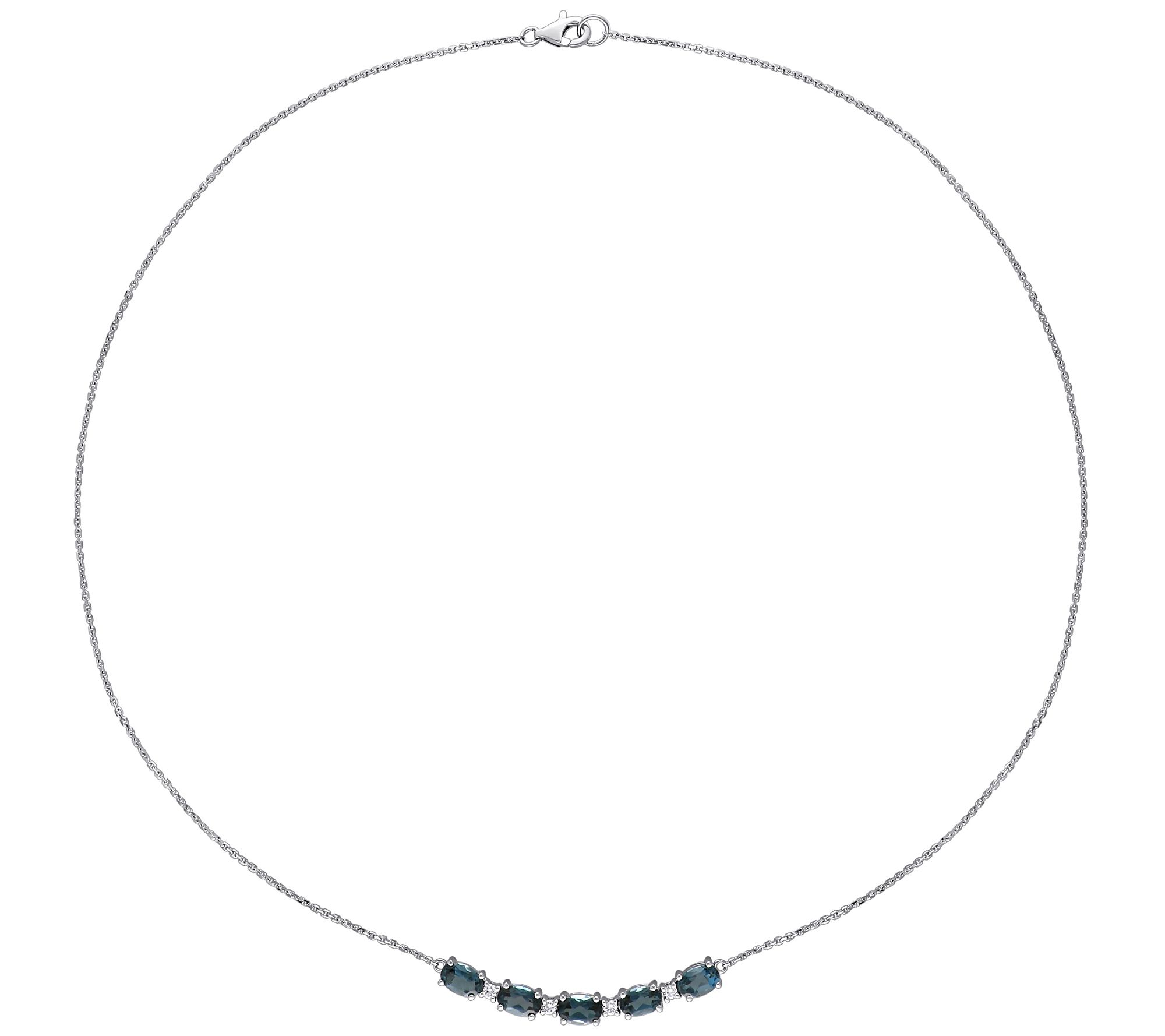 • Cable link chain; five prong-set, oval London blue topaz that alternate with round, prong-set diamonds; polished