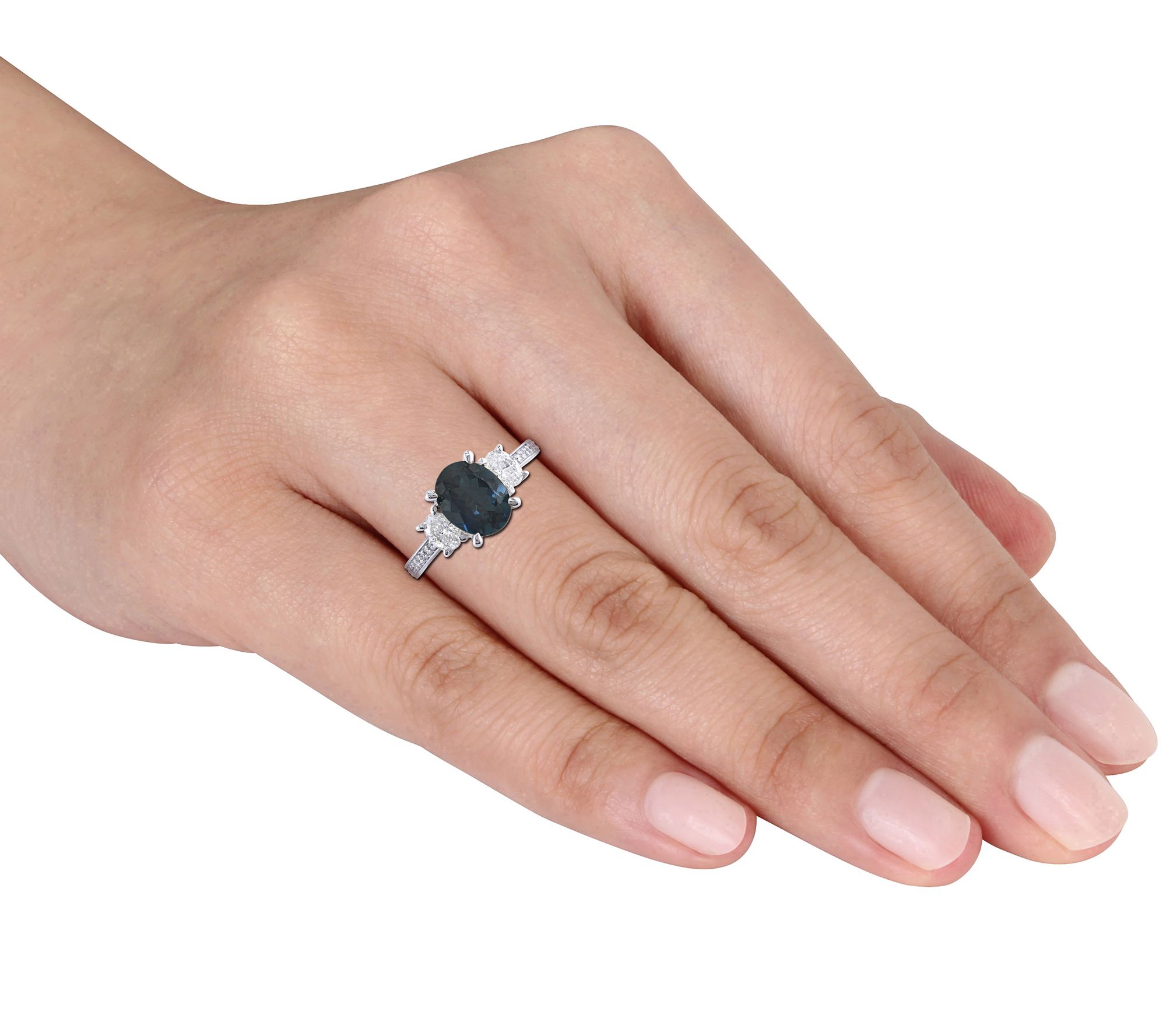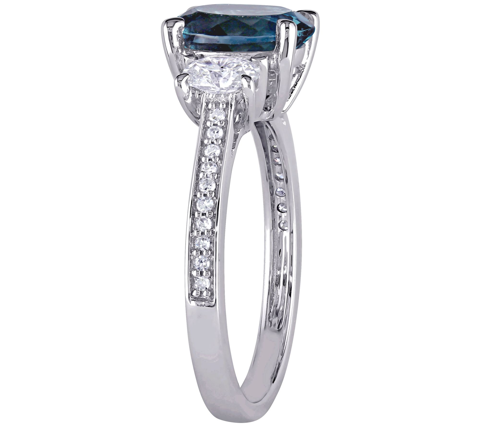 - Oval-cut, prong-set London blue topaz with oval, cut, white diamonds on either side; round, white diamonds on band