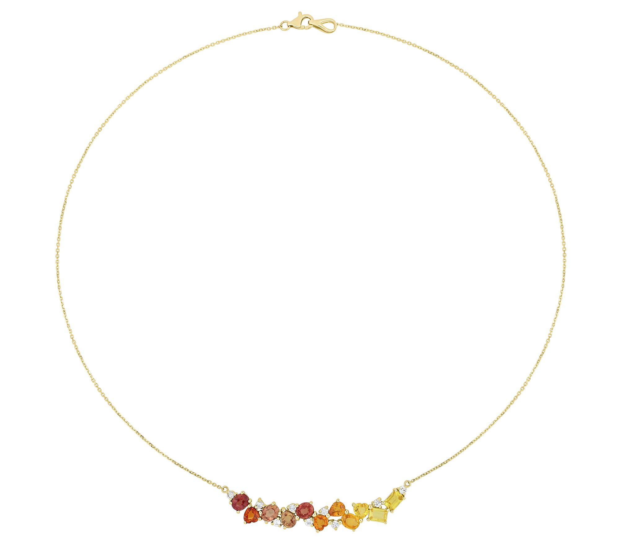 A sapphire sunburst of yellow and orange gemstones define this breathtaking 14K gold necklace.